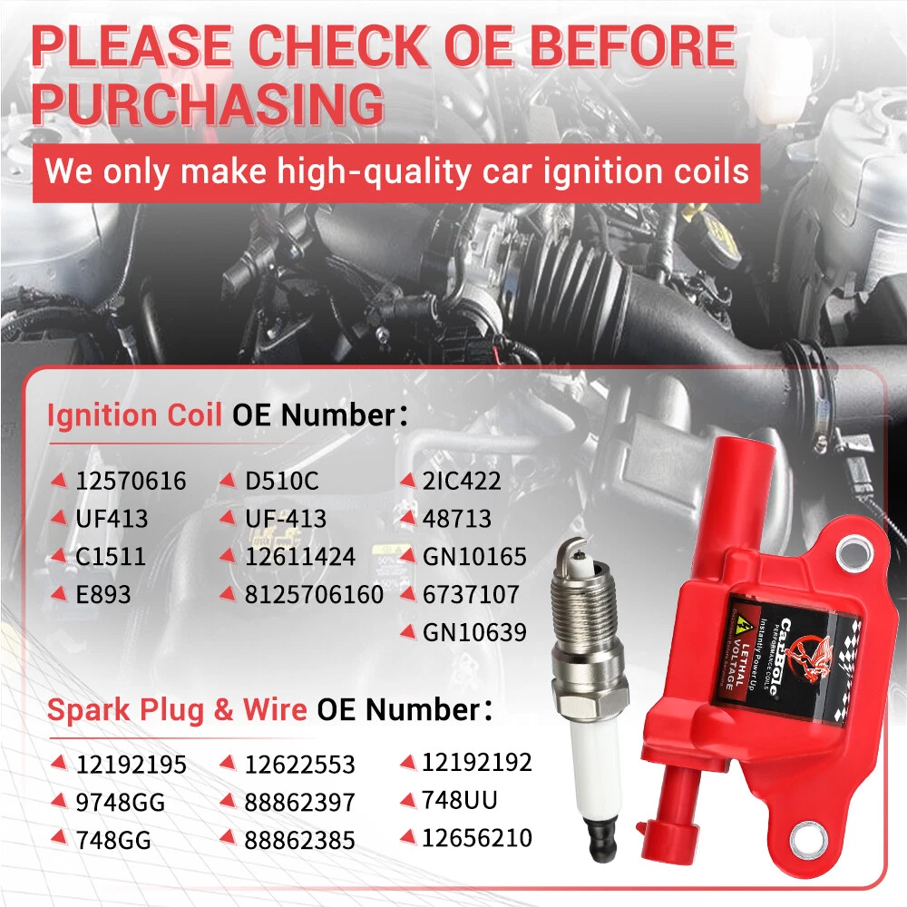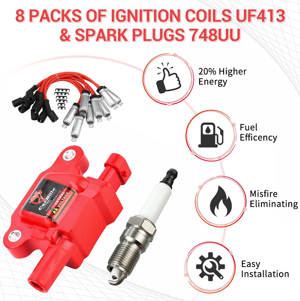 Description: Our ignition coils offer value without compromising quality. They can convert the power of your vehicle from 12 volts to more than 25,000 volts. Helps ensure proper engine performance, maximize fuel economy, minimize both tailpipe emissions and RFI electronic interference Helps avoid spark plug failure, drivability complaints, pre-ignition and detonation Details: Automotiveparts_aa Best choice of motor parts 8xHigh Performance Ignition Coil+Spark Plug+Wire For Chevy GMC 5.3/6.2L V8 UF413 Description : Our ignition coils offer value without compromising quality. They can convert the power of your vehicle from 12 volts to more than 25,000 volts. Helps ensure proper engine performance, maximize fuel economy, minimize both tailpipe emissions and RFI electronic interference Helps avoid spark plug failure, drivability complaints, pre-ignition and detonation Details: 100% Brand New Items, Never Used Or Installed High quality Proper alignment, positioning and spacing for faster, easier installation Designed to meet or exceed specifications in form, fit and function High quality components and materials Superior performance and reliability Features: 1) All parts are hand inspected off the line before packaging and once again by our team before shipment. 2) According to the original factory specifications. Superior performance and reliability 3) Easy installation. 4) High quality components and materials. Stable characteristics, high reliability. 5)High quantity product for factory 6)Easy to install, direct fits 7)A perfect replacement for your original part 8)Condition: Brand New 9)Fitment Type:Direct Replacement Specifications: Color:Red Connector: 4 Pins Connector Gender: Female Terminal Gender: Male Terminal Type: Blade Voltage: 12V Ignition coil Part Numbers: 12570616, UF413 , E893, D510C , UF-413, 12611424, 8125706160 Spark Plugs Part Numbers: 19299585,41-962 Wires Set Part Numbers: 12192195 9748GG 748GG 12622553 88862397 12192192 7873 Fitment: Fits for the GM, Hummer, & Isuzu 8 cylinder engines: V8 4.8L, 5.3L, 6.0L, 8.1L Fits for Square style Coil Does not fit round style 2008-2008 Buick Allure 5.3L-V8 2008-2009 Buick LaCrosse 5.3L-V8 2006-2007 Buick Rainier 5.3L-V8 2006-2007 Cadillac CTS 6.0L-V8 2009-2015 Cadillac CTS 6.2L-V8 2007-2016 Cadillac Escalade 6.2L-V8 2009-2013 Cadillac Escalade 6.0L-V8 2007-2016 Cadillac Escalade ESV 6.2L-V8 2007-2013 Cadillac Escalade EXT 6.2L-V8 2010-2015 Chevrolet Camaro 6.2L-V8 2009-2012 Chevrolet Colorado 5.3L-V8 2005-2007 Chevrolet Corvette 6.0L-V8 2006-2013 Chevrolet Corvette 7.0L-V8 2008-2013 Chevrolet Corvette 6.2L-V8 2006-2009 Chevrolet Impala 5.3L-V8 2007-2007 Chevrolet Monte Carlo 5.3L-V8 2007-2013 Chevrolet Silverado 1500 5.3L-V8 2007-2013 Chevrolet Silverado 1500 4.8L-V8 2007-2013 Chevrolet Silverado 1500 6.0L-V8 2009-2013 Chevrolet Silverado 1500 6.2L-V8 2008-2016 Chevrolet Silverado 2500HD 6.0L-V8 2008-2016 Chevrolet Silverado 3500HD 6.0L-V8 2007-2014 Chevrolet Suburban 1500 5.3L-V8 2007-2009 Chevrolet Suburban 1500 6.0L-V8 2007-2013 Chevrolet Suburban 2500 6.0L-V8 2007-2015 Chevrolet Tahoe 5.3L-V8 2007-2009 Chevrolet Tahoe 4.8L-V8 2008-2009 Chevrolet Tahoe 6.2L-V8 2008-2013 Chevrolet Tahoe 6.0L-V8 2006-2008 Chevrolet Trailblazer 5.3L-V8 2006-2009 Chevrolet Trailblazer 6.0L-V8 2009-2012 GMC Canyon 5.3L-V8 2005-2009 GMC Envoy 5.3L-V8 2005-2006 GMC Envoy XL 5.3L-V8 2005-2005 GMC Envoy XUV 5.3L-V8 2007-2013 GMC Sierra 1500 5.3L-V8 2007-2013 GMC Sierra 1500 6.2L-V8 2007-2013 GMC Sierra 1500 4.8L-V8 2007-2013 GMC Sierra 1500 6.0L-V8 2008-2016 GMC Sierra 2500HD 6.0L-V8 2008-2015 GMC Sierra 3500HD 6.0L-V8 2007-2014 GMC Yukon 5.3L-V8 2007-2014 GMC Yukon 6.2L-V8 2007-2009 GMC Yukon 4.8L-V8 2008-2013 GMC Yukon 6.0L-V8 2007-2013 GMC Yukon XL 1500 5.3L-V8 2007-2013 GMC Yukon XL 1500 6.2L-V8 2007-2009 GMC Yukon XL 1500 6.0L-V8 2007-2013 GMC Yukon XL 2500 6.0L-V8 2008-2009 Hummer H2 6.2L-V8 2008-2010 Hummer H3 5.3L-V8 2009-2010 Hummer H3T 5.3L-V8 2008-2009 Pontiac G8 6.0L-V8 2009-2009 Pontiac G8 6.2L-V8 2005-2006 Pontiac GTO 6.0L-V8 2006-2008 Pontiac Grand Prix 5.3L-V8 2005-2009 Saab 9-7x 5.3L-V8 2008-2009 Saab 9-7x 6.0L-V8 Compatibility is just for reference. Please compare with your original one before purchasing Installation: 1. Open the ignition coil cover on the top of the engine; 2. Use the wrench to remove the ignition coil fixing screw; 3. Remove the ignition coil. 4. Use a screwdriver to gently tilt up and take out the ignition coil; 5. Put in a new ignition coil and fasten the screws; 6. After connecting the plug, see Cover the top cover. Package included: 8x Ignition coil 8x Spark Plug Wire Set with Heat Shields 6x Spark Plug Wire Separators 8 x Spark Plugs Notes: (1)Please make sure the part numbers matches the part you are replacing. Please review the information above carefully to make sure this part fits your vehicle. (2)If you have questions on whether this part fits your vehicle, please feel free to contact us via eBay.Thank you! (3)We will process your order within 1 business day upon payment. (4)If you have any questions about quality, shipping or other problems, please contact me first via eBay message. (5)Please don't open cases or return requests without contacting me. I will give you a satisfy solution. Certificates of our product Our Factory Payment PayPal: We accept Credit card, Debit card, Apple Pay, Google Pay and PayPal. Shipping We ship all items to United States only. International shipping is provided by Ebay global shipping program and is calculated once the items are placed in the shopping cart. Additional shipping fee may be charged for buyers from Puerto Rico, Hawaii, Alaska, Guam, and the U.S. military address of the United States or other remote area (zone 8-10). Returns It is the customers responsibility to get the item postmarked to us within the 60 day return period in NEW, UNUSED condition. If you decide to return your item for any reason please send the items back to the below address along with your recei