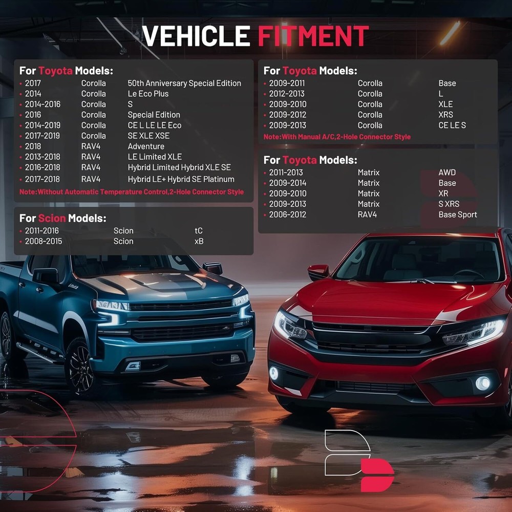 Detailed Applications Interchange Part Number: 700230 19184662 615-50122 8710302200 87103-42090 Specifications: New, not remanufactured or rebuilt ; Includes blower motor fan cage impeller already installed ; Direct replacement ; Built to strict quality control standards ; 100% tested prior to leaving the factory ; Front Blower Motor; Direct Replacement; Fitment : 2009-2010 Pontiac Vibe 2011-2016 Scion tC 2008-2015 Scion xB 2009-2013 Toyota Corolla w/ MANUAL AC 2009-2014 Toyota Matrix 2013-2016 Toyota RAV4 w/o 2006-2012 Toyota RAV4 For 2009-2019 Toyota Corolla Only fit With Manual A/C For 2006-2012 Toyota RAV4 Only fit Base and Sport model For 2013-2018 Toyota RAV4 Only fit With Manual Temperature Control