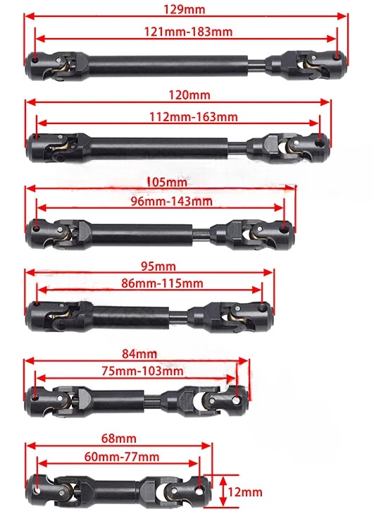 1Pcs Internal Spline Metal Drive Shaft Universal Joint Driveshaft for 1/10 RC Crawler TRX4 SCX10 Gladiator TF2 D90 YK4082 104311 CNC Machined Heavy duty steel, heat treated Advanced internal spline Universal joint for smooth operation Ultra scale looks Fit 5mm output shaft Weight and Travel Distance(pin to pin): 32g 60MM-77MM 37g 75MM-103MM 40g 86MM-115MM 44g 96MM-143MM 50g 112MM-163MM 54g 121MM-183MM Packing Included: (optional) 1 * Drive Shaft 2 * M4 Driveshaft Pin Friendly advice: 1. Due to the color temperature of the display, camera, ambient lighting and photography techniques, the color of some product photos may be different, and the color depends on the actual product. 2. Please allow slight size differences, operated by hand, Shipping Policy 1. We are not responsible for undeliverable addresses, and we reserve the right to charge additional shipping fees for items returned due to incorrect addresses. 2. If you do not receive your item within 30 working days, please feel free to contact us through the eBay email system, and we will do our best to resolve any issues with you. 3. Import taxes/tariffs are the responsibility of the buyer and are not included in the price and shipping costs. It is charged according to the customs of your country. Return Policy 1. We offer a 30 day refund guarantee and return policy. 2. Our warranty does not apply to products that are physically damaged or not under normal operating conditions due to buyer/user abuse or improper installation. 3. The return shipping fee shall be borne by the buyer and a refund shall be issued upon receipt of the return.