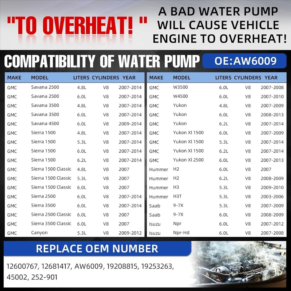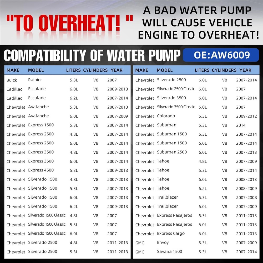 SAFE & SECURE SHOPPING 100% SATISFACTION GUARANTEED FAST SHIPPING Store Categories Store Categories Engine Motor Mount Other Water Pump Ignition coil Power Steering Pump Turbo Starter AC Condenser Headlights Brake Caliper Intercooler Charger Wiring Harness Wire Radiator Alternator Splash Guards Mud Flaps oxygen sensor Throttle Body Timing Chain Drive Shaft Motor Mount Camshaft Kit Control Arms Power Steering Gear Box Window Regulator Power Steering Rack A/C Compressor Side Mirror AC Compressor Clutches Wheel Bearing Air Suspension Strut Sun Visors Fuel Pump Assembly Leveling Lift Kit Carburetor Engine Oil Pan Coilovers Mirror Power Air Compressor You may also like 4PCS Engine Motor & Trans Mount Auto Set For 2007-2017 Nissan Altima 2.5L CVT 56.44 USD 83.99 USD Free shipping 33% off New 4x Engine Motor Mount & Auto Trans Mounts for 2007-2017 Nissan Altima 2.5L 53.49 USD 76.69 USD 3.99 USD 30% off Water Pump W/Gasket for Toyota Camry Highlander RAV4 Lexus ES350 3.5L AW6047 36.69 USD 52.41 USD Free shipping 30% off 4PCS Engine & Trans Mount For 2003-2008 Toyota Corolla Matrix Pontiac Vibe 1.8L 50.59 USD 74.27 USD Free shipping 32% off 4x Engine Motor & Trans Mount Set for 2002-2006 Toyota Camry 2.4L w/Auto Trans 59.49 USD 84.99 USD Free shipping 30% off 8Pack Ignition Coil and Spark Plug+ Wire For GMC Chevy Silverado 1500 Tahoe 5.3L 103.99 USD 148.56 USD Free shipping 30% off Engine Motor Mount Kit 4PCS Set For 2007 2008-2011 Toyota Camry LE Sedan 2.4L US 67.7 USD 99.7 USD Free shipping 32% off Water Pump For Dodge Ram Jeep Liberty Grand Mitsubishi Chrysler 3.7L 4.7L AW7163 36.59 USD 52.27 USD Free shipping 30% off Water Pump For 97-11 Ford Explorer Sport Trac Mustang Mazda Mercury 4.0L V6 12V 41.87 USD 59.81 USD Free shipping 30% off AW6348 Water Pump For 2012-2019 Explorer Edge Flex Taurus MKS MKX MKT 3.5L 3.7L 30.49 USD 43.56 USD Free shipping 30% off 2pc 2" 4x110 ATV Wheel Spacers for Honda ATC200X Foreman 400 450 500 4wd UTV 46.99 USD Free shipping 4x Motor Trans Mount For Nissan Sentra 2007-2012 L4 2.0L A4348 A4345 A4318 A4346 54.89 USD 78.41 USD Free shipping 30% off NEW Water Pump For Chevy Silverado Tahoe Suburban GMC Sierra 1500 4.8L 5.3L 6.0L Product Description US Warehouse,Fast Delivery! Warranty: limited 5 years warranty - free one time replacement. - Ship within 24 hours - Support 30 days return policy - Reply within 24 hours Contact Us: If you have the following issues, please contact us to get your problems solved: 1. Item Not Received 2. Item Not As Description 3. I Need to Return My Item 4. Pre-sale Inquiry 5. Others Specifications: Equipment Water Pump Direct replacement,No core charge Built to strict quality control standards Part Number(s): G9901, 130-9670, AW6009, 12600767, 12681417 19208815, 19253263, 12587305 Fitment : For Cadillac Escalade 2007 2008 2009 2010 2011 2012 2013 2014 V8 6.2L 376cid For Chevrolet Suburban 2500 2007 2008 2009 2010 2011 2012 2013 V8 6.0L 364cid For GMC Savana 1500 2007 2008 2009 2010 2011 2012 2013 2014 V8 5.3L 325cid For Chevrolet Express 2500 2007 2008 2009 2010 2011 2012 2013 2014 2015 V8 4.8L 294cid For Chevrolet W4500 Tiltmaster 2007 2008 2009 2010 V8 6.0L 364cid For Chevrolet Trailblazer 2007 2008 2009 V8 6.0L 364cid For Workhorse W62 2007 2008 2009 2010 2011 V8 6.0L 364cid For Chevrolet Express 3500 2007 2008 2009 2010 2011 2012 2013 2014 2015 V8 4.8L 294cid For GMC Savana 3500 2007 2008 2009 2010 2011 2012 2013 2014 2015 V8 4.8L 294cid For Chevrolet Avalanche 2007 2008 2009 2010 2011 2012 2013 V8 5.3L 325cid For Cadillac Escalade 2009 2010 2011 2012 2013 V8 6.0L 364cid For GMC Savana 4500 2009 2010 2011 2012 2013 2014 2015 V8 6.0L 364cid For GMC Savana 3500 2007 2008 2009 2010 2011 2012 2013 2014 2015 V8 6.0L 364cid For Buick Rainier 2007 V8 5.3L 325cid For GMC Sierra 1500 2007 2008 2009 2010 2011 2012 2013 V8 6.2L 376cid For Chevrolet Tahoe 2008 2009 V8 6.2L 376cid For Chevrolet Express 2500 2007 2008 2009 2010 2011 2012 2013 2014 2015 V8 6.0L 364cid For Chevrolet Express 1500 2007 2008 2009 2010 2011 2012 2013 2014 V8 5.3L 325cid For Chevrolet Express 4500 2009 2010 2011 2012 2013 2014 2015 V8 6.0L 364cid For Chevrolet Tahoe 2008 2009 2010 2011 2012 2013 V8 6.0L 364cid Workhorse W42 2009 2010 V8 4.8L 294cid For GMC Sierra 2500 HD 2007 2008 2009 2010 2011 2012 2013 2014 2015 V8 6.0L 364cid For GMC Yukon 2007 2008 2009 V8 4.8L 294cid For GMC Savana 2500 2007 2008 2009 2010 2011 2012 2013 2014 2015 V8 6.0L 364cid For Hummer H2 2008 2009 V8 6.2L 376cid For Chevrolet Silverado 2500 HD 2007 2008 2009 2010 2011 2012 2013 2014 2015 V8 6.0L 364cid For GMC W4500 Forward 2007 2008 2010 V8 6.0L 364cid For Chevrolet W3500 Tiltmaster 2007 2008 V8 6.0L 364cid For Isuzu NPR 2007 2008 2009 2010 2011 2012 V8 6.0L 364cid For GMC Sierra 3500 HD 2007 2008 2009 2010 2011 2012 2013 2014 2015 V8 6.0L 364cid For GMC Sierra 1500 2007 2008 2009 2010 2011 2012 2013 V8 6.0L 364cid For Isuzu NPR-HD 2007 2008 V8 6.0L 364cid For Chevrolet Silverado 1500 2007 2008 2009 2010 2011 2012 2013 V8 6.0L 364cid For GMC Yukon XL 1500 2007 2008 2009 V8 6.0L 364cid For Saab 9-7x 2007 2008 2009 V8 5.3L 325cid For Cadillac Escalade ESV 2007 2008 2009 2010 2011 2012 2013 2014 V8 6.2L 376cid For Chevrolet Express 3500 2007 2008 2009 2010 2011 2012 2013 2014 2015 V8 6.0L 364cid For Chevrolet Tahoe 2007 2008 2009 V8 4.8L 294cid For GMC Yukon XL 1500 2007 2008 2009 2010 2011 2012 2013 2014 V8 5.3L 325cid For GMC Yukon XL 1500 2007 2008 2009 2010 2011 2012 2013 2014 V8 6.2L 376cid For Chevrolet Silverado 1500 2007 2008 2009 2010 2011 2012 2013 2014 V8 5.3L 325cid For Hummer H3 2008 2009 2010 V8 5.3L 325cid For GMC Yukon 2008 2009 2010 2011 2012 2013 V8 6.0L 364cid For Cadillac Escalade EXT 2007 2008 2009 2010 2011 2012 2013 V8 6.2L 376cid For GMC Sierra 1500 2007 2008 2009 2010 2011 2012 2013 2014 V8 5.3L 325cid For Chevrolet Colorado 2009 2010 2011 2012 V8 5.3L 325cid For Chevrolet Avalanche 2007 2008 2009 V8 6.0L 364cid For GMC Canyon 2009 2010 2011 2012 V8 5.3L 325cid For Saab 