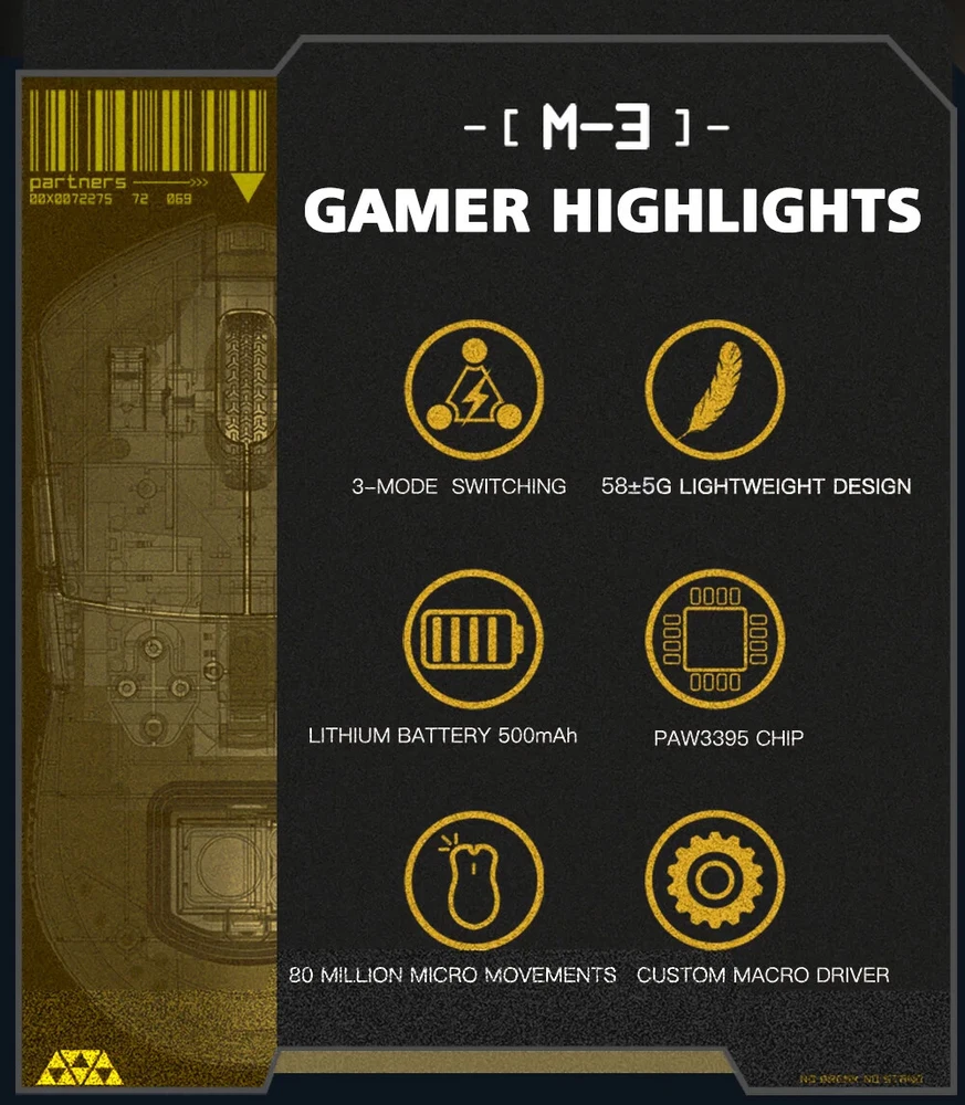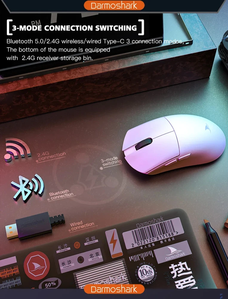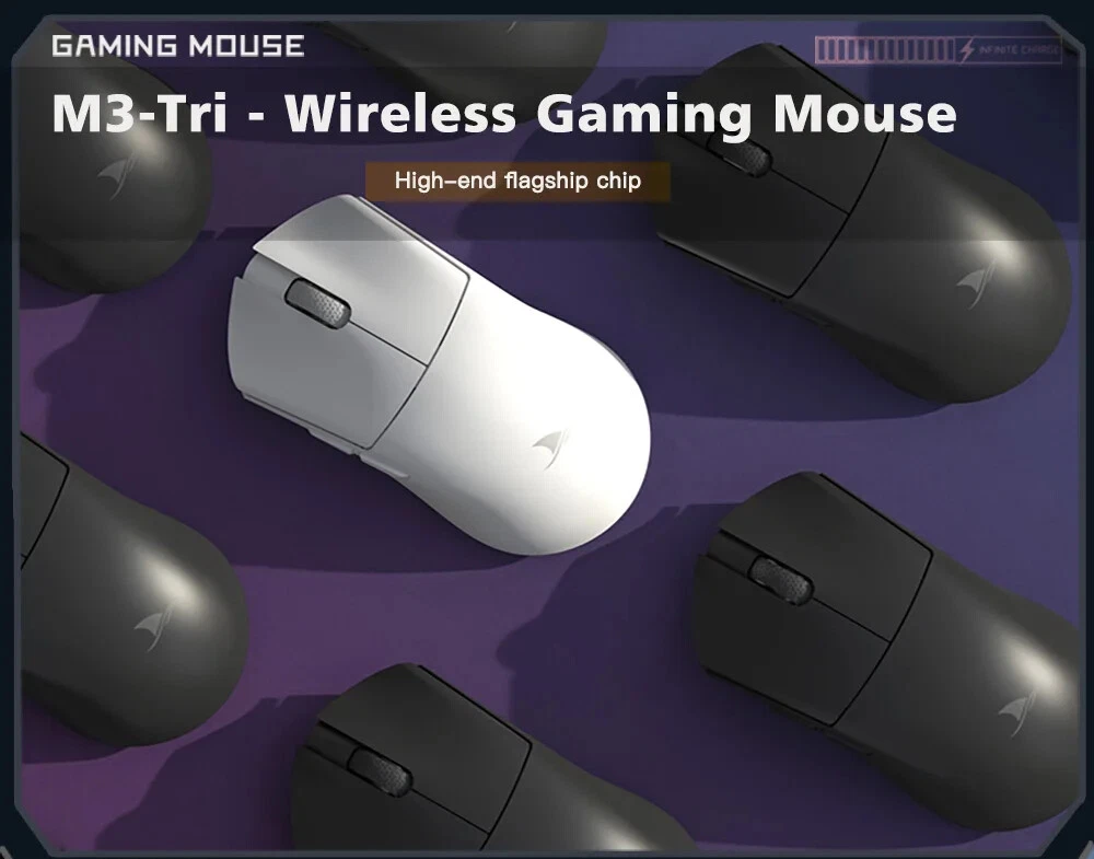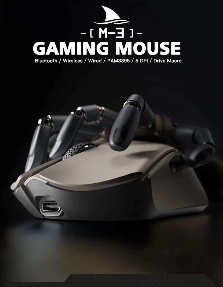 Product model:M3 Shell material: ABS Optoelectronic IC:PAM3395 Micro switch: TTC 60M Encoder: TTC golden wheel 2 million laps Foot stickers:Teflon PTFE Connection mode :wireless/ Bluetooth / wired Connection Lithium battery:500mAh Maximum speed:650IPS FPS image processing:26000fps Acceleration:50G SPI: 8ms/2ms(default)/1ms Operating Voltage:USB Wired:DC5V±5% Wireless:DC3.7V Interface: Gold-plated USB2.0 Type-C Bottom sensor light:infrared light wire rod:Type-C data cable five-core braided flash rope with magnetic ring. DPI:400 red, 800 blue (default), 1600 green, 3200 purple, 4800 yellow DPI:26000DPI( Driver settings) Wired/2.4GHz: red light 125HZ, blue light 500HZ,green light 1000HZ Size:129.55*66.12*39.23mm Weight: net weight 58±5G Driver installation: only Windows system is supported Bluetooth does not support drivers. Bluetooth does not support drivers. Driver installation :http://www.darmoshark.cn/ Operating system: Wired and 2.4G modes: WinXP/Win7/Win8/Win10/Win11/Macos Bluetooth mode: Win8/Win10/Win11/Macos Bluetooth pairing operation: When the bottom three section switch is turned to the B icon, press the left, middle and right buttons at the same time, and the blue light of the scroll wheel position flashes, entering the pairing state. At this time, you need to turn on the Bluetooth device to search for the N3 Mouse before pairing. After the connection is successful, the indicator light goes out. 2.4G pairing operation: When the bottom three section switch is turned to the G icon, press the left, middle and right buttons at the same time, and the green light of the scroll wheel position flashes to enter the pairing state. At this time, the receiver needs to be inserted. After the connection is successful, the indicator light goes out. (Note: The factory has been paired and it is OK. If the 2.4G has no function, this step can be followed Wired mode: When inserting Type-c data cable connection, the wired mode is preferred. Package content: 1 x M3 Gaming mouse 1 x USB2.0 Type-C Cable 1 x 2.4G Wireless Receiver 1 x User manual 1 x Adapter 1x Foot stic