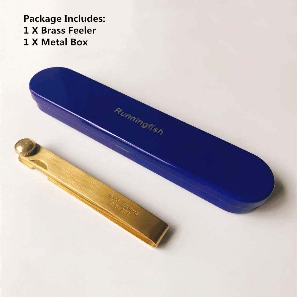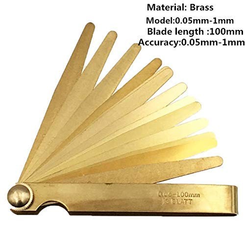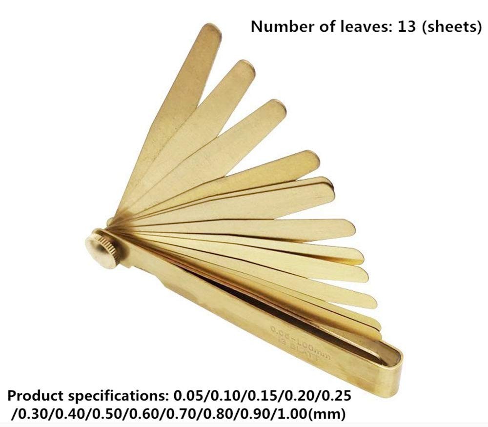 Use the feeler tokeep your hands clean and dry and do not wear gloves. Wipe the dust andgrease on the feeler to avoid affecting the measurement accuracy. The feeler shouldnot be forced into the measuring gap during measurement, so as to prevent thefeeler from bending or breaking. The feeler ruler isrelatively thin and sharp to prevent scratches on the hand or other body parts. Can not be used tomeasure the higher temperature of the workpiece. After use, thefeeler should be wiped clean and coated with a thin layer of industriallubricating oil, and then the feeler should be folded back into the clampingframe to prevent corrosion, bending, deformation and damage. For the measurementand adjustment of the gap, the feeler ruler conforming to the gap requirementsshould be firstly selected to insert into the measured gap, and then the feelerruler should be pulled while adjusting until the locking nut is tightened whenslight resistance is felt. At this time, the value marked by the feeler ruleris the measured gap value. When storing, do not put the feeler under Material: Brass, anti-electromagnetic rust. Iron box packaging, easy to access. Various Applications:Use on anything from guitars to engines and everything in between; Metric and SAE standard sizes are included (millimeters ) Measure Gaps:Use this Feeler Gauge when you need to quickly and easily measure gap widths。Machinery Industry, High-tech Equipment, Measuring gaps, Compressor manufacturers, Testing machine tool special fastening surfaces and fastening surfaces, Piston ring grooves and piston rings, Cylinders and pistons, Crosshead slides and guides, intake and exhaust valve tops and The size of the gap between the two mutually opposing faces, Such as the rocker arm and the gear meshing gap. Modeland Accuracy: 0.05mm-1mm Size: 100mm*13mm Blade length :100mm Number of leaves: 13 (sheets) Product specifications:The large image on the left shows detailed two feeler gauge measurements