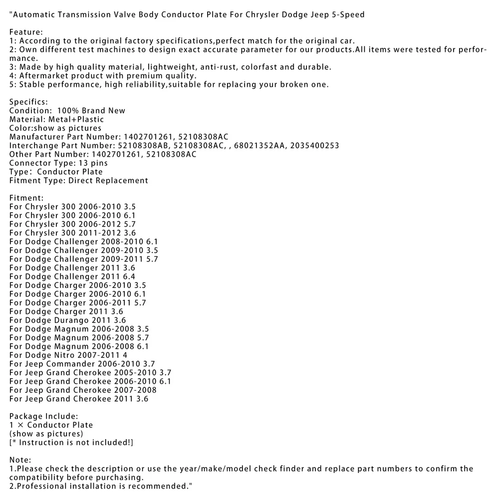 You may also like New Torque Converter Lock-Up Solenoid Fits For Lineartronic CVT TR580 690 VA 67.85 USD Free shipping 45RFE 545RFE 68RFE Transmission Sensors Set Wiht 4WD Filter Kit Pan Gasket 99-UP 63.85 USD Free shipping 02E325039 02E DSG Mechatronics Repair Board Transmission Harness DQ250 For VW 119.85 USD Free shipping 7X 6F35 6F15 Transmission Solenoids Valve Kit For Ford ESCAPE FUSION 2009-up 179.85 USD Free shipping Governor Pressure Sensor Solenoid Kit & Filter A518 46RE 47RE 2000-UP NEW 85.85 USD Free shipping ZF5HP19 Oil Pump Cast # 1060 410 017 For BMW RWD 1999-On 203.85 USD Free shipping A500 A518 46RE Transmission Overdrive Lockup Solenoid For Dodge 1996-1999 65.41 USD 68.85 USD Free shipping 5% off 6L90 6L90E 6L80 6L80E Transmission Master Rebuild Kit 359.85 USD Free shipping Transmission Oil Pressure Switch Sensor 28610-RKE-004 For Honda Acura Accord 18.85 USD Free shipping Transmission Filter & Gasket Shift Solenoid Kit A B For GM Chevy 4L60E 24230298 68.85 USD Free shipping 6DCT450 MPS6 Dual Clutch Front Oil Seal Cover Seal Kit For Ford Volvo Journey 110.85 USD Free shipping Neutral Safety switch 2529.27 For Peugeot and Citroen Multifunction Transmition 28.85 USD Free shipping Automatic Transmission Valve Body Conductor Plate For Chrysler Dodge Jeep 5-Speed Feature: 1: According to the original factory specifications,perfect match for the original car. 2: Own different test machines to design exact accurate parameter for our products.All items were tested for performance. 3: Made by high quality material, lightweight, anti-rust, colorfast and durable. 4: Aftermarket product with premium quality. 5: Stable performance, high reliability,suitable for replacing your broken one. Specifics: Condition: 100% Brand New Material: Metal+Plastic Color:show as pictures Manufacturer Part Number: 1402701261, 52108308AC Interchange Part Number: 52108308AB, 52108308AC, , 68021352AA, 2035400253 Other Part Number: 1402701261, 52108308AC Connector Type: 13 pins Type:Conductor Plate Fitment Type: Direct Replacement Fitment: For Chrysler 300 2006-2010 3.5 For Chrysler 300 2006-2010 6.1 For Chrysler 300 2006-2012 5.7 For Chrysler 300 2011-2012 3.6 For Dodge Challenger 2008-2010 6.1 For Dodge Challenger 2009-2010 3.5 For Dodge Challenger 2009-2011 5.7 For Dodge Challenger 2011 3.6 For Dodge Challenger 2011 6.4 For Dodge Charger 2006-2010 3.5 For Dodge Charger 2006-2010 6.1 For Dodge Charger 2006-2011 5.7 For Dodge Charger 2011 3.6 For Dodge Durango 2011 3.6 For Dodge Magnum 2006-2008 3.5 For Dodge Magnum 2006-2008 5.7 For Dodge Magnum 2006-2008 6.1 For Dodge Nitro 2007-2011 4 For Jeep Commander 2006-2010 3.7 For Jeep Grand Cherokee 2005-2010 3.7 For Jeep Grand Cherokee 2006-2010 6.1 For Jeep Grand Cherokee 2007-2008 For Jeep Grand Cherokee 2011 3.6 Package Include: 1 × Conductor Plate (show as pictures) [* Instruction is not included!] Note: 1.Please check the description or use the year/make/model check finder and replace part numbers to confirm the compatibility before purchasing. 2.Professional installation is recommended. -About US Founded in 2012, VIPJQ have professional development and sales, and are involved in various products, providing customers with various high-quality products. Since its establishment, VIPJQ has always adhered to the service concept of "customer first" and the management concept of "pursuit of quality", and is committed to providing customers with high-quality original designs. We commit to provide you the best innovative, quality products & professional services with competitive prices. We value every customer, and we look forward to providing solutions for your business needs to help your business achieve its goals, please contact us immediately! We are all about you! We are a Japanese seller,but with large warehouse in USA. We are profesional on Auto Parts,Car Parts,Motorcycle Parts,3C,other hot sale items and so on. We aim to provide to customers high quality product and best service. -About Shipment&Returns The item usually will be dispatched within 3 days after you ordered.All are free shipping. And it usually takes 3-10 working days to delivery depends on buyers' address or other majeure on the way. If you are not satisfied with the items and want to return the item,we hope you could message us first,we will give you the return details, we think we could give you the best service to save your time and money.Thank you. -About Feedback&Customer Service If you are enjoy your shopping here,not only enjoy the items but also the service,we are appreciate you could give us a 5-star feedback. If you are not satisfied with the item,before you give us the negative feedback,we hope we could give you the best solution through our commutication. We think we could do it if you give us the chance.Thank you.