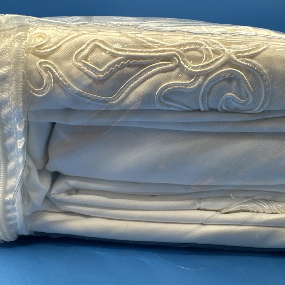 This is a luxurious Highgate Manor Queen Sheet Set in Ivory, featuring a solid color design with majestic crewel embroidery. Made from a blend of 60% Cotton and 40% Polyester, this sheet set has a thread count of 600. Perfect for the bedroom, this set is both elegant and comfortable. Made in China. New in original packaging. Never been removed from the packaging. Excellent condition. Machine wash cold, gentle cycle. No bleach. Size queen. Set includes 1 flat sheet, 1 fitted sheet, and 2 pillowcases. Please check the pictures carefully as part of the description. Feel free to ask questions if you need more information before you buy it. Thank you for your interest B-11