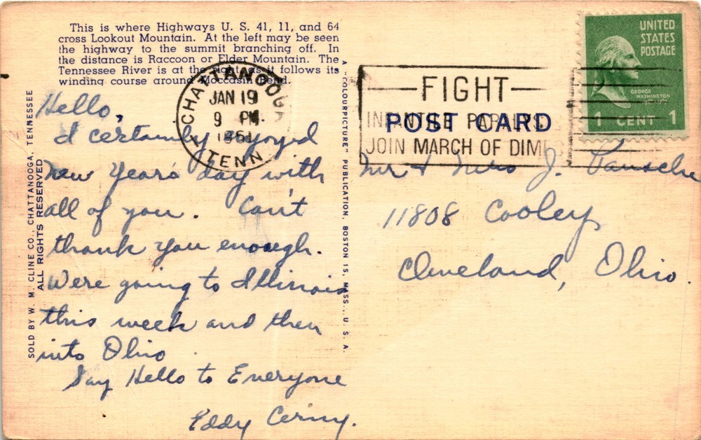 MAKE AN OFFER. THE MORE YOU BUY THE BETTER DEAL I WILL ACCEPT The postcard features a view of the Highway Up Lookout Mountain in Chattanooga, Tennessee, where Highways U.S. 41, 11, and 64 intersect. The image shows the highway leading to the summit of Lookout Mountain with Raccoon or Elder Mountain visible in the distance. The Tennessee River can be seen winding around the area.