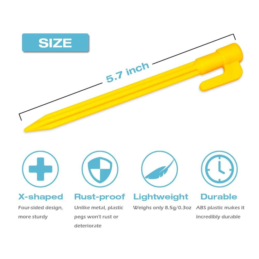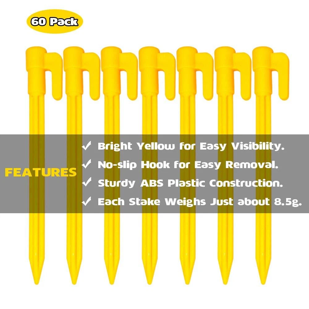 Package Included: 60 Pcs Plasitc Landscape Stakes QUALITY MATERIALS - Made from durable and lightweight ABS plastic materials. Each plastic stakes weighs just about 0.3 ounces but unbreakable - 5.7 inches long. MORE PRACTICAL - Unlike metal, plastic pegs won't rust or deteriorate - reusable and easy to store in your camping backpack or gardening shed for future projects. ESSENTIAL ACCESSORIES - Great accessories for anchoring garden netting, camping tents, rain tarps and landscape fabric lawn edging. COST-EFFECTIVE - With 60-Pack plastic stakes in every package, hikemax is offering more quality plastic stakes at less cost than similar stakes on the market. HIGH VISIBILITY AND CONVENIENCE - In bright yellow, these plastic stakes WILL NOT BE LOST in the long grass. No-slip hook is designed for easy removal.