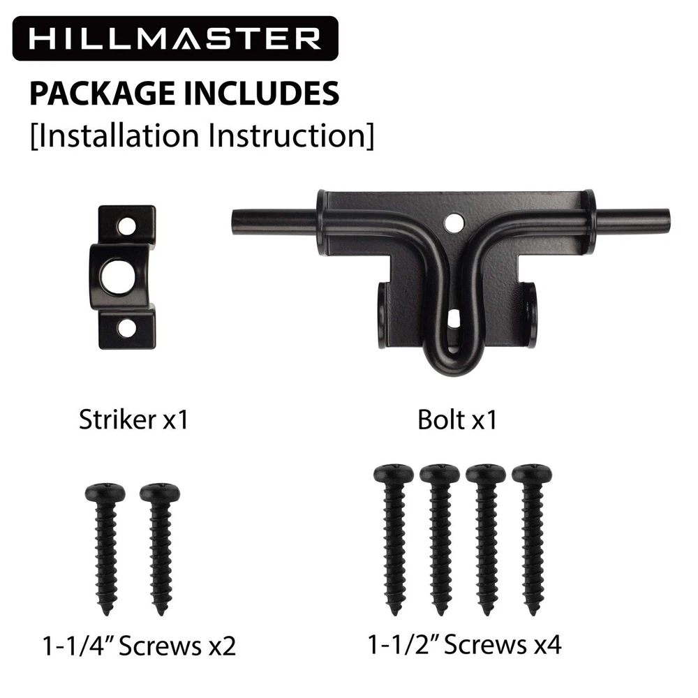Package Includes: 1x Latch 1x Bar 1x Pull Ring with Wire 1x Installation Instruction 2x 1.26"(30mm) Screws and 6x 1.5"(38mm) Screws Multipurpose for Security: ➤Prevent children from getting into the pool area for safety. ➤Built a gate for the deck to keep the younger kids away from the stairs. ➤Used gate latch for a doggie gate to confine a puppy to certain parts of the house. ➤Great and convince to keep veggie garden door locked all the time automatically. ➤Good for the application on privacy fence. ➤Used this for an interior gate at the top of my stairs. Strike can be mounted either on the gate or the post and used as a left or right hand application. Pad lockable for added security. Accepts shackle diameter up to 0.3". Heavy duty automatic gate latch with all fasteners included and easy to install. Widely used in wooden pool fences, side fences, dog kennels, carports, crawl spaces, and animal pens Our gate hardware is engineered for strength and longevity and will enhance your unique gate or fence security design. 【Sliding Manual Closing】Sliding bolt gate latch is designed to offer simple but solid security for inward and outward swinging gates and doors, Manual Closing Mechanism.classical black can match any back yard decor. 【Upgrade 1.5” Strong Screw】The Fence Gate Latch made from strong heavy gauge steel construction with Superior black powder coat finish & Zinc Plated corrosion resistance, maintain product life, Apply the 2020 upgrade new 1.5”(38mm) screw to help fix the gate latch more deep and firm. 【Easy to Install & Multipurpose】Comes with installation instructions and mounting screws, suitable for wood gates, metal gates, vinyl gate or post applications, use on backyard, deck, sheds, baby gate, privacy fence or chicken coop door, barn doors.used as a left or right hand application. 【Heavy-Duty & Padlockable】Gate Latch Measured 6-3/8'' long and weight 0.59lb(270g), Can be padlocked for added security with ordinary padlock (Padlock not included). 【Professional Guarantee】We are specialized in producing various hardware fittings, please go find all kinds of home hardware fittings you need in HILLMASTER store and enjoy it! If you are not satisfied with our products, please feel free to contact us. We are committed to providing the professional products and the caring service for everyone.