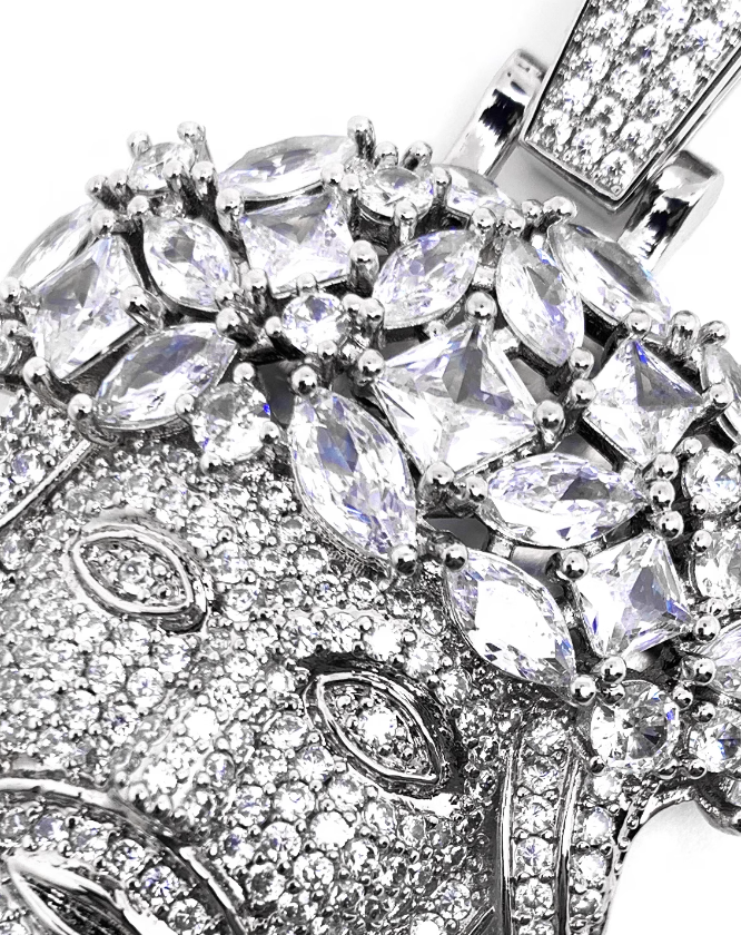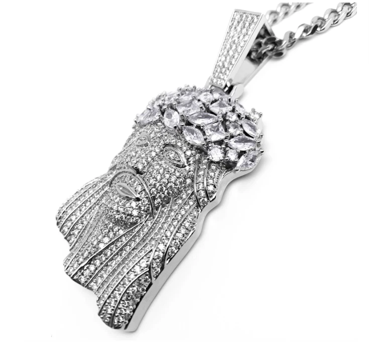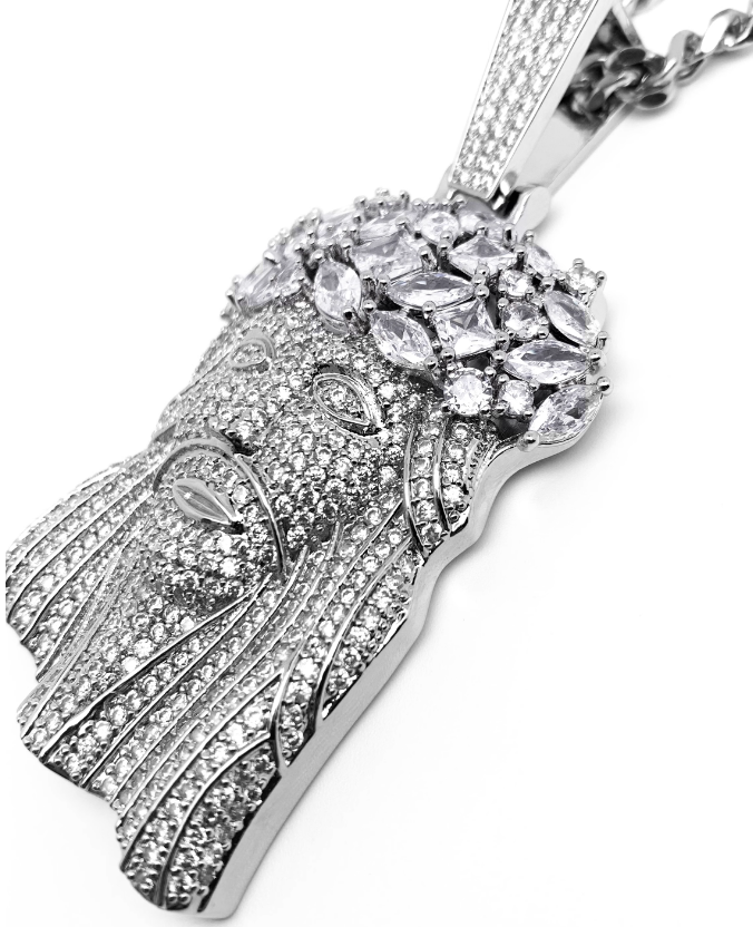 Rap JESVS necklace This avatar necklace has been worn by a large number of rap artists since the 1990s Tupac Kanye 50 Cent Jay-Z loves to wear big Jesvs necklaces The unique feature of this necklace is that its face is covered in white zircon stones Filled with 328 zircon stones, 5A grade white zircon stones, particularly shiny and non shedding, not cheap rhinestones. Free delivery of 70mm long 5mm thick titanium steel Cuban chain, non rusting and non fading Look just like real diamonds and cant tell difference without a microscope SO ICY IT WILL BLIND YOU!