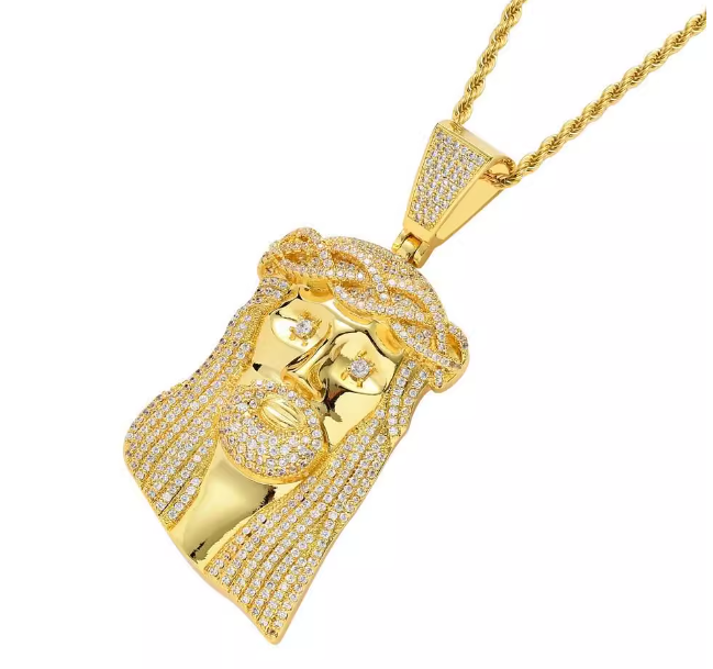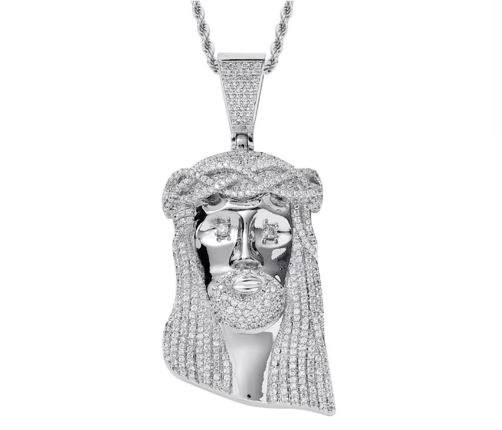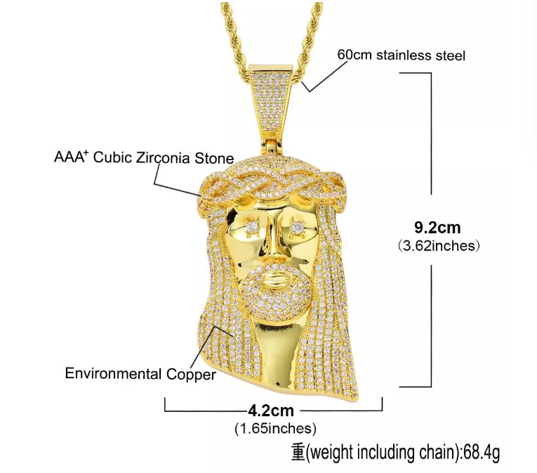 Rap JESVS necklace This avatar necklace has been worn by a large number of rap artists since the 1990s Tupac Kanye 50 Cent Jay-Z loves to wear big Jesvs necklaces The unique feature of this necklace is that its face is covered in white zircon stones Filled with 328 zircon stones, 5A grade white zircon stones, particularly shiny and non shedding, not cheap rhinestones. Free delivery of 70mm long 5mm thick titanium steel Cuban chain, non rusting and non fading Ships fast Let us know if you have any questions