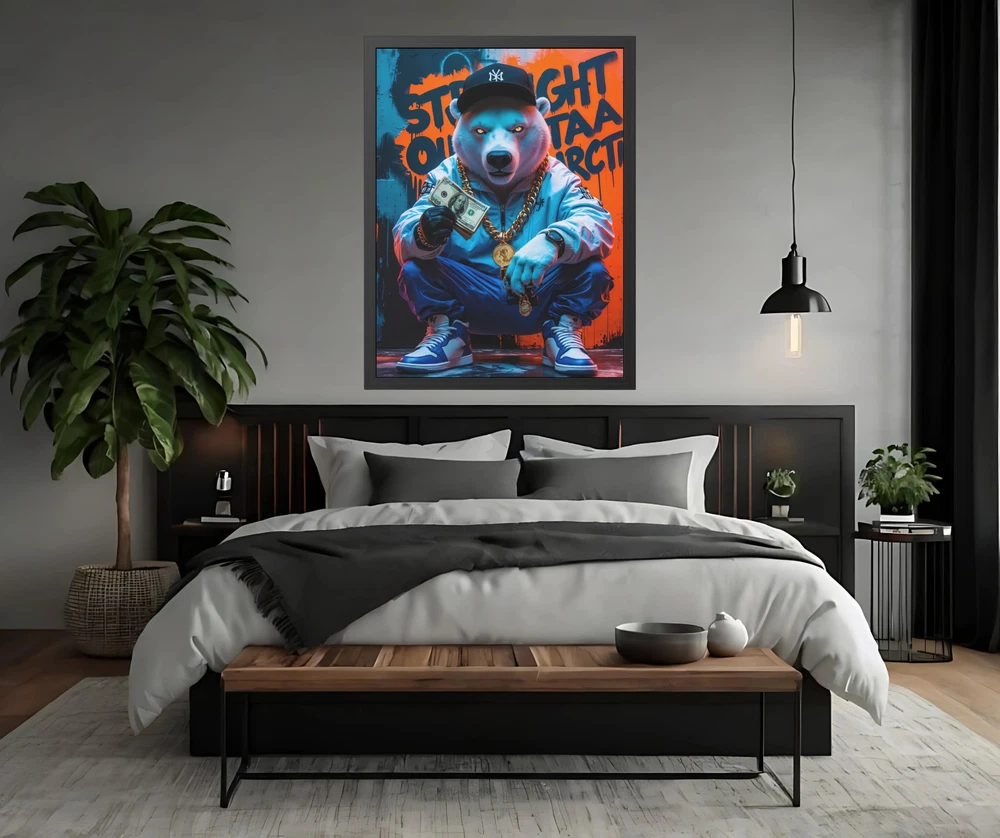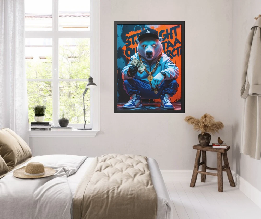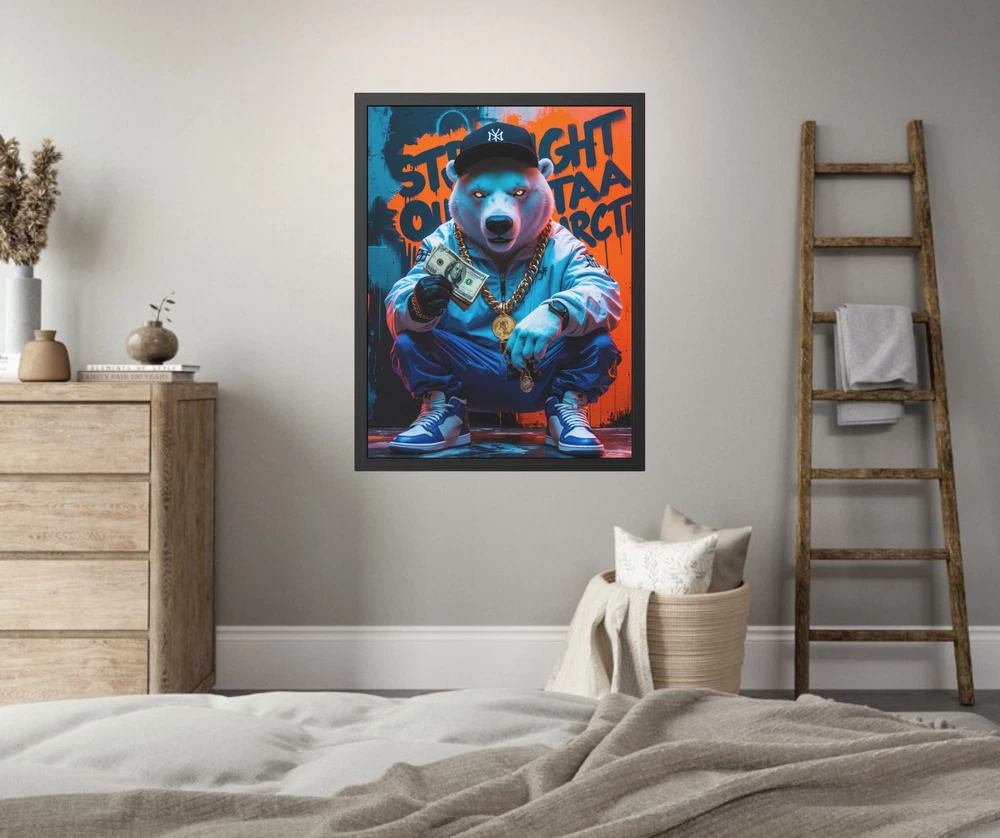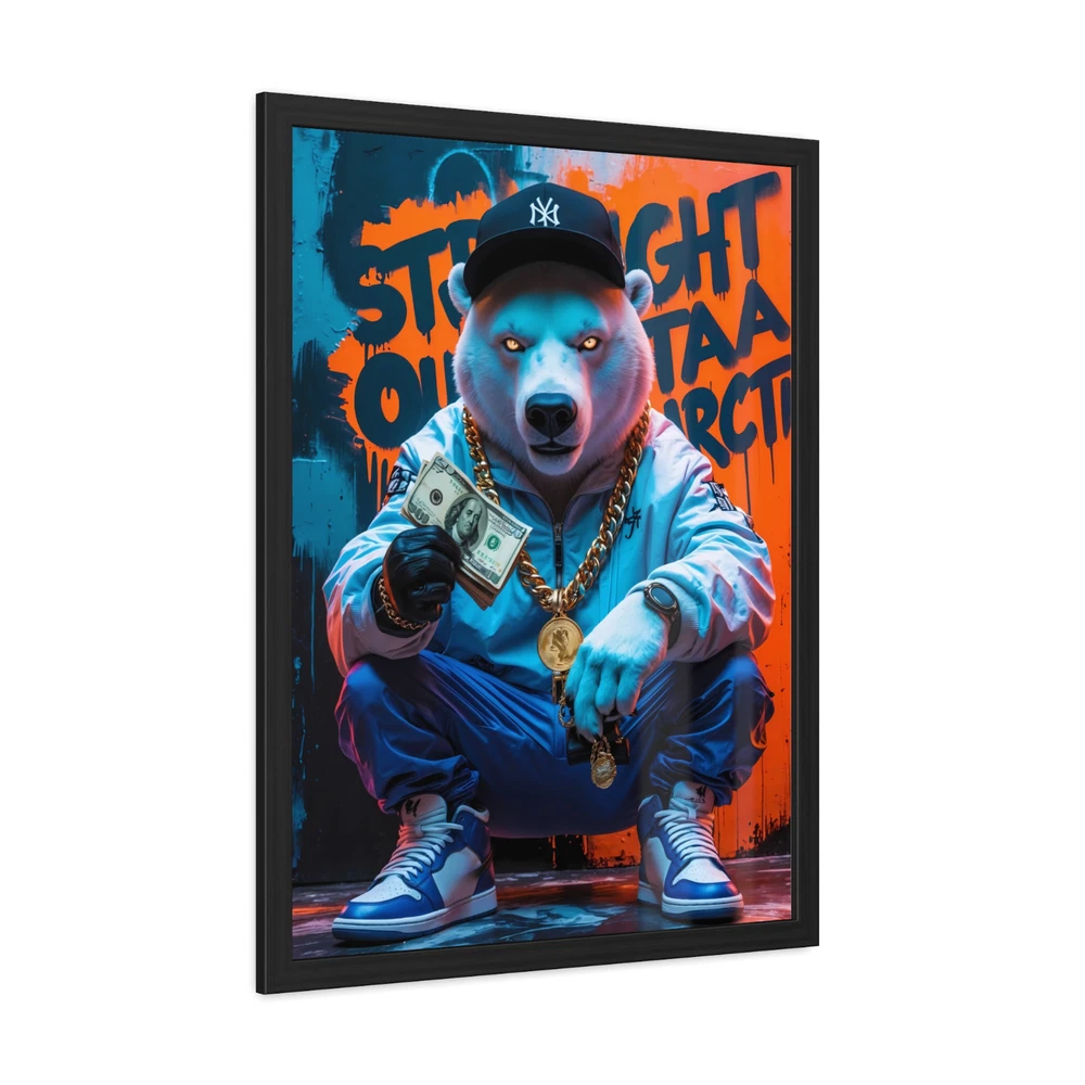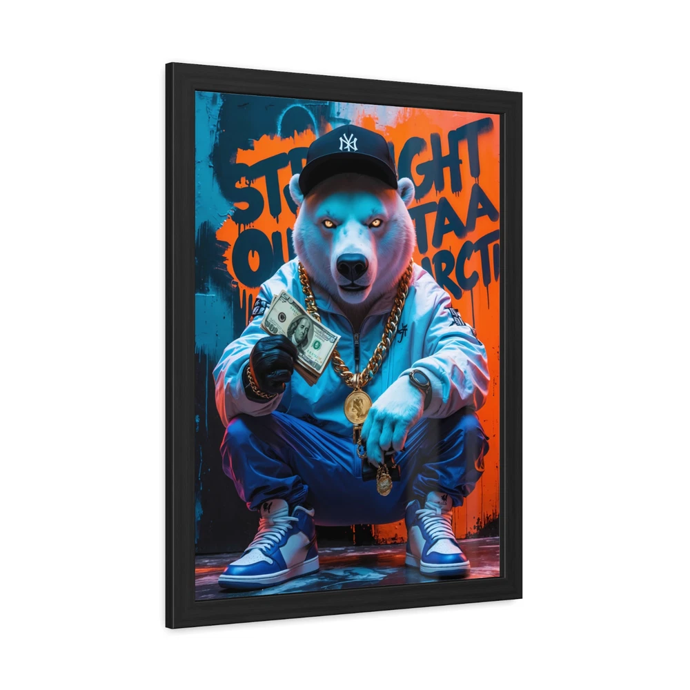 π§ "Straight Outta Antarctica" β Hip-Hop Polar Bear Framed Art π§ Step into the icy streets of the Arctic with "Straight Outta Antarctica" , a bold and electrifying hip-hop illustration featuring a swaggered-out polar bear flexing his cash and gold jewelry . Dressed in fresh hip-hop wear and sneakers , this chill yet commanding bear kneels down, showing off his stacks of money, iced-out chains, and glowing eyes , exuding pure hustler energy . Behind him, the graffiti-tagged wall declares his origins loud and proud: "Straight Outta Antarctica" . This high-energy artwork is printed in HDR on premium 200 gsm semi-gloss photo paper , ensuring vivid colors, crisp details, and deep contrasts . Using Misaki UV inks and cutting-edge printing techniques , every detail pops with brilliance βfrom the shine of his gold chains to the cool tones of the Arctic-inspired backdrop. The illustration is expertly encased in a hand-crafted black wooden frame , built from durable pine wood with a sleek, semi-wide finish , offering an elevated, gallery-style presentation . To protect your print, the frame is fitted with a clear Perspex (Plexiglas) insert , which is both scratch-resistant and shatterproof , ensuring your artwork remains flawless for years to come . Designed for convenience, this framed piece arrives ready to hang , complete with an enclosed back and a pre-installed hanging kit for effortless mounting. Crafted in the USA using eco-friendly, globally sourced, and recycled materials , this piece is as responsible as it is stylish . π₯ Key Features π₯ β Badass Hip-Hop Polar Bear Design β A kneeling polar bear dripping in gold and cash , dressed in hip-hop fashion with glowing eyes. β High-Definition HDR Printing β Printed on 200 gsm semi-gloss photo paper , delivering sharp detail, rich colors, and striking depth . β Premium UV Ink Quality β Uses Misaki UV inks and state-of-the-art printing techniques for long-lasting, fade-resistant vibrancy . β Luxury Hand-Crafted Framing β Black wooden frame made from durable pine wood with a smooth, semi-wide finish . β Shatterproof Protection β Equipped with a clear Perspex (Plexiglas) insert , scratch-resistant and shatterproof for extra durability. β Ready to Hang β Arrives fully assembled with an enclosed back and pre-installed hanging kit for easy mounting. β Eco-Friendly & Made in the USA β Crafted from sustainably sourced and recycled materials , ensuring responsible production . β Low Maintenance β Easily wipe clean with a dry cloth to keep your print looking fresh and flawless . Perfect for hip-hop lovers, street art enthusiasts, and those who appreciate bold, urban aesthetics , "Straight Outta Antarctica" is the ultimate statement piece for any man cave, studio, lounge, or game room . Bring home this icy yet fire artwork and let it flex its style on your wall! π₯π° 4o