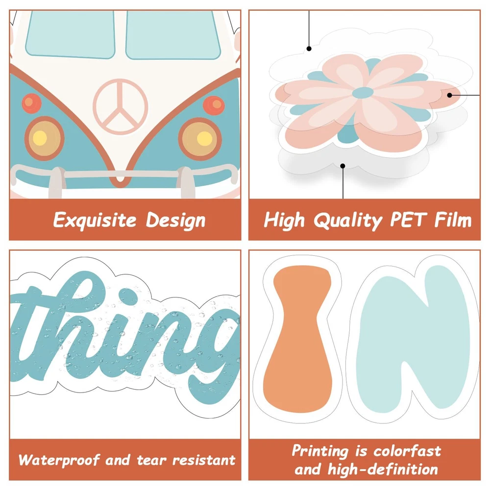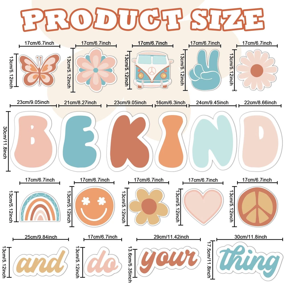 Description Hippie Be Kind And Do Your Thing Cutouts Classroom Bulletin Board Groovy Positive Sayings Accents Motivational Psychology Quote Cards Classroom Educational Decoration for School Home Office Wall Decor Package including: Hippie cutouts set Size: Hippie cutouts about 12-30cm/4.72*11.8inch Material: Hippie cutouts are made of paper Application scenario:Office、Primary school、Kindergarten、Middle School、Pre school、Study room, Daycare,Learning center、Classroom This exquisite style of classroom decorations can be matched with other decorations at will. They will make an atmosphere addition. Package Contents: Our classroom bulletin board set boasts a collection of inspiring card art prints and 60 adhesive dot embellishments, all with a focus on promoting children's mental well-being. These designs are the perfect addition to any classroom decor. Convenient To Use: The cards included in this set of classroom bulletin boards vary in size from 12-30 cm/4.72*11.8inch, providing ample space for inspiring messages to be read without causing overcrowding. Additionally, adhesive dots are thoughtfully provided for your convenience when attaching the Classroom posters. Quality Material: Our classroom bulletin board card set is made of quality card, which is sturdy and reusable, non-toxic, and can be kept for a long time. Come with good printing patterns, looks so bright and vivid, easy to catch the eye. Hippie Style: Revel in the inspiration of our classroom bulletin board sets, featuring a diverse array of feeling charts that hone in on your emotions and provide you with the tools to challenge negative thoughts. With this simple therapy at your fingertips, you'll be able to uplift yourself whenever you need it most. Wide Range Of Usages: This is great for school classroom walls, kindergarten, study rooms, daycare, bulletin boards, and learning centers, to enhance children's emotional regulation ability, also suitable for behavior therapy, special education, and other needs.