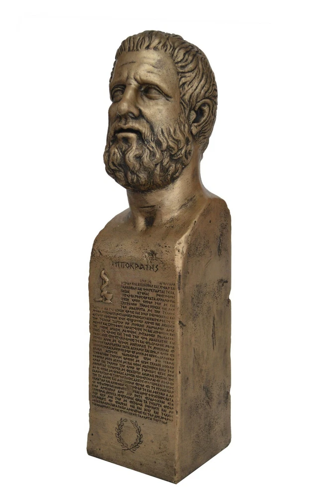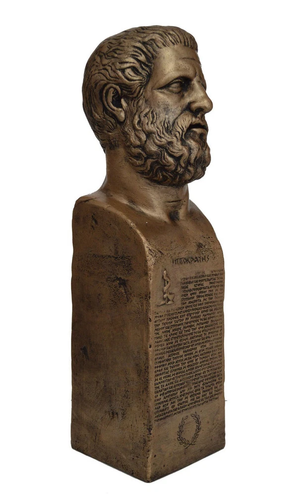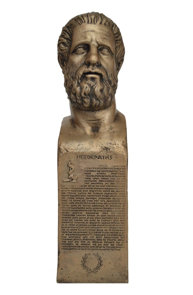 HIPPOCRATES STATUE Hippocrates of Kos (c. 460 – c. 370 BC), also known as Hippocrates II, was a Greek physician of the Age of Pericles(Classical Greece), and is considered one of the most outstanding figures in the history of medicine. He is referred to as the "Father of Western Medicine" in recognition of his lasting contributions to the field as the founder of the Hippocratic School of Medicine. This intellectual school revolutionized medicine in ancient Greece, establishing it as a discipline distinct from other fields with which it had traditionally been associated (theurgy and philosophy), thus establishing medicine as a profession. The Hippocratic Oath is an oath historically taken by physicians and other healthcare professionals swearing to practice medicine ethically and honestly. The Hippocratic Oath is one of the most widely known of Greek medical texts. It requires a new physician to swear upon a number of healing gods that he will uphold a number of professional ethical standards. It is inscribed in Greek and makes a priceless gift for every Physician!!! Please be aware that, due to the fact that our products are either individually cast, carved, hand painted and hand finished, there will inevitably be minor variations in size, colour and texture. (B708) Details: Condition: New, Handmade in Greece Height: 47 cm(18.5") Width: 12 cm(4.7") Weight: 3.5 Kg Material: Casting stone with Bronze effect ********