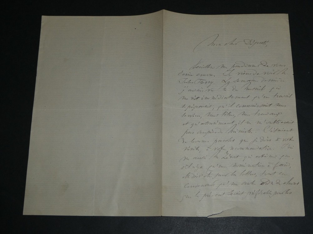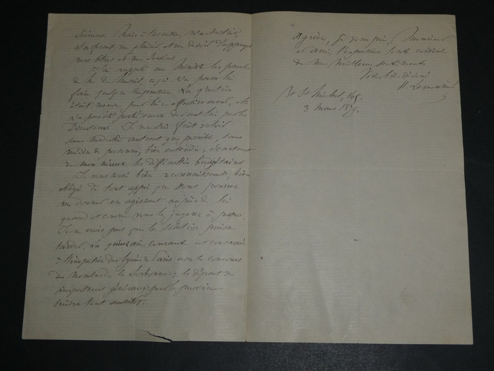 Lettre autographe signée de Hippolyte-Guillaume LEMONNIER en date du 14 février 1879. État: Voir photos pour plus de détails. Dimensions : 13,3 x 20,5 cm . 2 pages. Hippolyte Guillaume Lemonnier (1820-1882) était un maître de conférence à la Faculté de sciences de Paris. Envoi soigné dans un emballage rigide et étanche. Satisfait ou remboursé. Si vous n'êtes pas entièrement satisfait, je reprends la marchandise avec retour à ma charge pour l'Europe et à la charge de l'acheteur pour le reste du monde. N’hésitez pas à visiter ma boutique et affiner vos recherches en fonction des catégories qui vous intéressent. Ma boutique L'Art Délivré. Lettres autographes, vieux papiers, livres anciens, photographies, gravures, timbres… Nous expertisons et/ou rachetons dans toute la France vos lettres, collections de lettres et livres anciens. Merci de votre visite. Jérôme KAYSER. Lettre autographe signée de Hippolyte-Guillaume LEMONNIER en date du 14 février 1879. État: Voir photos pour plus de détails. Dimensions : 13,3 x 20,5 cm. 2 pages. Hippolyte Guillaume Lemonnier (1820-1882) était un maître de conférence à la Faculté de sciences de Paris. Envoi soigné dans un emballage rigide et étanche. Satisfait ou remboursé. Si vous n'êtes pas entièrement satisfait, je reprends la marchandise avec retour à ma charge pour l'Europe et à la charge de l'acheteur pour le reste du monde. N’hésitez pas à visiter ma boutique et affiner vos recherches en fonction des catégories qui vous intéressent. Ma boutique Lettres autographes, vieux papiers, livres anciens, photographies, gravures, timbres… Nous expertisons et/ou rachetons dans toute la France vos lettres, collections de le