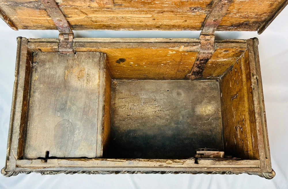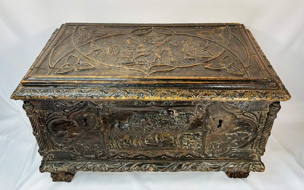 Historic Italian Carved Wooden Chest | Circa 16th–17th Century Historical Context & Origin Region: Northern Italy, Renaissance EuropeMaterial: Hand-carved hardwood with early wrought-iron lockworkPeriod: Circa 1550–1650 CE Description This exceptional Renaissance cassone—also known as a forziere or valuables chest—exemplifies the artistic craftsmanship of Northern Italy during the late Renaissance to early Baroque period. Carved from dense hardwood and richly decorated on all sides, it features deeply sculpted figural panels framed by flowing foliate scrolls and classical motifs. The lid presents an intricate narrative tableau within a quatrefoil-style border, while the front and sides display additional relief scenes including animals, draped figures, and architectural elements. Resting on carved scroll feet and fitted with an early wrought-iron internal lock mechanism, this chest would originally have served as a dowry chest, ceremonial strongbox, or household repository for treasured possessions. The interior retains its original compartmented structure, including a traditional side till. A warm, aged patina with traces of its original finish highlights centuries of preservation and continuous history. Features - Finely hand-carved Renaissance figural and foliate panels - Early wrought-iron hinges and internal locking mechanism - Original compartmented interior with traditional side till - Carved scroll feet and decorative Renaissance borderwork - Deep, warm patina consistent with 16th–17th century craftsmanship - A museum-worthy example of Italian domestic art and dowry tradition Cultural Significance Renaissance cassoni were central to Italian households and wedding traditions, often presented as marriage chests symbolizing prosperity, lineage, cultural refinement, and the formation of a new household. Their sculptural reliefs frequently depicted mythological, pastoral, or moral narratives, reflecting Renaissance values and artistic sophistication. Beyond symbolism, they functioned as secure strongboxes for textiles, jewelry, documents, and family heirlooms. Today, surviving examples like this provide invaluable insight into Renaissance domestic life, craftsmanship, and cultural identity—bridging fine art and functional design. Condition Very good antique condition with age-appropriate wear. Surface displays patina, handling marks, and minor abrasions to carved panels. Expected shrinkage and oxidation to iron fittings present. Scroll feet show historical restoration, typical and appropriate for cassoni of this age. Interior remains original with no modern reconstruction. Structurally sound and suitable for display. Dimensions (Approximate) Width: 28.25 inHeight: 16.5 in Age Approximately 375–475 years old Learn More Learn about Renaissance Italian woodcarving traditions and master craftsmen: Painters & Woodcarvers in Early Renaissance Italy Explore more authentic 17th-century historical artifacts from our collection: 17th Century Artifacts — Relic & Rarity Historic Italian Carved Wooden Chest | Circa 16th–17th Century Historical Context & Origin Region: Northern Italy, Renaissance Europe Material: Hand-carved hardwood with early wrought-iron lockwork Period: Circa 1550–1650 CE Description This exceptional Renaissance cassone—also known as a forziere or valuables chest—exemplifies the artistic craftsmanship of Northern Italy during the late Renaissance to early Baroque period. Carved from dense hardwood and richly decorated on all sides, it features deeply sculpted figural panels framed by flowing foliate scrolls and classical motifs. The lid presents an intricate narrative tableau within a quatrefoil-style border, while the front and sides display additional relief scenes including animals, draped figures, and architectural elements. Resting on carved scroll feet and fitted with an early wrought-iron internal lock mechanism, this chest would originally have served as a dowry chest, ceremonial strongbox, or household repository for treasured possessions. The interior retains its original compartmented structure, including a traditional side till. A warm, aged patina with traces of its original finish highlights centuries of preservation and continuous history. Features - Finely hand-carved Renaissance figural and foliate panels - Early wrought-iron hinges and internal locking mechanism - Original compartmented interior with traditional side till - Carved scroll feet and decorative Renaissance borderwork - Deep, warm patina consistent with 16th–17th century craftsmanship - A museum-worthy example of Italian domestic art and dowry tradition Cultural Significance Renaissance cassoni were central to Italian households and wedding traditions, often presented as marriage chests symbolizing prosperity, lineage, cultural refinement, and the formation of a new household. Their sculptural reliefs frequently depicted mythological, pastoral, or moral narratives, reflecting Renaissance values and artistic sophistication. Beyond symbolism, they functioned as secure strongboxes for textiles, jewelry, documents, and family heirlooms. Today, surviving examples like this provide invaluable insight into Renaissance domestic life, craftsmanship, and cultural identity—bridging fine art and functional design. Condition Very good antique condition with age-appropriate wear. Surface displays patina, handling marks, and minor abrasions to carved panels. Expected shrinkage and oxidation to iron fittings present. Scroll feet show historical restoration, typical and appropriate for cassoni of this age. Interior remains original with no modern reconstruction. Structurally sound and suitable for display. Dimensions (Approximate) Width: 28.25 in Height: 16.5 in Age Approximately 375–475 years old Learn More Learn about Renaissance Italian woodcarving traditions and master craftsmen: Painters & Woodcarvers in Early Renaissance Italy Explore more authentic 17th-century historical artifa