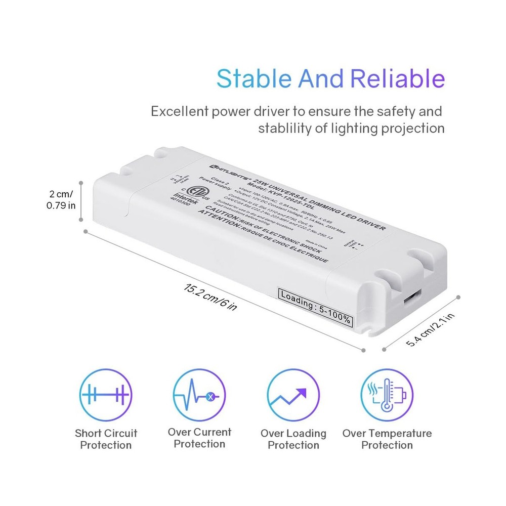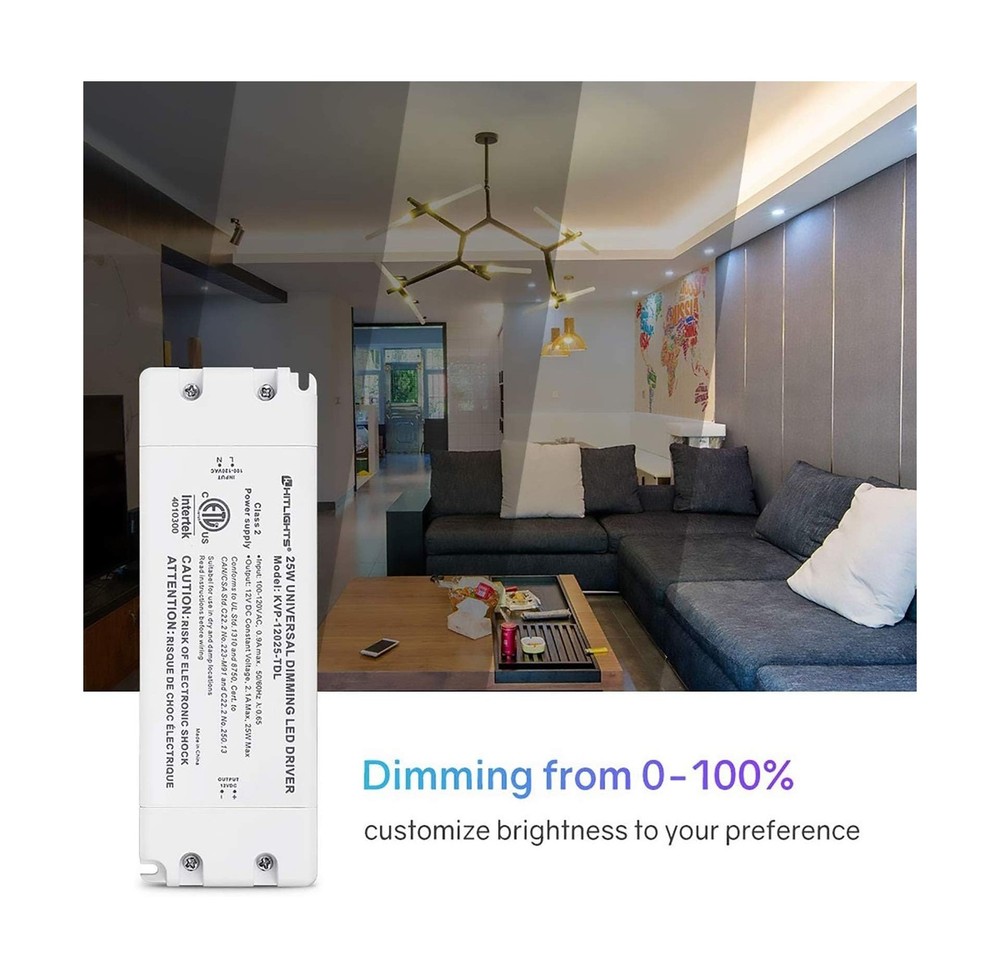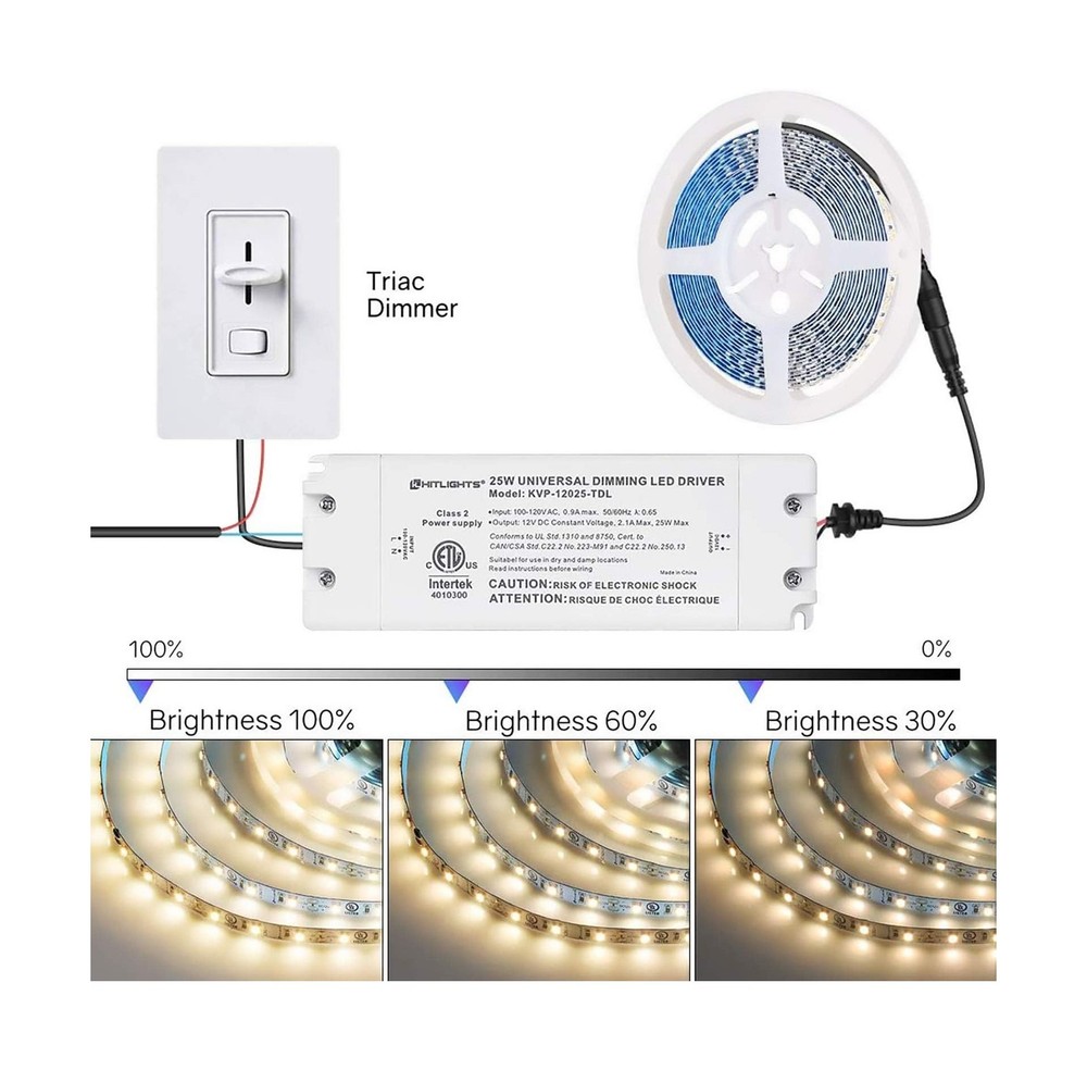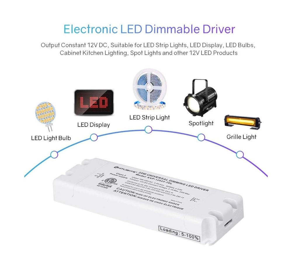 HitLights 25W Dimmable LED Driver Transformer, Power Supply 120V AC to 12V DC, Compatible with Lutron Leviton Dimmers, for LED Strip Lights, Constant Voltage LED Projects, ETL Listed Description CONVERTS 120V AC to 12V DC and works with LED compatible dimmer switches from Lutron, Leviton and more. SMOOTH AND RELIABLE DIMMING from 0 to 100% with no flicker. SCREW TERMINAL CONNECTIONS for easy installation to electrical code; See diagram in images for wiring instructions. CHOOSE AN APPROPRIATE LIGHT LEVEL for any room, any mood, or any time of day. HITLIGHTS QUALITY, ETL-LISTED and backed by a two year from HitLights for peace of mind; Contact our US-based customer service team at any time for no-hassle troubleshooting and replacement or for any questions about purchasing or installation. Manufacturer Contact Information Made by HITlights: For questions about the product or product usage, please call (855) 768-4135 to contact the manufacturer. Features: CONVERTS 120V AC to 12V DC and works with most dimmer switches from Lutron, Leviton and more. This led transformer is ideal for a variety of low voltage lighting projects. UNIVERSAL COMPATIBILITY: This dimmable driver is compatible with most Forward Phase, Reverse Phase, Triac, MLV, and ELV dimmers. Comes with a removable AC power cord and screw terminals for easy electrical code compliant installation. SMOOTH AND RELIABLE DIMMING from 0 to 100% with no flicker. Set the appropriate light level for any room, any mood, and any time of day. SAFETY PROTECTION: This 12V LED driver comes with a short circuit, overload, and over temperature protection to keep your driver and project safe. lNPUT: 100-120V AC, 0.9A max. 50/60Hz, OUTPUT: 12V DC, 2.1A max, 25W max. IP20 Rated for indoor use. Product Details: Brand: HitLights Power Source: AC Product Dimensions: 2.1"D x 3.1"W x 0.79"H Mounting Type: Wall Mount Current Rating: 2 Amps Specification Met: CSA, ETL, FCC UPC: 856556006047 Manufacturer: HitLights Product Dimensions: 6.06 x 2.13 x 0.75 inches Item Weight: 10.8 ounces Item model number: PWR-12V-024-30-D Is Discontinued By Manufacturer: No Date First Available: June 17, 2016 Delivery We Do Not Ship Outside of the Continental US. Return Policy All items qualify for returns within 30 days of receipt. Seller is responsible for return shipping on any item that is not damaged. Feedback We take our reputation seriously, we buy and sell online, so we understand the value of trust. If you are unsatisfied with your order, please contact us and we will work with you to resolve it to your satisfaction.
