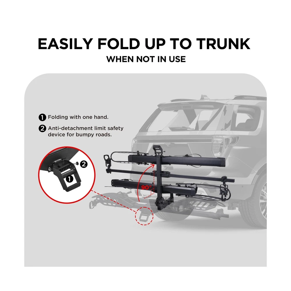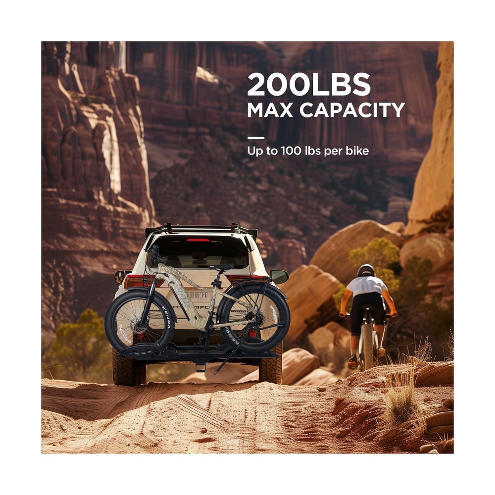 Hitch Mount 2 EBike Rack, 200 lbs Capacity Electric Bike Carrier Foldable Platform Mount, Up to 5-inch Fat Tire Bicycle for 2'' Receiver Cars Trucks SUVs Minivans RV, Trailer Description Features: SAFE AND SECURE ON OFFROAD: Comes with 2-arm fix, Anti-falloff 360 swirl structure, patent secure wheel cradles and anti-wobble structure, that secure your E-bikes in place without swaying and knocking against vehicle. 200 LB TOTAL CAPACITY: Easily transports up to 100 pounds per bike. Universal tire holders and wheel straps are compatible with e-bikes, mountain bikes, road bikes with up to 5 fat tires. USERS FRIENDLY: Convenient handle to lift. Easily folds up out of the way when not in use, Ideal for storage or when parking in a garage. SIMPLE ADATATION: Movable cradles for adapting to different types of bikes of lengths. Perfect fit most standard e-bikes, road bikes, mountain bikes and more, even kids bike. 2 INCH HITCH RECEIVER: ONLY fits vehicles with 2" receivers, the rack is sturdy and does not wobble easily. Most parts come pre-assembled for easy installation. Parts including hitch pins, instruction manual and hardware. Can be used with a ramp (not included in package), need to purchase the ramp separately!! Product Details: Color: Black Brand: Young Electric Item dimensions L x W x H: 41.73 x 69.13 x 40.66 inches Load Capacity: 2E+2 Pounds Mounting Type: U-Bolt Automotive Fit Type: Universal Fit Manufacturer: Young Electric Color: Black Brand: Young Electric Item dimensions L x W x H: 41.73 x 69.13 x 40.66 inches Load Capacity: 2E+2 Pounds Mounting Type: U-Bolt Automotive Fit Type: Universal Fit Manufacturer: Young Electric Model: Bike rack Item Weight: 66.1 pounds Product Dimensions: 41.73 x 69.13 x 40.66 inches Item model number: 10104118-2 Manufacturer Part Number: 10104118-2 Date First Available: May 9, 2025 Delivery We Do Not Ship Outside of the Continental US. Return Policy All items qualify for returns within 30 days of receipt. Buyer is responsible for return shipping on any item that is not damaged. Feedback We take our reputation seriously, we buy and sell online, so we understand the value of trust. If you are unsatisfied with your order, please contact us and we will work with you to resolve it to your satisfaction.