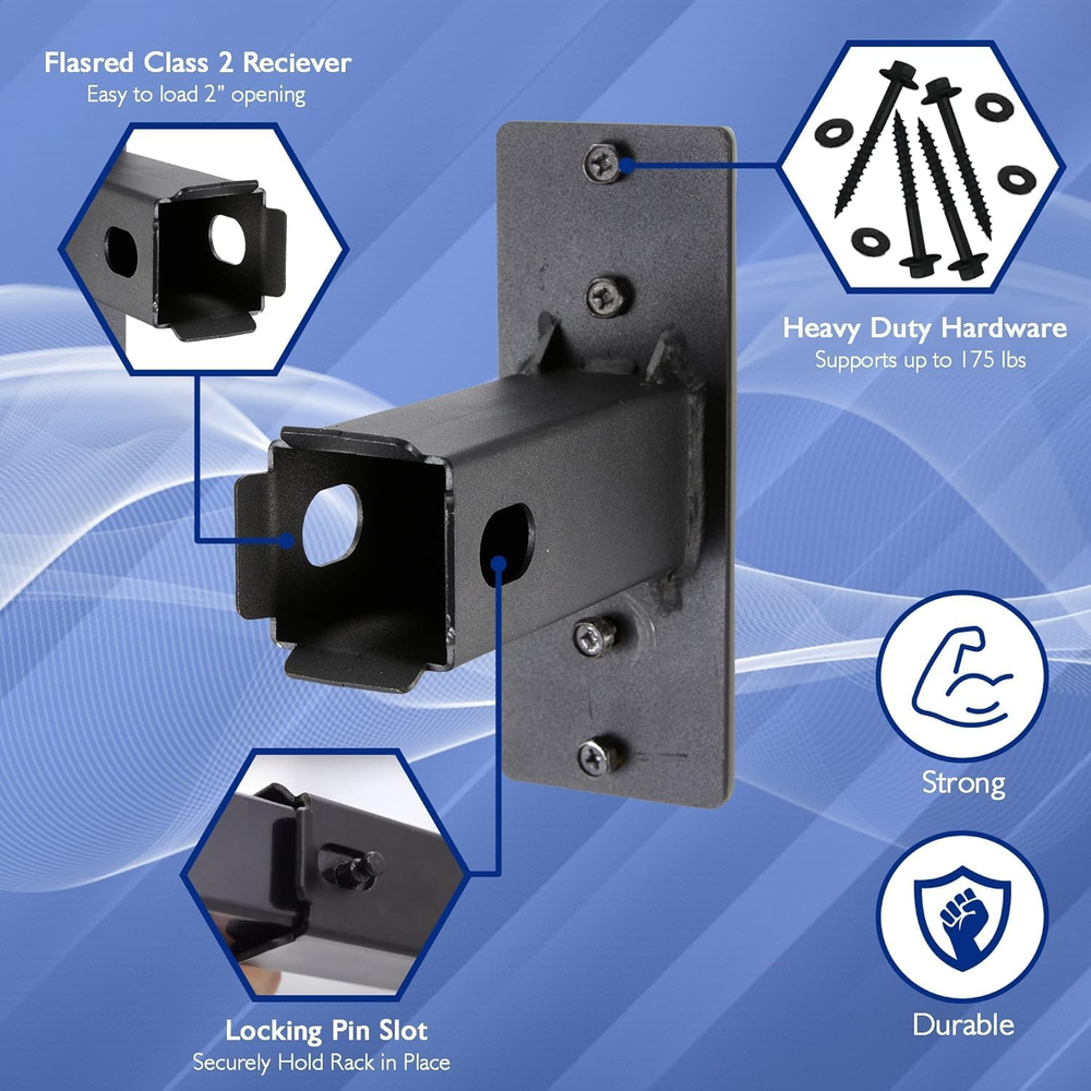 EFFECIENT GARAGE HITCH ORGANIZER MOUNT – Give your bike or cargo car rack hitch a proper storage space that is not in the way of other things with the Ulticor hitch wall mount for bike & cargo car rack garage storage. PRACTICAL DESIGN – Available in 2 flared variants of 1.25” & 2” receiver options for easy loading, this 2" hitch wall mount adapter can accommodate class 3 and class 4 hitch mounted racks weighing up to 200 lbs, giving you a perfect fit. DURABLE & SECURE – Made from heavy-duty hardware, this bike rack trailer hitch wall mount storage organizer is secure as it has 4 screws anchored in the wall stud and also has a stop pin to hold the rack in place for added safety. PERMIUM QUALITY – We build our wall mount hitch receiver from solid steel that is powder coated for a fine matt black finish, is rust proof, corrosion resistant and is sure to last you for many years to come. EASY TO INSTALL – To make life easier for you, all the hardware needed for a seamless and hassle-free installation of our hitch carrier wall mount into standard wall studs is included in the package. Are you looking for a storage solution to keep your bike and cargo car rack safe? Do you find these racks awkwardly propped up against the wall in your garage leaving space cluttered and also with the risk of them falling and breaking? Introducing the ULTICOR hitch wall mount storage rack that is a functional piece of equipment to install in your garage to keep your hitch-mounted car racks safe. ULTICOR BIKE RACK TRAILER HITCH WALL MOUNT STORAGE ORGANIZER - Made from solid powder coated steel that is rust proof, corrosion resistant, and extreme durable this hitch wall mount can bear a load of upto 200lbs. - With flared 1.25” and 2” receiver options, this hitch mount has been built for easy loading and will securely fit class 1, 2, 3 and 4 racks. - We use only heavy duty hardware that is proven to last for long, and our hitch wall mount can be secured to the wall stud using 4 screws. - This pack includes all installation hardware for your convenience and you can setup this wall mounted hitch receiver in a matter of no time. - You can give this wall mount hitch as a present to all those adventure enthusiast as it will make a practical and incredibly useful gift to them. WE OFFER A 100% CUSTOMER SATISFACTION GUARANTEE ON YOUR EVERY PURCHASE WITH US! All our products are manufactured from durable & high grade materials in facilities adhering to strict compliance and stringent quality standards. So, Don’t think twice! ORDER NOW, and keep your garage clutter free with our wall mount hitch adapter!