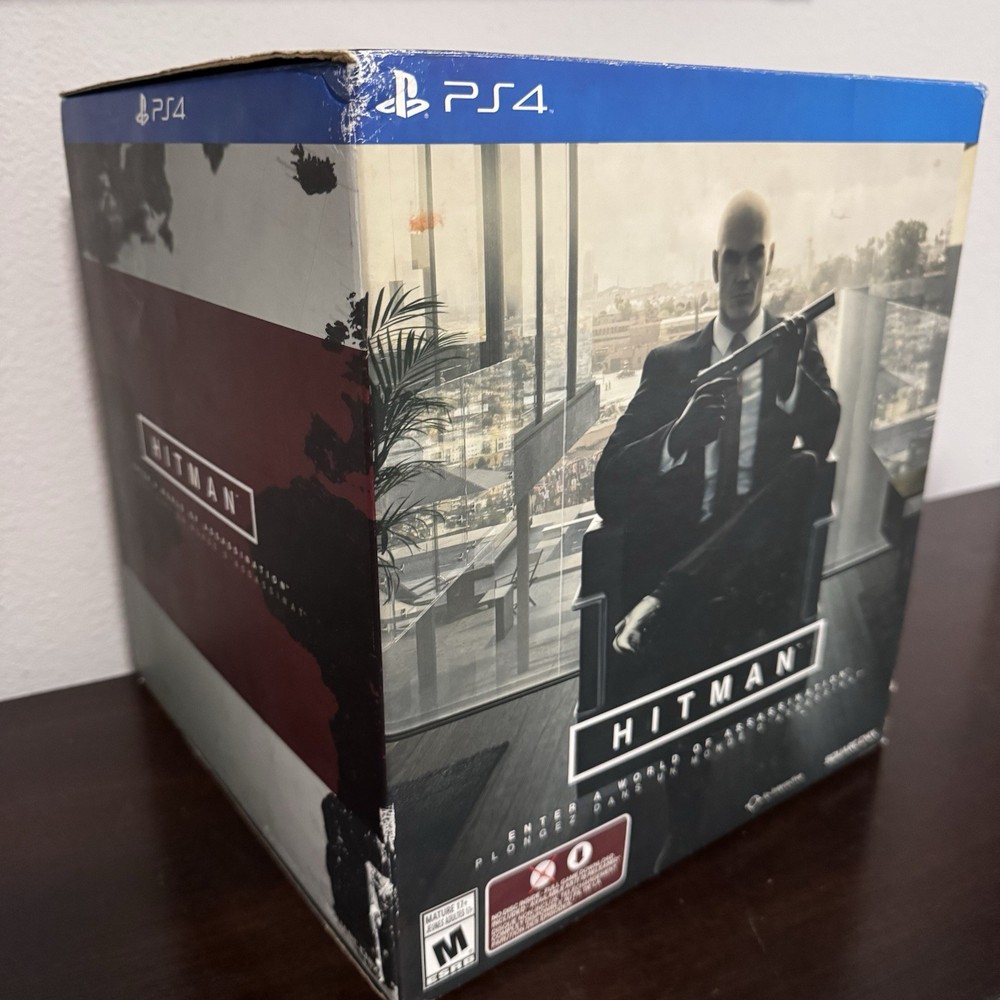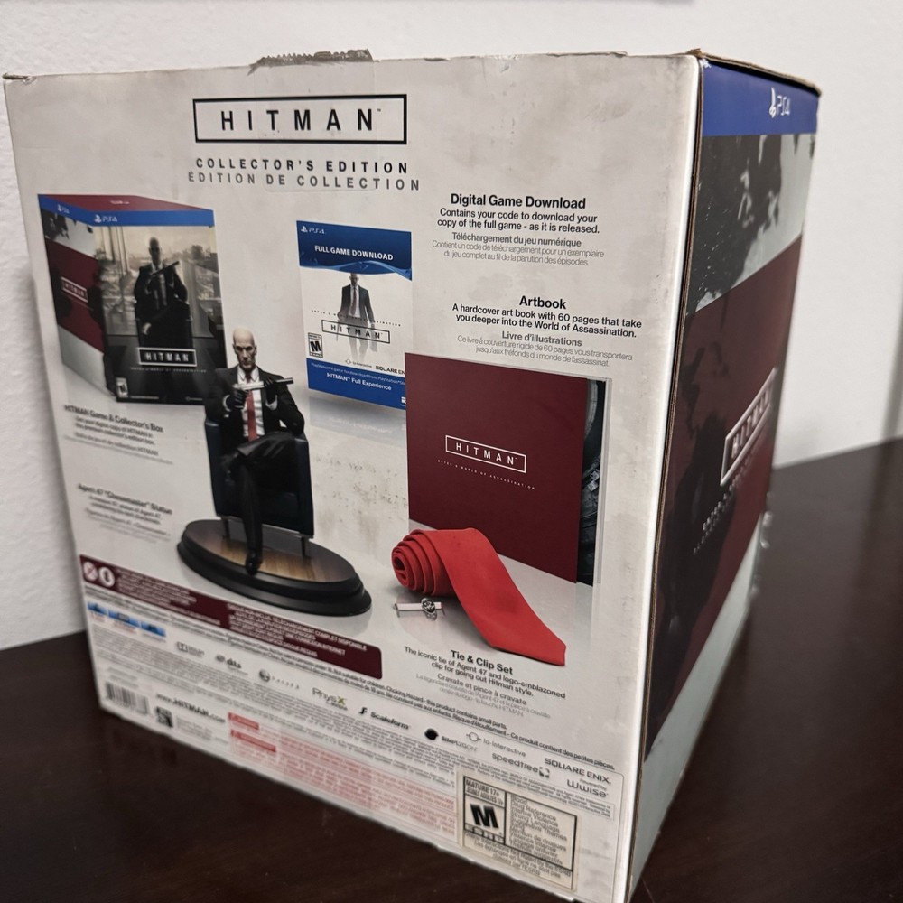 Hitman Collector’s Edition for PlayStation 4 by Square Enix. Includes Agent 47 statue (seated with gun), a hardcover artbook with 60 pages, a red tie & clip set. Everything comes in the original collector’s box, which shows visible wear but contents are in excellent condition. A premium set for fans of stealth-action games and collectors alike.