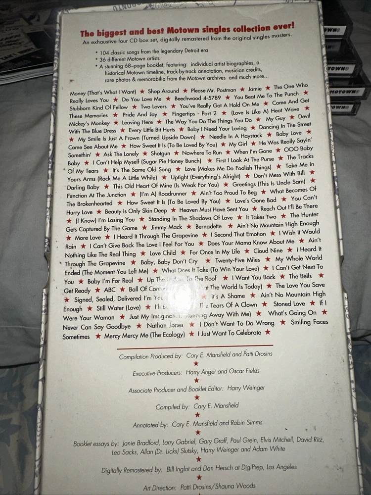 This 4 CD box set is a must-have for any Motown or soul/R&B & soul music fan. The Hitsville USA Motown Singles Collection features hits from various artists such as Smokey Robinson, Marvin Gaye, and Stevie Wonder, among others. The CDs come in a standard jewel case and are graded as Excellent (EX) for both the case and inlay conditions. The collector's edition box set is a best of compilation with a multicolor design, showcasing the era of 1960s, 1950s, and 1970s. Released in 1992, the CDs are a rare find and perfect for any music collector. The set includes tracks produced by Al Cleveland, Berry Gordy Jr., Brian Holland, and many other talented individuals. Get your hands on this rare gem today!