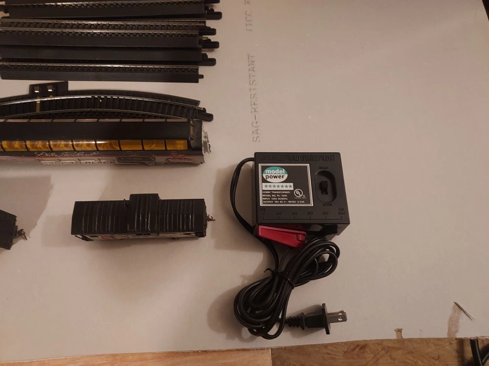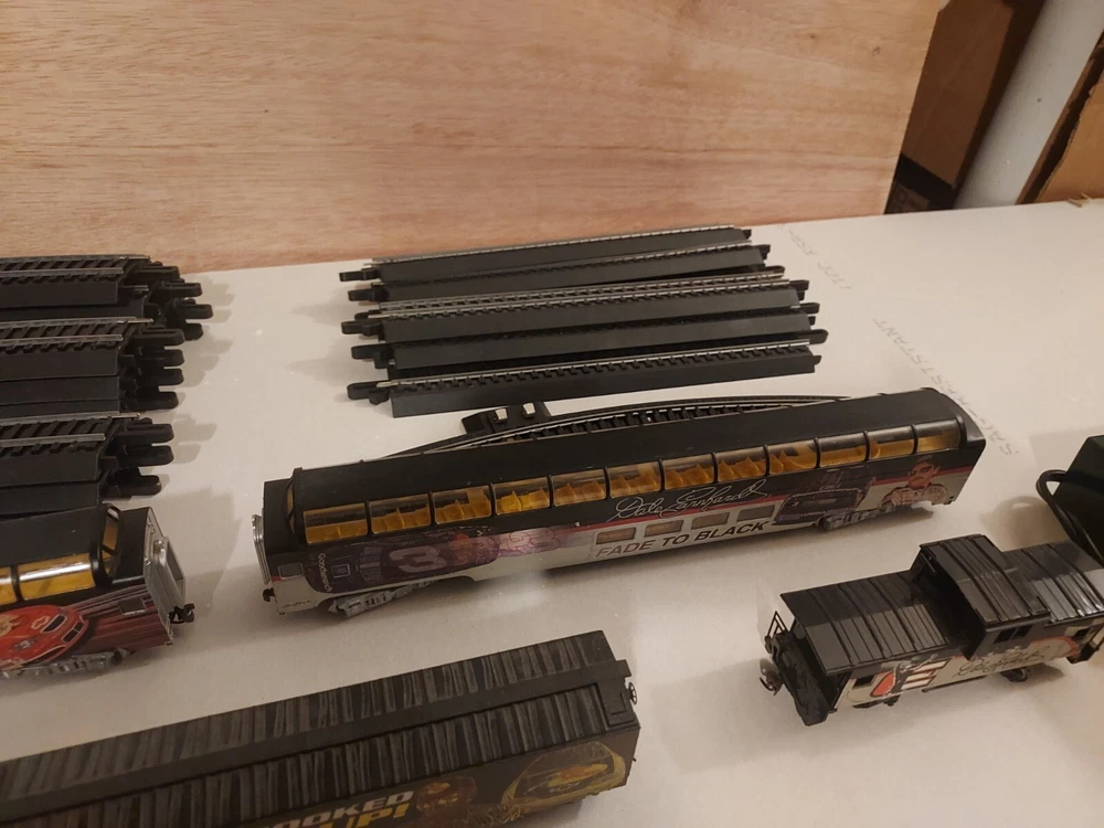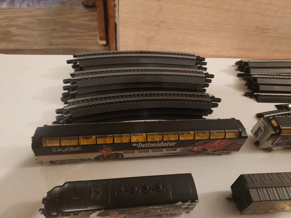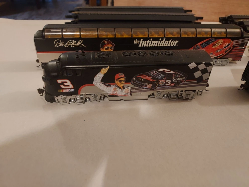 LIKE NEW, TRACK IS NEW, Come with Locomotive, 2 full dome cars - The Intimidator and Fade to Black, Hooked up box car, Caboose, and power pack. All in like new to new condition. Certificates of authenticity included! Everything you need to run this rare Dale earnhardt train set! Get ready to race with this Ho Scale Dale Earnhardt Train Set! Featuring the legendary driver and his iconic car, this set is a must-have for any NASCAR fan. The intricate details and high-quality construction make it a great addition to any collection. Whether you're a collector or a fan, this train set is sure to impress. With its realistic design and attention to detail, it's the perfect way to celebrate the legacy of Dale Earnhardt. So why wait? Add this Ho Scale Dale Earnhardt Train Set to your collection today!