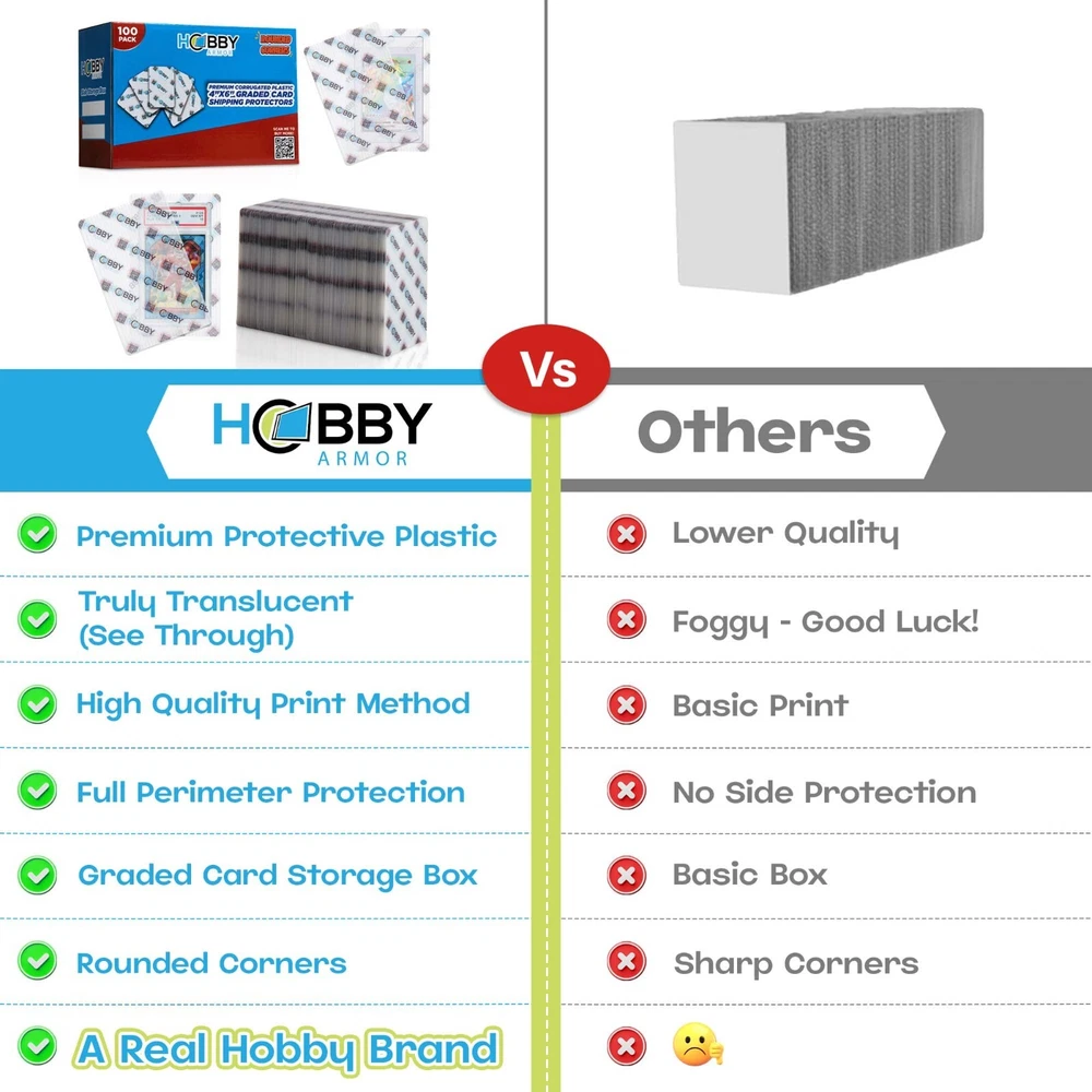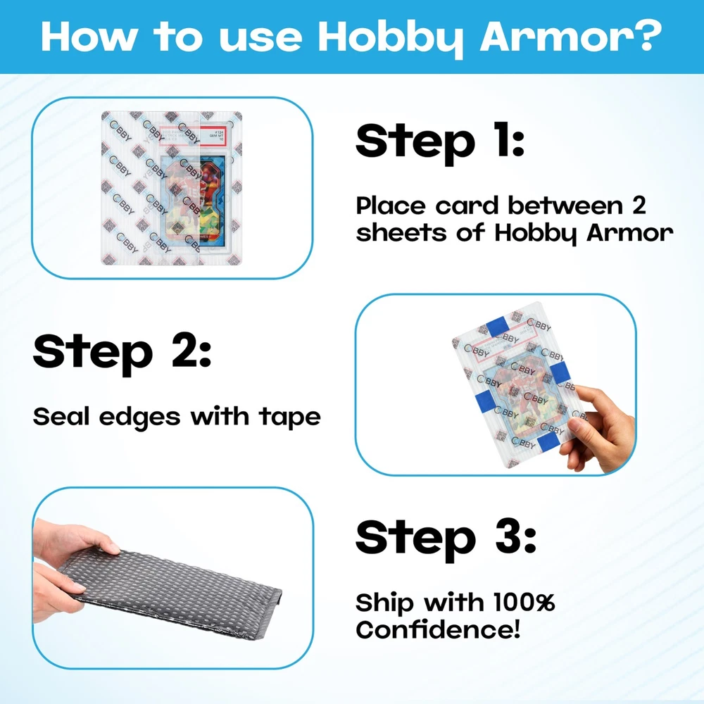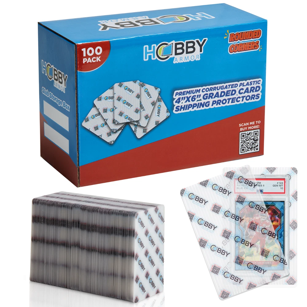 Hobby Armor Premium Plastic Graded Trading Card Shipping Protector 4x6, 100 Pack, Trading Card Shipping Supplies, Cardboard Sleeves Alt, Trading Card Supplies, Trading Card Packaging Shield Mailers Hobby Armor premium plastic card shipping protectors provide exceptional protection for your trading card shipments. These corrugated plastic shields are specifically designed for shipping graded cards and for submitting cards for grading Each shipping protector is 4x6 inches and only weighs 0.4 ounces! Hobby Armor card protectors also feature rounded edges, making them ideal for loading into bubble envelopes. Plastic inserts are suitable for shipping in #0 or #00 bubble mailers Our material is not only highly protective, but also extremely translucent (See Through). This enables easy visibility of the card inside. Our design features multiple colors and has a vibrant, professional look for your customers. Dress to impress! Premium Box of 100 Sleeves - Trading card packaging you can trust. Card mailers for trading cards are perfect for sports and TCG card breakers. Trading card mailer is great for frequent card shippers. Premium Baseball card mailers All Hobby Armor products are designed by card collectors, for card collectors. We are collectors in the hobby, just like you! Our goal is to bring innovation to the trading card world. We want to sincerely thank you for supporting a Real Hobby Brand! HAPPY COLLECTING!