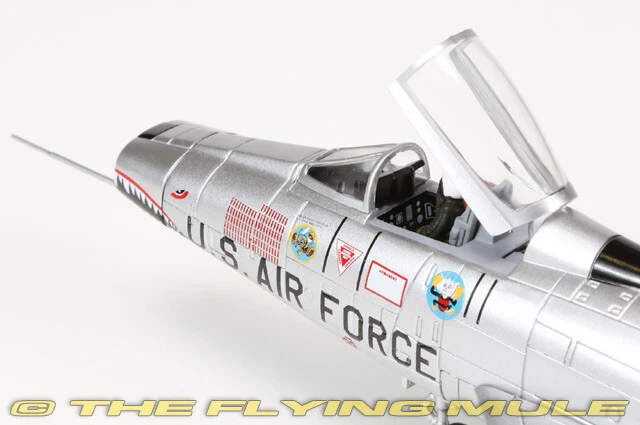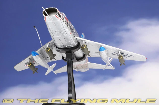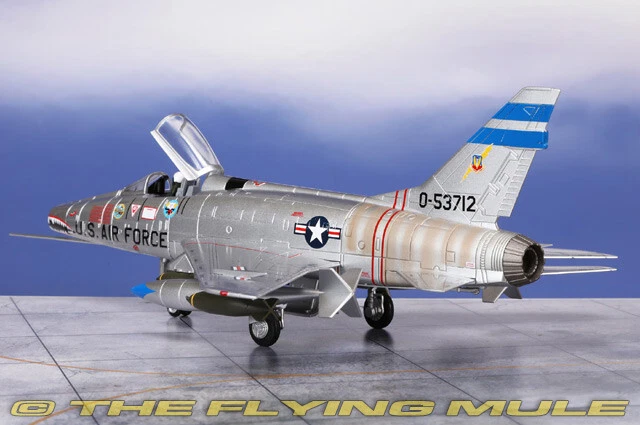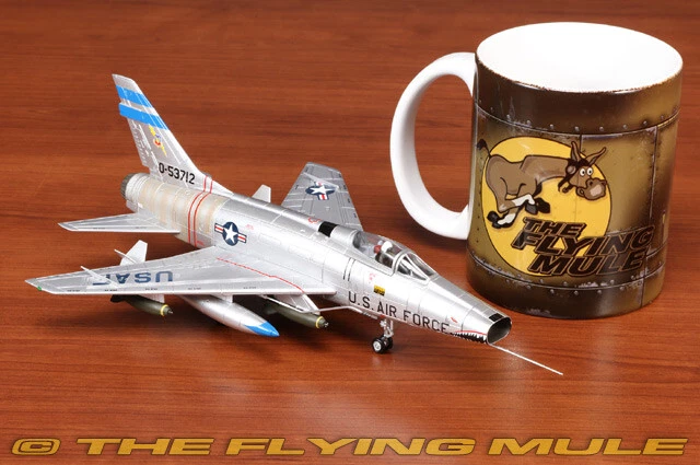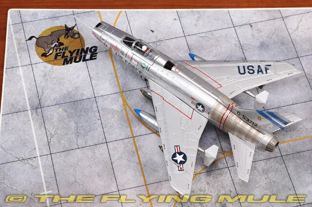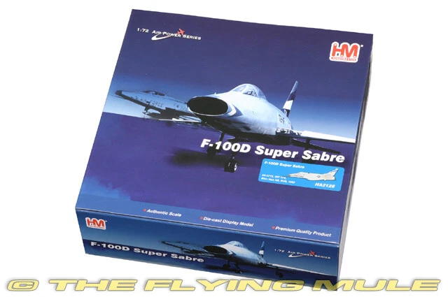 Hobby Master 1:72 Air Power Series HA2126 North American F-100D Super Sabre Diecast Model USAF 6251st TFW, 307th TFS, #55-3712, Bien Hoa AB, Vietnam, 1965 Limited Edition 1:72 Scale Length Width North American F-100D Super Sabre 7.75" 6.5" The 6251st Tactical Fighter Wing (TFW) was a provisional unit of the United States Air Force during the Vietnam War, and it operated out of Bien Hoa Air Base in South Vietnam. The F-100D Super Sabre was one of the primary aircraft flown by the 6251st TFW during its deployment. At Bien Hoa Air Base, the 6251st TFW's mission included a variety of combat roles, including providing air support for ground operations, bombing enemy positions, and flying armed reconnaissance missions. Bien Hoa was one of the most important air bases during the Vietnam War, and it was heavily used by U.S. and South Vietnamese forces for air operations against North Vietnamese and Viet Cong forces. North American F-100D Super Sabre Designed as a high-performance evolution of the F-86 Sabre, the F-100 Super Sabre was first flown on May 25, 1953. This swept-wing aircraft was the first in the "Century Series" and the first operational USAF aircraft capable of supersonic speed in level flight. It was adapted for use as a fighter-bomber and was the Air Force's primary close-support aircraft through much of the Vietnam War. Despite its promise, the F-100 proved to be a dangerous aircraft, by the end of its USAF service in 1972, a total of 889 F-100s had been lost in accidents, claiming the lives of 324 pilots. © Copyright 2003-2024 The Flying Mule, Inc. Hobby Master's 1:72 scale F-100 Super Sabre is constructed almost entirely from diecast metal, with only the smallest amount of plastic used. The fuselage is almost seamless, with a hinged articulating canopy that opens for viewing of the cockpit interior. The engine intake has near-razor sharp edges with an unusually long pitot tube, and the surface surrounding the engine is correctly unpainted. The wing has crisp panel lines, hand-painted navigation lights and a complete set of ordnance including rocket, bombs and fuel tanks. Variants include the A, C and D; the D features a larger wing, aerodynamic fences on the wings and two types of refueling probes. © Copyright 2003-2024 The Flying Mule, Inc. Hobby Master 1:72 Air Power Series The Hobby Master "1:72 Air Power Series" range presents detailed, ready-made diecast models of military aircraft. Hobby Master "1:72 Air Power Series" diecast airplanes feature: Diecast metal construction with some plastic components. Realistic panel lines, antennas, access panels and surface details. Pad printed markings and placards that won't fade or peel like decals. Presentation stand to display the aircraft "in flight". Accurately detailed underside with concealed screwheads. © Copyright 2003-2024 The Flying Mule, Inc.