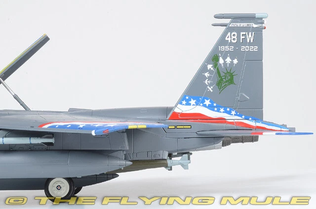 Hobby Master 1:72 Air Power Series HA4539 Boeing F-15E Strike Eagle Diecast Model USAF 48th FW, #92-0364 Liberator, RAF Lakenheath, England, 48th FW 70th Anniversary 2022 Limited Edition 1:72 Scale Length Width Boeing F-15E Strike Eagle 10.75" 7.25" The 48th Fighter Wing is part of the United States Air Force's Third Air Force, assigned to Headquarters Air Command Europe and United States Air Forces in Europe (USAFE). It is based at RAF Lakenheath, England. The 48 FW is the only F-15 wing based in Europe which hosts two F-15E Strike Eagle squadrons. The wing also hosts two F-35A Lightning II squadrons. The 48 FW was given the name "Statue of Liberty Wing" on 4 July 1954 and remains the only U.S. Air Force unit with both a name and a numerical designation. Boeing F-15E Strike Eagle Designed to meet US Air Force requirements for an air superiority fighter to replace the F-4 Phantom, the F-15 Eagle first flew on July 27, 1972. Following reviews of proposals, the United States Air Force selected McDonnell Douglas's design in 1969 to meet the service's need for a dedicated air superiority fighter. Since entering service in 1976, it is among the most successful modern fighters, with over 100 victories and no losses in aerial combat, with the majority of the kills by the Israeli Air Force. © Copyright 2003-2024 The Flying Mule, Inc. Hobby Master's 1:72 scale F-15 is produced with a high metal content using state-of-the-art manufacturing techniques. The model features near seamless construction as seen on all Hobby Master products, and this is particularly evident with the tight-fitting conformal fuel tanks present on the F-15E variant. Separate open and closed canopy and speed brakes are included, yielding uncompromising detail that functional hinges would lack at this scale. Other fine features include a detailed cockpit interior, a variety of ordnance and drop tanks appropriate to the paint-scheme and landing gear that constructed as completed subassemblies for easy installation. © Copyright 2003-2024 The Flying Mule, Inc. Hobby Master 1:72 Air Power Series The Hobby Master "1:72 Air Power Series" range presents detailed, ready-made diecast models of military aircraft. Hobby Master "1:72 Air Power Series" diecast airplanes feature: Diecast metal construction with some plastic components. Realistic panel lines, antennas, access panels and surface details. Pad printed markings and placards that won't fade or peel like decals. Opening canopies, revealing detailed cockpit interiors. Interchangeable extended/retracted landing gear. Presentation stand to display the aircraft "in flight". Authentic detachable ordnance loads complete with placards. Accurately detailed underside with concealed screwheads. © Copyright 2003-2024 The Flying Mule, Inc.