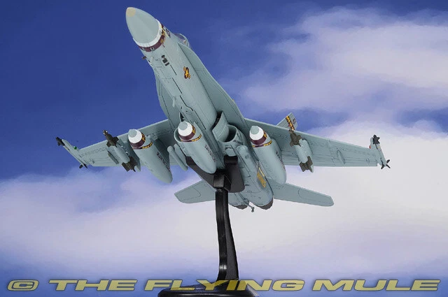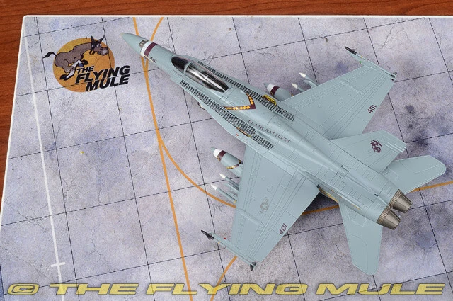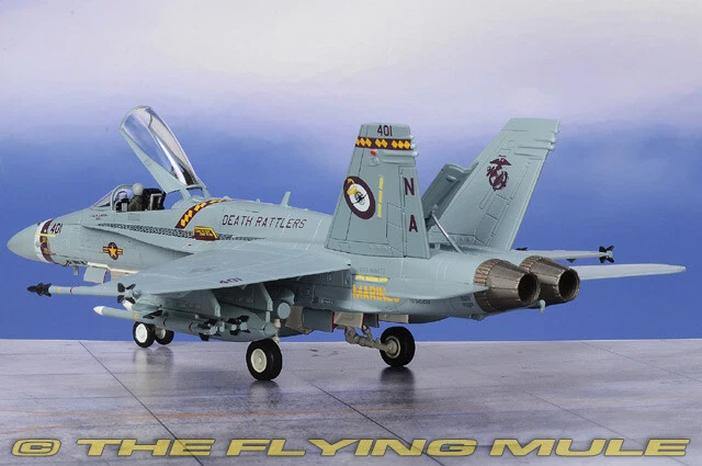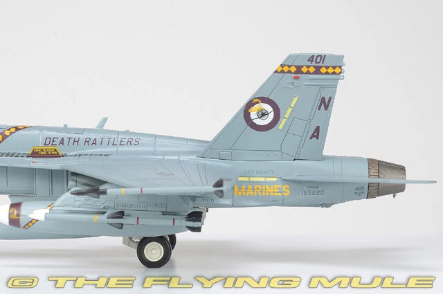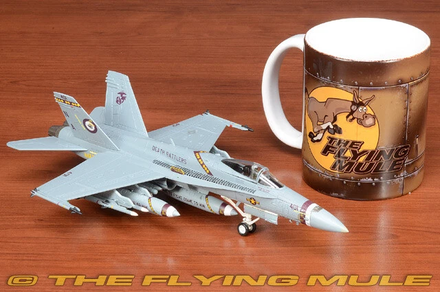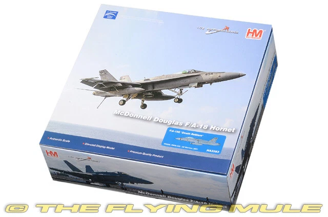 Hobby Master 1:72 Air Power Series HA3583 McDonnell Douglas F/A-18C Hornet Diecast Model USMC VMFA-323 Death Rattlers, NA401, USS Nimitz, 2021 Limited Edition 1:72 Scale Length Width McDonnell Douglas F/A-18C Hornet 9.25" 6.25" Marine Fighter Attack Squadron 323 (VMFA-323) is an aircraft carrier-based aviation squadron of the United States Marine Corps. The squadron is equipped with the McDonnell Douglas F/A-18C Hornet and is based at Marine Corps Air Station Miramar, California, United States. McDonnell Douglas F/A-18C Hornet Designed as a replacement for the A-4 Skyhawk and the A-7 Corsair II and as a complement to the F-14 Tomcat, the F/A-18 first flew on November 18, 1978. Perhaps best known as the aircraft of the US Navy's Blue Angels, this carrier-capable, supersonic, all-weather fighter has many roles, including fighter escort, fleet air defense and close air support. The F/A-18 is a versatile aircraft: it can operate from carriers or land bases and a single switch converts it from fighter to strike mode. During Operation Desert Storm, the F/A-18 proved that, on a single mission, one aircraft could serve as both fighter and a bomber. © Copyright 2003-2024 The Flying Mule, Inc. Hobby Master's 1:72 scale F/A-18 Hornet is a quality model with many fine features, skillfully designed and manufactured with modern techniques. The canopy can be removed for an unobstructed view of the cockpits pad-printed instrument panel and interior features. A separate canopy with a fixed actuator is included for display in the open position. The speed brake can be configured in the deployed position, and the landing gear and gear doors are constructed as subassemblies for quick and easy ground configuration. The series includes the single-seat F/A-18C and the two-seat F/A-18D. Each release is fitted with removable ordnance appropriate to its mission (see photos). © Copyright 2003-2024 The Flying Mule, Inc. Hobby Master 1:72 Air Power Series The Hobby Master "1:72 Air Power Series" range presents detailed, ready-made diecast models of military aircraft. Hobby Master "1:72 Air Power Series" diecast airplanes feature: Diecast metal construction with some plastic components. Realistic panel lines, antennas, access panels and surface details. Pad printed markings and placards that won't fade or peel like decals. Presentation stand to display the aircraft "in flight". Accurately detailed underside with concealed screwheads. © Copyright 2003-2024 The Flying Mule, Inc.