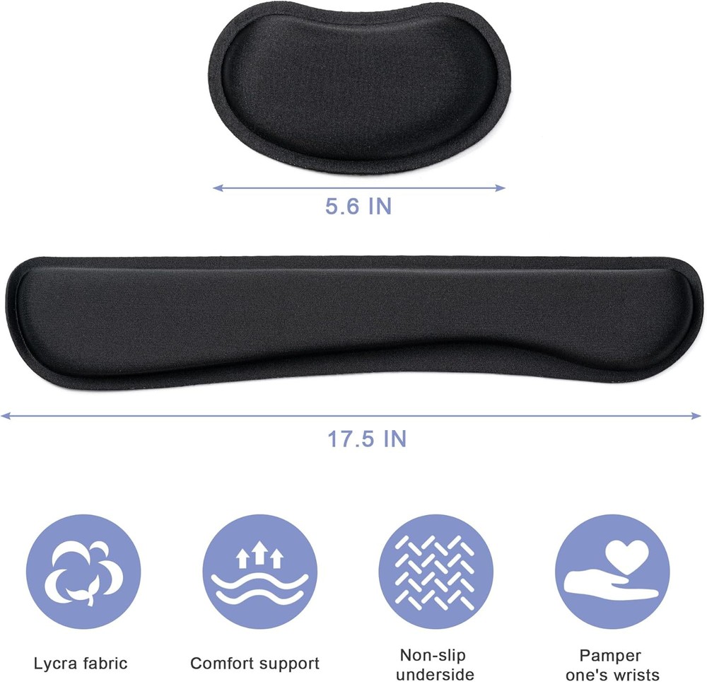 Hoewina Keyboard Wrist Rest,Ergonomic Rest,Superfine Fabric and Black Product Details Brand: Hoewina Item model number: 01 Item Weight: 7.8 ounces Package Dimensions: 17.44 x 3.35 x 1.77 inches Color: Black Manufacturer: Hoewina Country of Origin: China Color: Black Brand: Hoewina Item Weight: 0.22 Kilograms Manufacturer: Hoewina [WRIST PAD FOR KEYBOARD]: 17.5*3.5 inches keyboard wrist rest and 5.6*3 inches mouse wrist rest making it a perfect fit for most desks; Fits most computers and laptops. It can improve the posture of the forearm and wrist, avoid joint and wrist problems, and release pressure on the elbows and shoulders during prolonged use of the computer [MORE COMFORTABLE & SUPPORTIVE]: The keyboard wrist rest set surface is made from a super soft and breathable lycra material, providing you with lightweight, comfortable, durable and skin-friendly touch, ideal for long time use; The inner cushion is made of comfortable memory foam and highly resilient rubber, can rebound slowly and is not easy to deform [NON-SLIP RUBBER BASE]: The bottom is supported by a rubber base, and clear patterns are drawn on it to achieve anti slip effect, providing stable operation for your mouse and keyboard. You can work or play games with ease, without worrying about the pad slipping or moving [ERGONOMIC DESIGN]: Designed to keep your wrist in a straight line with the keyboard and mouse, this ergonomic mouse pad wrist rest set provides comfortable support, it can let you forget sore wrists and fingers when typing and using a mouse [WIDE APPLICATION]: Keyboard pad combo specially designed let it super comfortable, portable fit most computers, notebooks, mouse. Reduce strain on elbows shoulders and make joints and wrists more comfortable for workers, gamers, writers, editors who are engaged at long typing work
