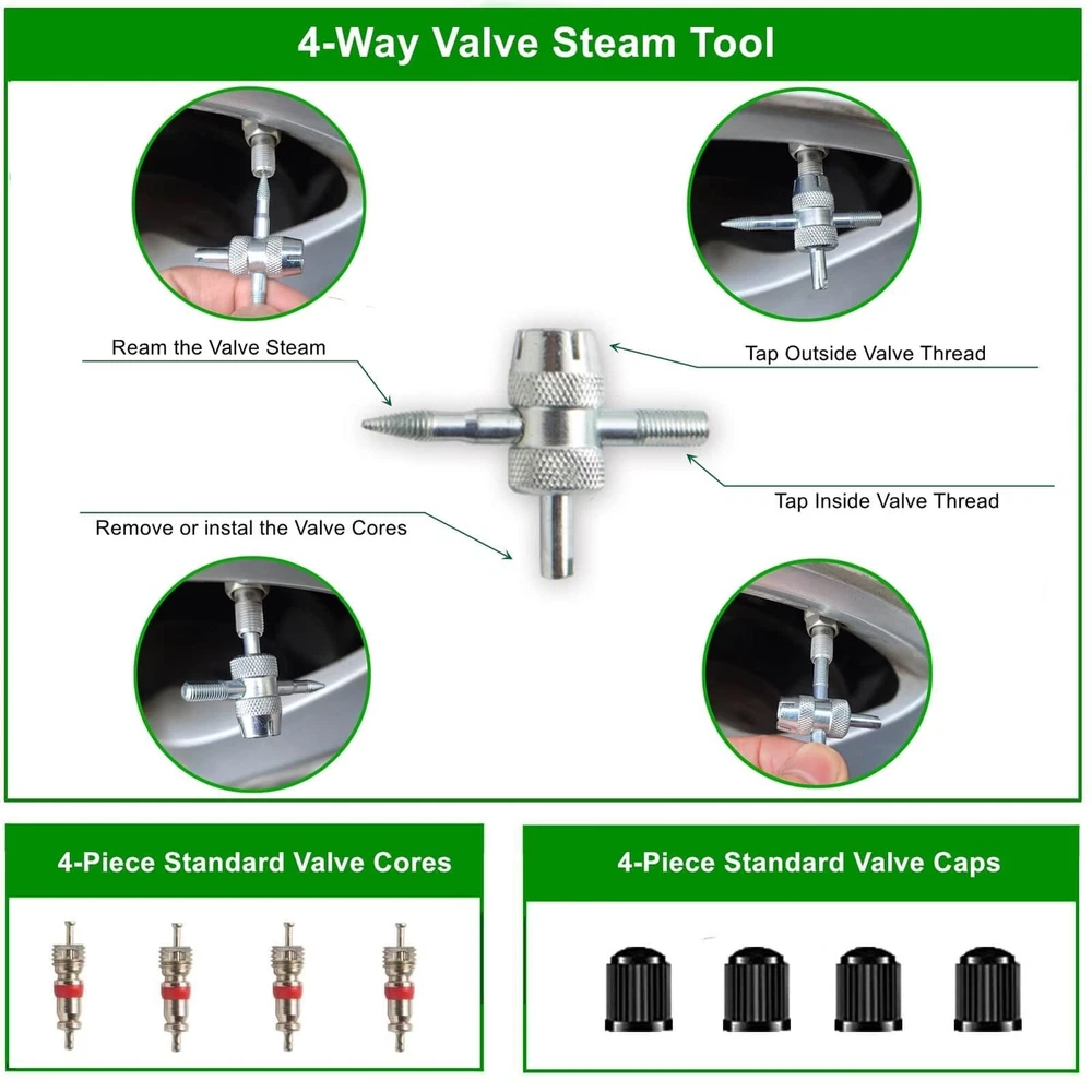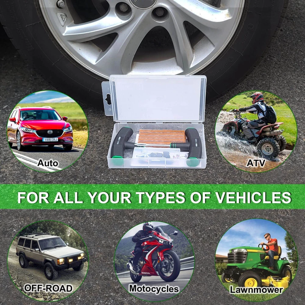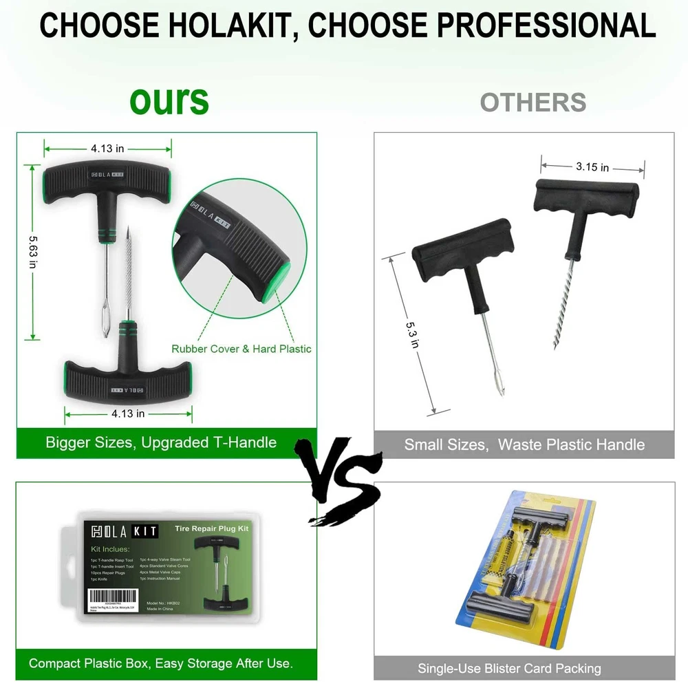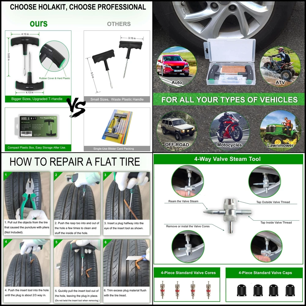 【Emergency Kit for Flat Tire】The Tire Repair Kits can help you get back on the road quickly when you get a flat tire. This tire repair kits is suitable for tubeless tires of cars, SUVs, motorcycles, enduro bikes, or lawn mowers. 【Compact Tire Plug Kit】This tubeless tire repair kit is designed to be packed in compact plastic box. The box fits perfectly into the space of glove box. With a storage box, you can find the kit easily after several time uses 【Upgrade T-handle】 The Handle is 100mm long which is bigger than common T-handle tire patch kit.The material of the handle is made of two layers: hard plastic inside and soft thermoplastic rubber outside. Both of the features will allow you to use it with less effort and comfor 【Bonus of Valve Tools】The tire repair tools includes T-Handle Rasp Tool, T-Handle Insert Tool, 10 x Self-Vulcanization Tire Plugs, Knife. And also include a valve tools set: 4-way valve steam tools, 4 x Standard Valve Cores, 4 x Standard Valve Caps. 【Premium Quality】HolaKit Tire repair kit with plugs are made of refined high quality steel and whole new material, which makes the metal part very hard, while the plastic part is very flexible and pollution-free.