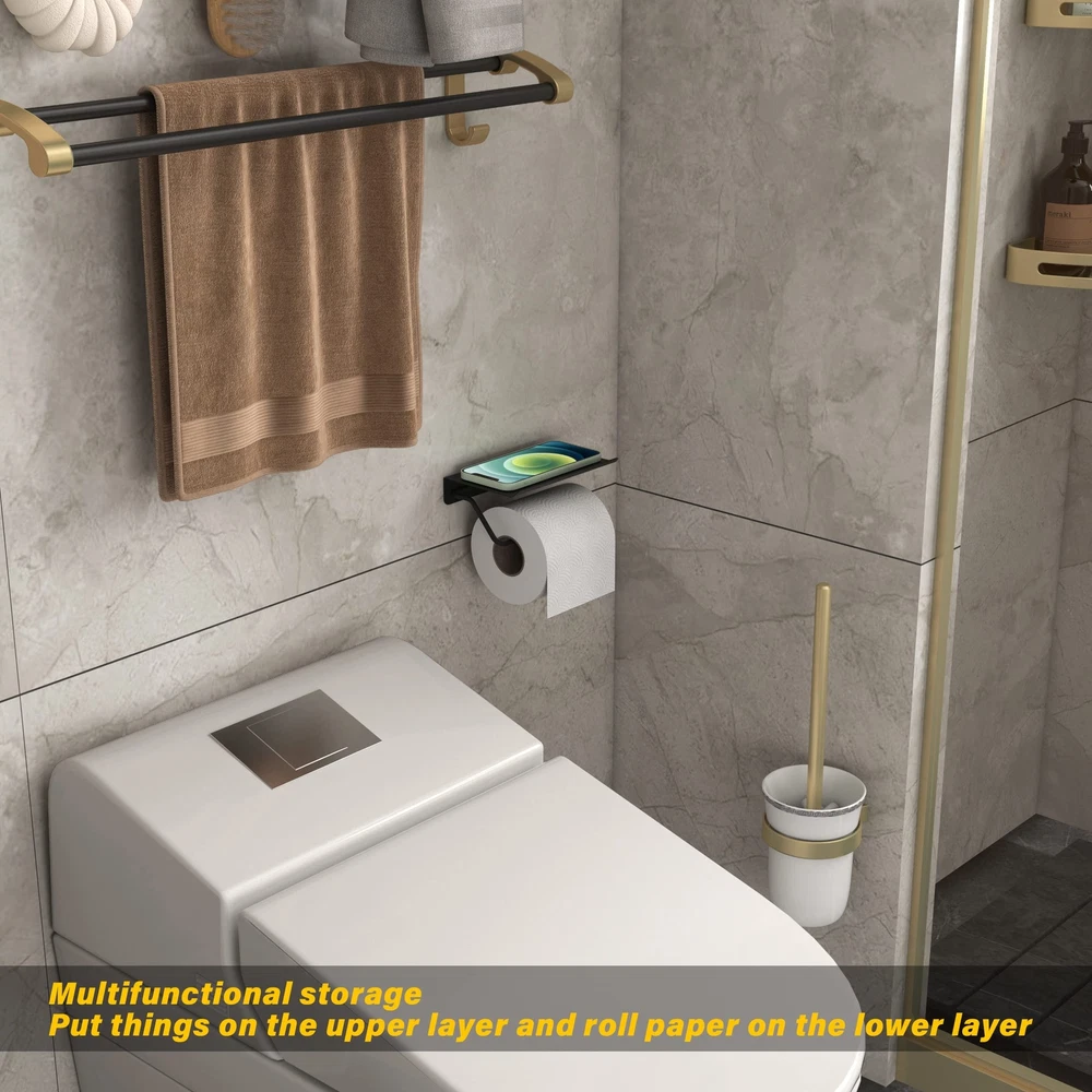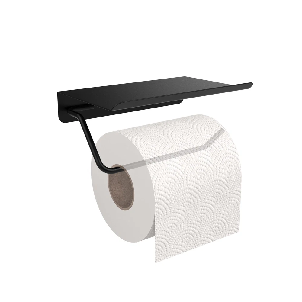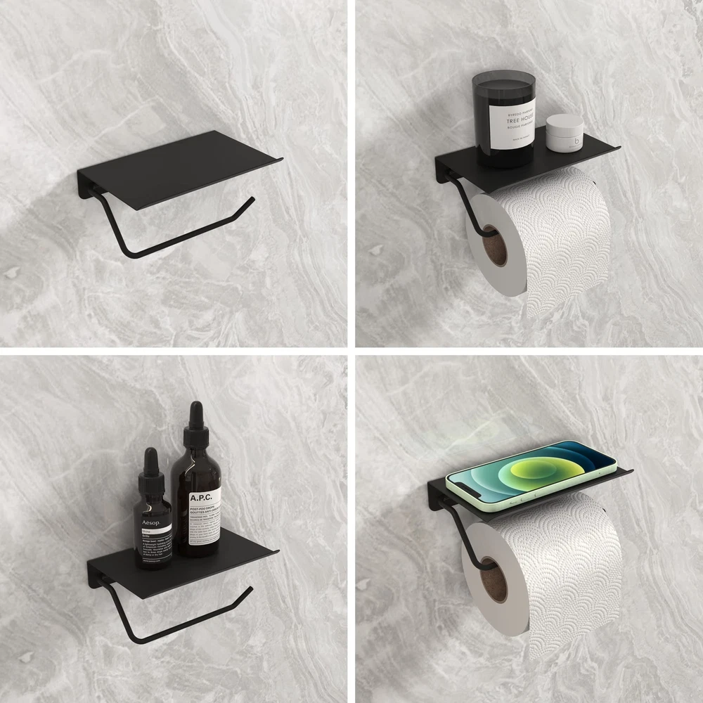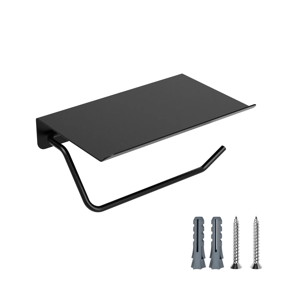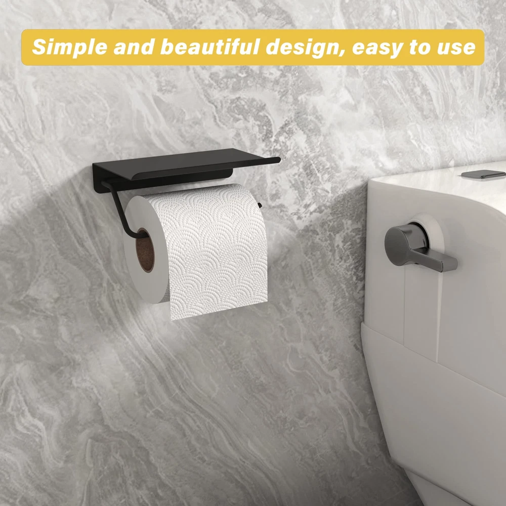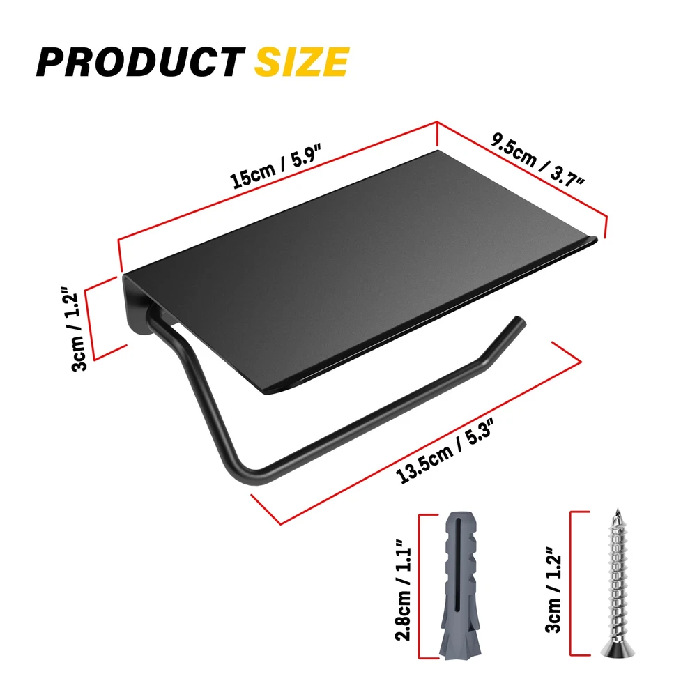 Holder with Shelf, Bathroom Accessories Tissue Roll Dispenser Storage Wall Mounted Matte Black Finished, with other bolded bathroom hardware HUMANIZED DESIGN: Removable Paper Hook. Upward bend edge prevents or things from slipping off. 2 mounting hole distance 3" (77mm) DURABLE: Solid 304 Stainless Steel, great practical value & well made with a nice brushed surface. Handy and Stylish. Sturdy enough with heavy weight: 0.6 lbs. (270 g), load bearing 15 lbs weight. MULTI USE, strong roll holder, plus multipurpose storage shelf! Easily LARGE ENOUGH to hold various items, e.g. cell , Bluetooth speaker, or other small electronics. It fits most of the brand's paper rolls; Please take measurements of your paper roll correctly before purchasing. Please pay attention to installing it in the appropriate position, according to actual needs.