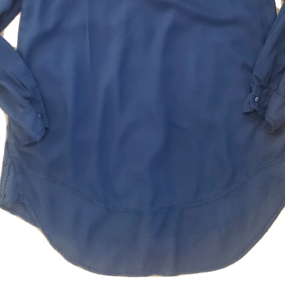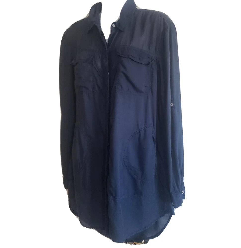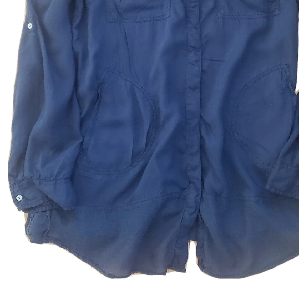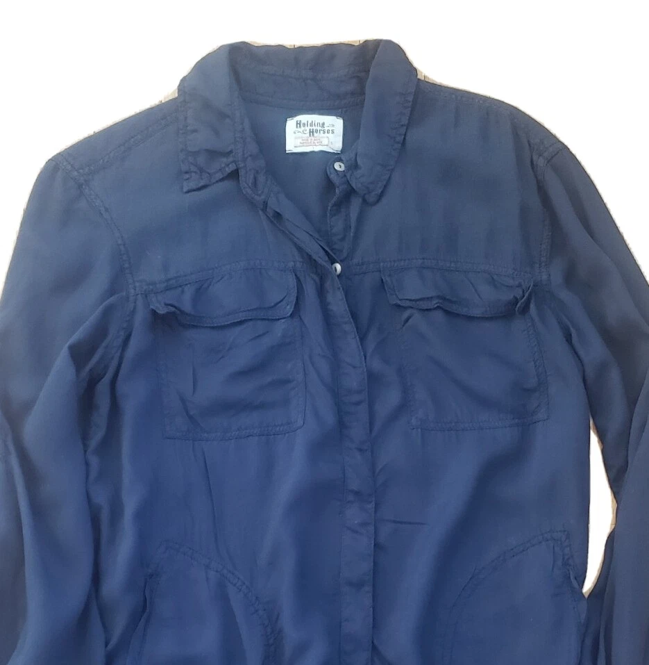 Womens Holding Horses Anthropologie Button Front Tunic Top Good pre-owned condition, no flaws, a hole on seam of button hole column was sewn up, would not be noticable when wearing (see last picture) Top if made front two materials of the same color, a semi-sheer, tightly woven 'net' like material is on shoulders and bottom of shirt, soft opaque material on most of the body. Materials or shirt are rayon and cotton Pockets at hips, flap pockets at chest Button front with hidden buttons Roll tab sleeves Marked a size S Approximate measurements 20 1/4 inches from armpit to armpit 31 inches in length from top of shoulder to bottom of hem
