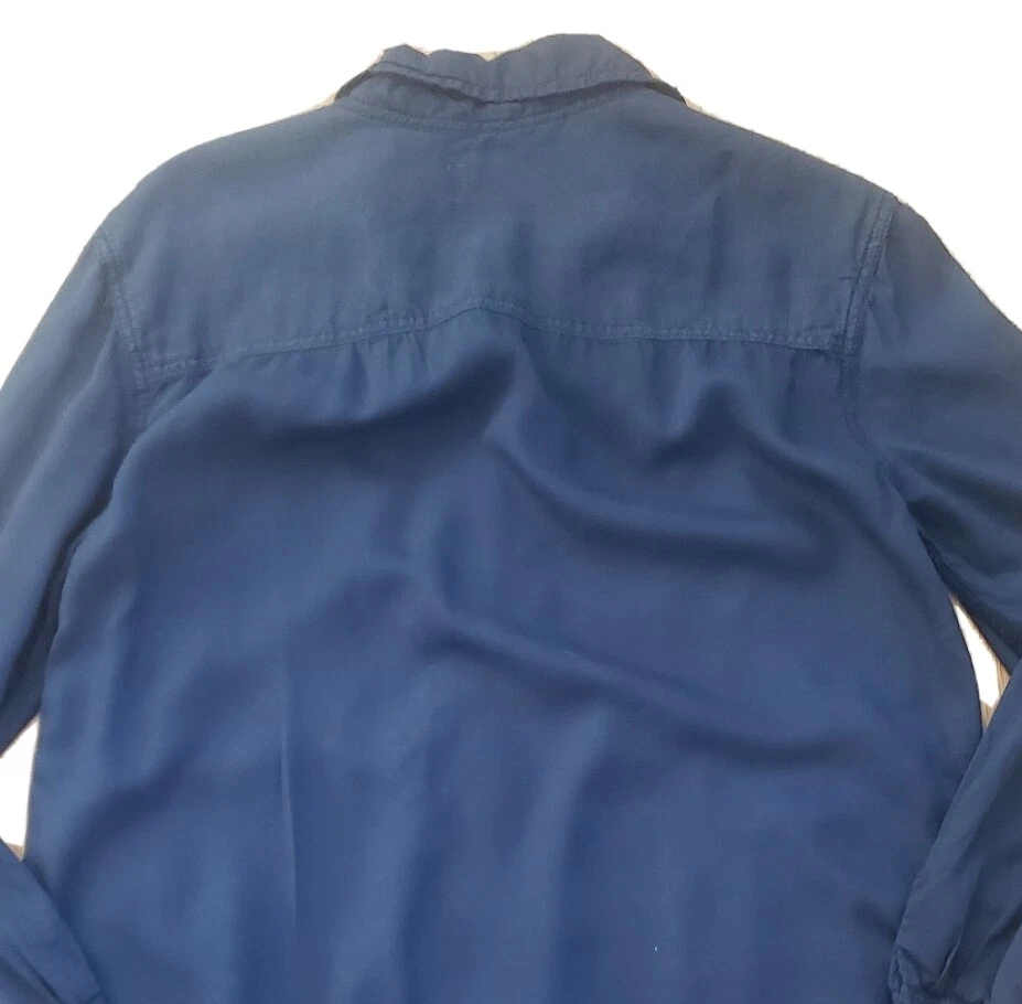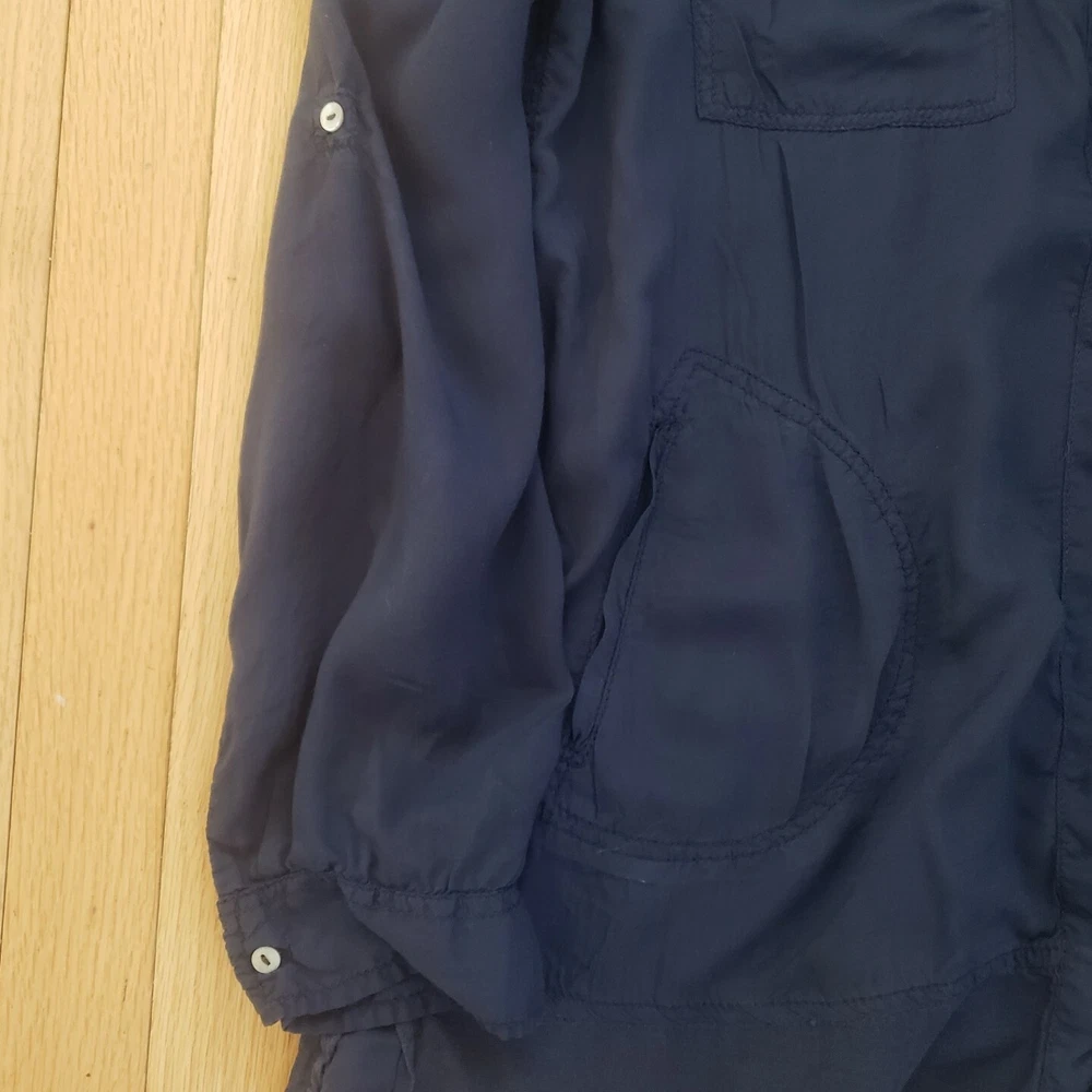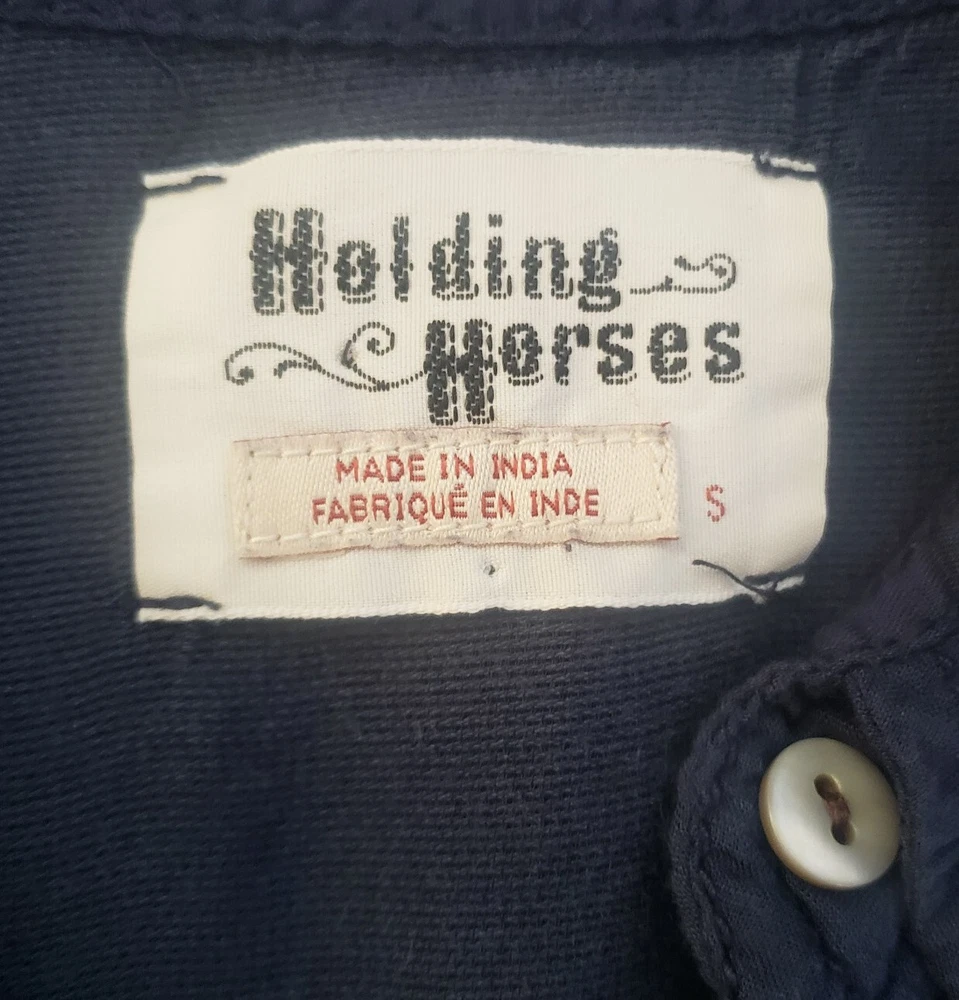 Womens Holding Horses Anthropologie Button Front Tunic Top Good pre-owned condition, no flaws, a hole on seam of button hole column was sewn up, would not be noticable when wearing (see last picture) Top if made front two materials of the same color, a semi-sheer, tightly woven 'net' like material is on shoulders and bottom of shirt, soft opaque material on most of the body. Materials or shirt are rayon and cotton Pockets at hips, flap pockets at chest Button front with hidden buttons Roll tab sleeves Marked a size S Approximate measurements 20 1/4 inches from armpit to armpit 31 inches in length from top of shoulder to bottom of hem