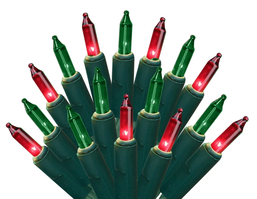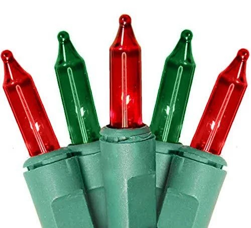 Holiday Pride 100 Red & Green Bulb Light String Set with Green Wire. UL Listed - Conforms to UL Standards. Safe for Indoor & Outdoor Use - 120 Volt. This Light Set consists of 2 independent circuits of 50 lights. Each circuit can be made to steady burn or flashing mode by replacing a regular bulb with a Red Tip Flashing Bulb (2 Red Tip Flashing Bulbs are included with this set). Total Length of Light String: 20.75 Feet. Lighted Length: 18.5 Feet. Spacing at the ends: 3.5" end on female adapter - 12" end on male adapter. If bulb burns out the rest will remain lit. Fuse-protected, end-to-end connector allows up to 5 sets to be connected together in a continuous strand. Use these green and red mini lights on windows, trees, wreaths, garlands, outdoor bushes and many more applications! 100 Red and Green Mini Lights with Green Wire - Steady Burn & Flashing Modes UL Listed - For Indoor & Outdoor Use End to End Connectors - 5 Sets Of Light Strings Can Be Connected Together Pre-Tested, Warranted to Light - If 1 bulb burns out, the rest remain lit. - Includes 2 Flasher Bulbs, 2 Regular Bulbs, & 1 Fuse Approximate Lighted Length: 22.6 Feet - Total Length: 24 Feet - 2.75" Spacing between Bulbs - 12" Lead & 3.5" Tail These Red and Green Christmas Tree Lights with Green Wire plug in easily & are perfect for using as Christmas Tree Lights , Patio Lights , Outdoor Bush Lights , Christmas Wreath Lights , or any area where you want to add ambience and a magical glow ! " Holiday Pride: The Brand Preferred by Professional Decorators "