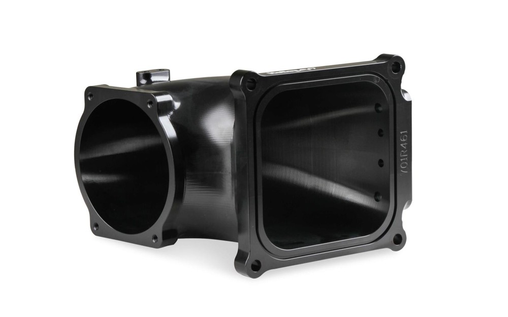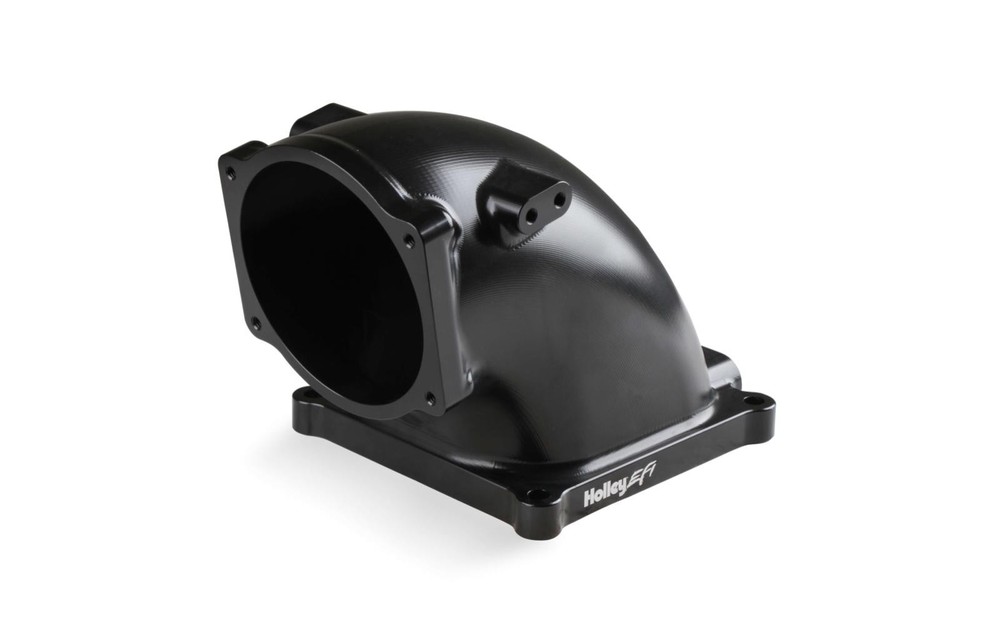 $ImageURL1$ Holley 300-253BK Universal Black Finish Billet EFI Throttle Body Intake Elbow PART NUMBER: 300-253BK BRAND: Holley DESCRIPTION Throttle Body Intake Elbow EFI Throttle Body Intake Elbow 4500 - Fits GM LS Throttle Bodies These machined billet aluminum EFI intake elbows allow the use of GM LS throttle bodies on any intake manifold w/ the 4500 mounting flange. Our design incorporates an optimized transition from the throttle body to the intake plenum for maximum airflow and distribution. Dual throttle cable mounting bracket bosses are included while the 4500 flange pattern allow the elbow & throttle body to be mounted forward, sideways, or rearward. The throttle bracket is included. Features (4) vacuum ports, MAP sensor port, machined / port matched to 4500 gasket, and 100° throttle body angle for extra hood clearance. Includes billet MAP sensor port cover, gaskets & hardware. The port design spacing will also allow a transducer to be used if a MAP sensor is not needed. The intake flange has an o-ring groove for a positive flange seal and the o-ring is included as well. Features: Fits GM LS Throttle Bodies 105mm Throttle Body Opening - 100° Mounting Angle Fits Intakes w/ 4500 Flange- designed to use the included o-ring for sealing The 4500 square flange pattern allows Forward, Sideways or Rearward Throttle Body Mounting LS3 Style MAP Sensor Mounting (4) vacuum ports, MAP sensor port (2) Throttle Linkage Mounting Bosses Machined Billet finish Overall Height 6.38 Black Finish Specs: Brand: Holley EFI Color: Black Emission Code: 3 Engine: GM LS Finish: Black Fuel System Type: EFI Height: 6.3" Material: Billet Aluminum Product Type: Intake Elbow Throttle Bore: 105mm Warranty: Limited 90 Day