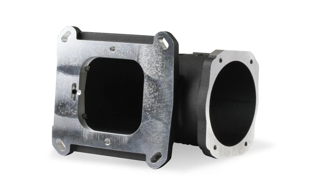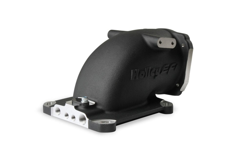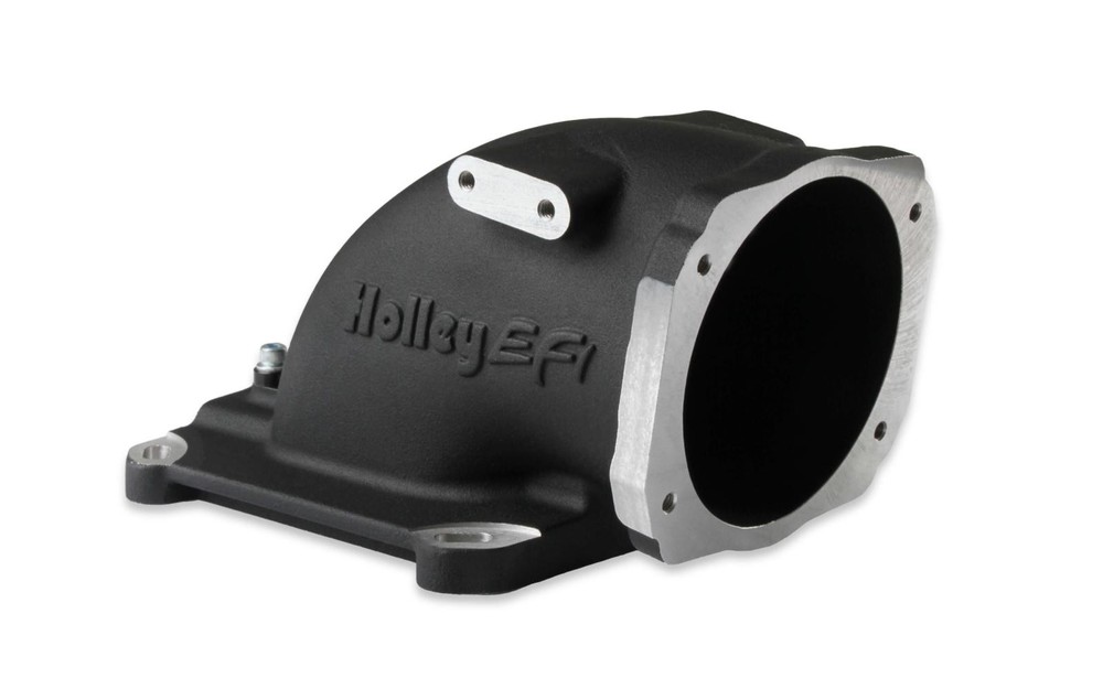$ImageURL1$ Holley 300-240BK Black Finish EFI Throttle Body Intake Elbow for GMC LS PART NUMBER: 300-240BK BRAND: Holley DESCRIPTION EFI Throttle Body Intake Elbow EFI Throttle Body Intake Elbow 4150 - Fits GM LS Throttle Bodies-Black Finish This cast EFI intake elbow allows the use of GM LS throttle bodies on any intake manifold w/ the 4150 mounting flange. Slotted mounting holes & dual throttle cable mounting bracket bosses allow the elbow & throttle body to be mounted forward, sideways, or rearward. Features (4) vacuum ports, MAP sensor port, machined / port matched to 4150 gasket, and 100° throttle body angle for extra hood clearance. Includes MAP sensor port cover, gaskets & hardware. Features: Fits GM LS Throttle Bodies 105mm Throttle Body Opening - 100° Mounting Angle Fits Intakes w/ 4150 Flange Slotted Mounting Holes Allow Forward, Sideways or Rearward Throttle Body Mounting LS3 Style MAP Sensor Mounting (4) Vacuum Ports (1) Each 1/4 NPT & 3/8 NPT & (2) 1/8 NPT w/ Indirect Baffled Signal (2) Throttle Linkage Mounting Bosses Sand Cast w/ Black Finish Overall Height 5.12 Specs: Brand: Holley EFI Color: Black Textured Construction: Cast Emission Code: 3 Engine: GM LS Finish: Black Fuel System Type: EFI Height: 5.12" Product Type: Intake Elbow Throttle Bore: 105mm Warranty: Limited 90 Day