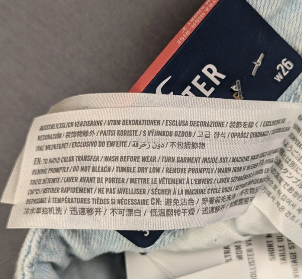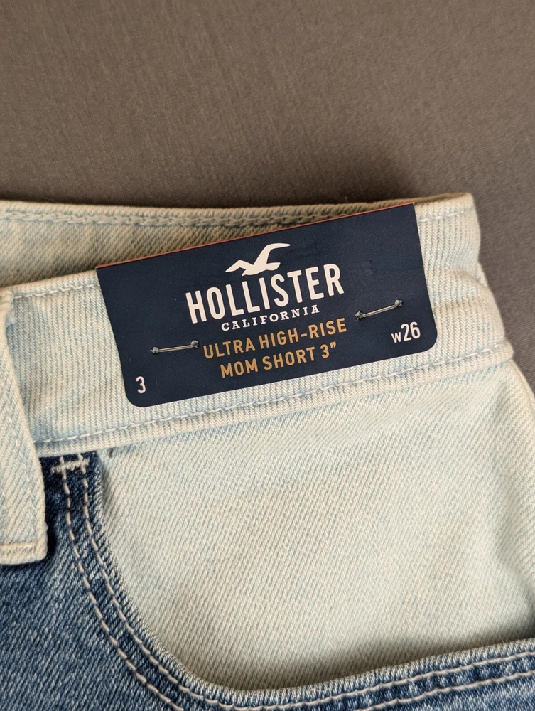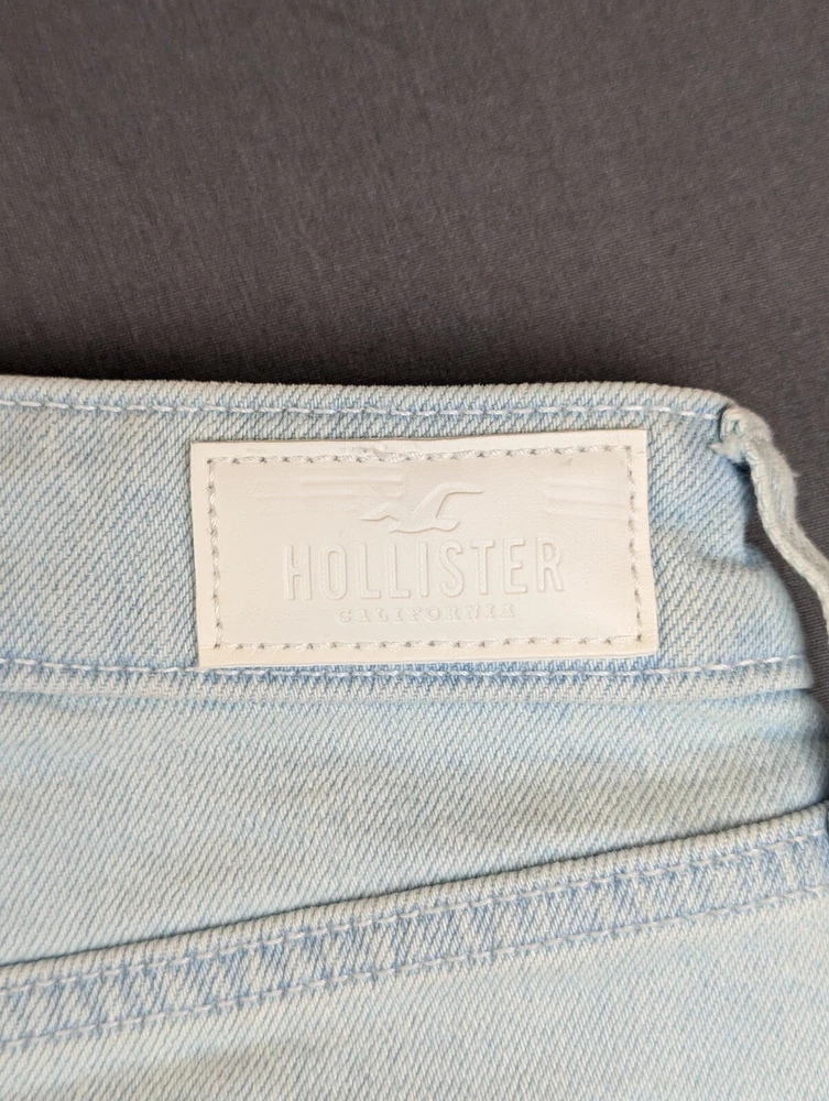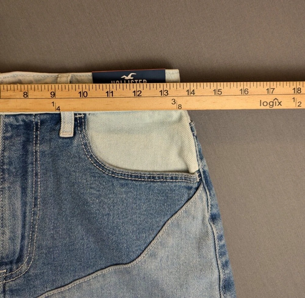 Fabric Type: Denim Material: Cotton Blend Front Type: Flat Front Fabric Wash: Medium Pocket Type: 5-Pocket Design Personalize: No Accents: Logo Rise: High (Greater than 10.5 in) Size: 26 Department: Women Handmade: No Inseam: 3 in Garment Care: Machine Washable Style: Mom Waist Size: 27 in Season: Fall, Spring, Summer, Winter Pattern: Patchwork Brand: Hollister Size Type: Regular Color: Blue Closure: Button Vintage: No Features: Pockets, Stretch