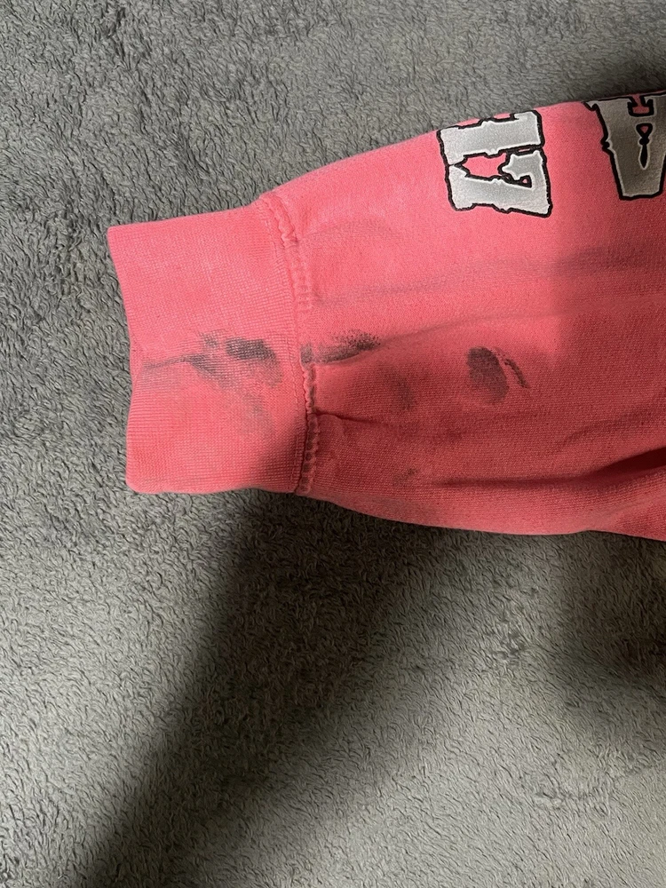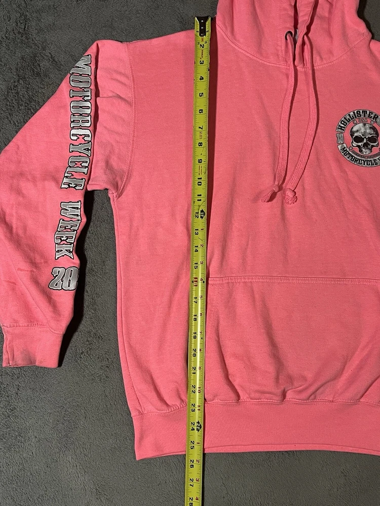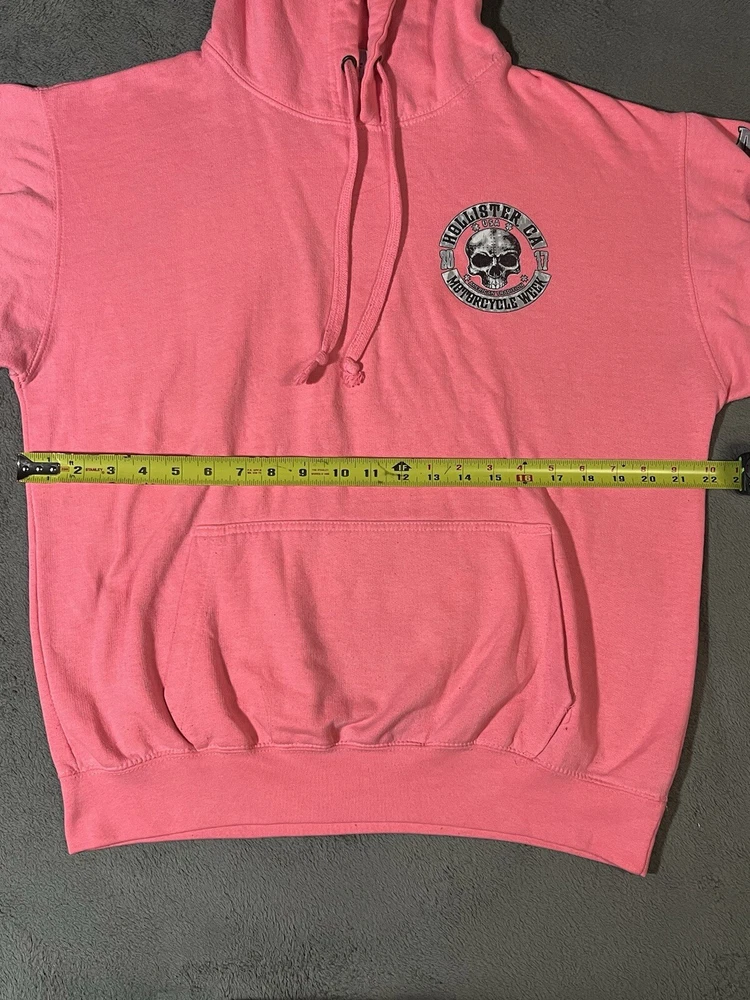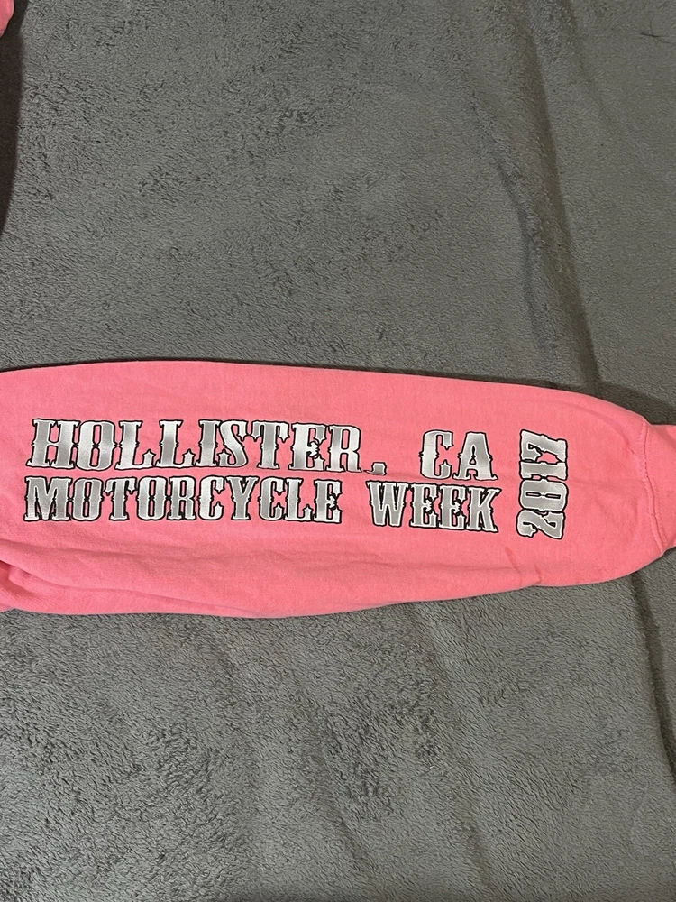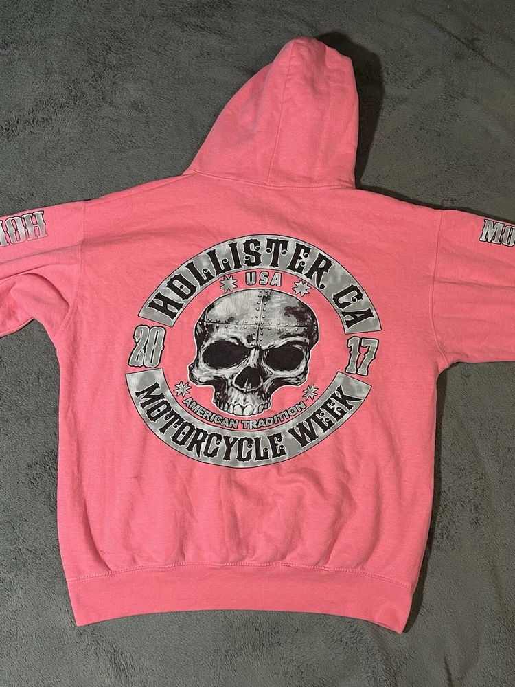 Rev up your style with this Hollister Motorcycle Week 2017 Hoodie. Featuring a pink graphic print with a scull character accent, this unisex hoodie is perfect for biker enthusiasts. The drawstring closure and hooded design add to its functionality, while the polyester and cotton material ensure comfort. The fleece fabric type and logo accents make this hoodie a great addition to your activewear collection. Whether you're hitting the road on your motorcycle or just hanging out with friends, this Esy Surf Co. brand hoodie is sure to turn heads. Available in size M, this pullover hoodie is suitable for both men and women.