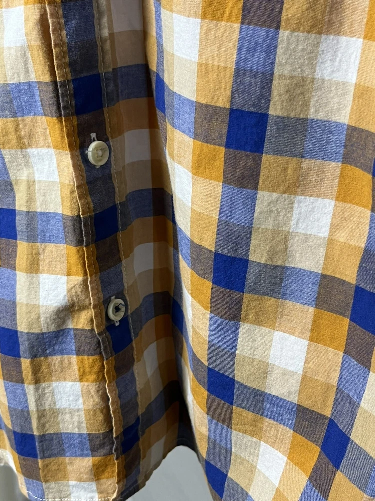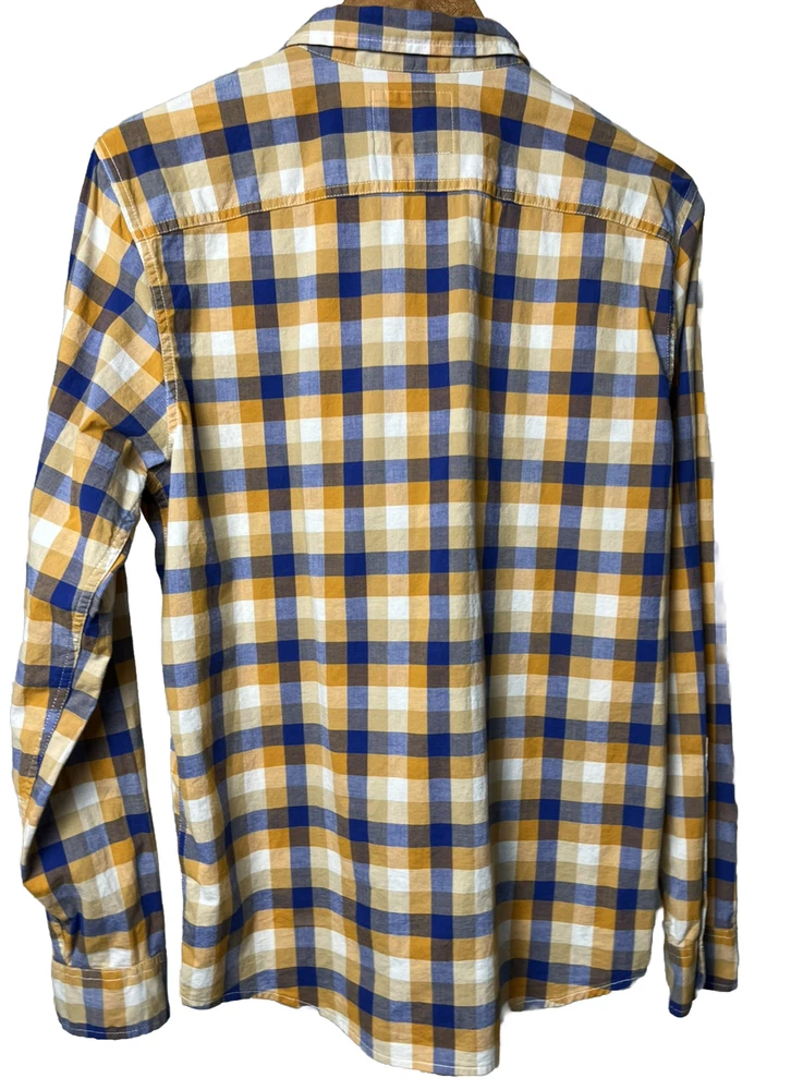 Hollister Shirt Long Sleeve Button Down Collar Blue white Yellow Plaid One Chest Pocket with Logo Men's Size Medium Chest 42, Length 29 Stretch cotton elastine
