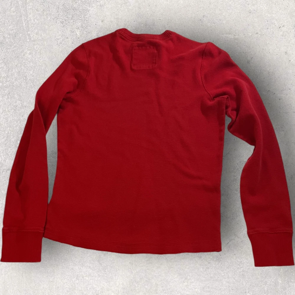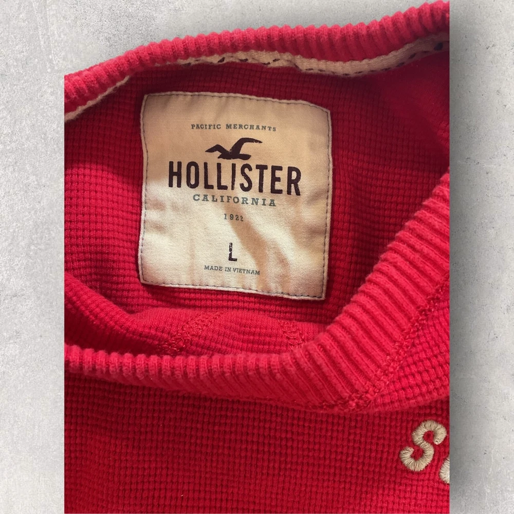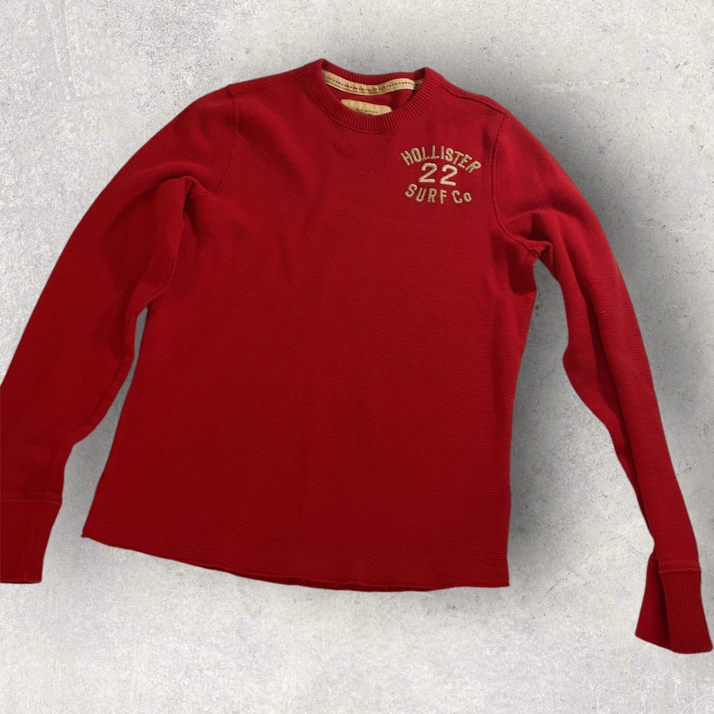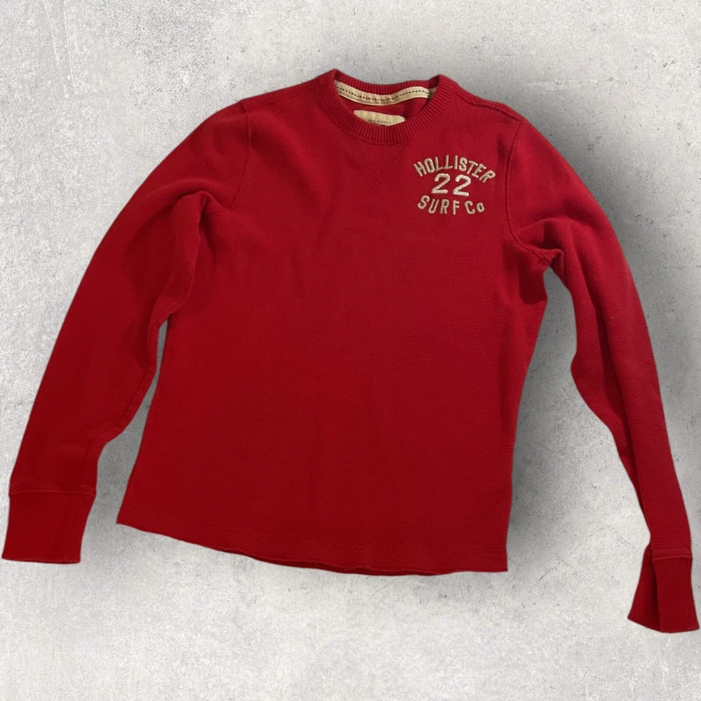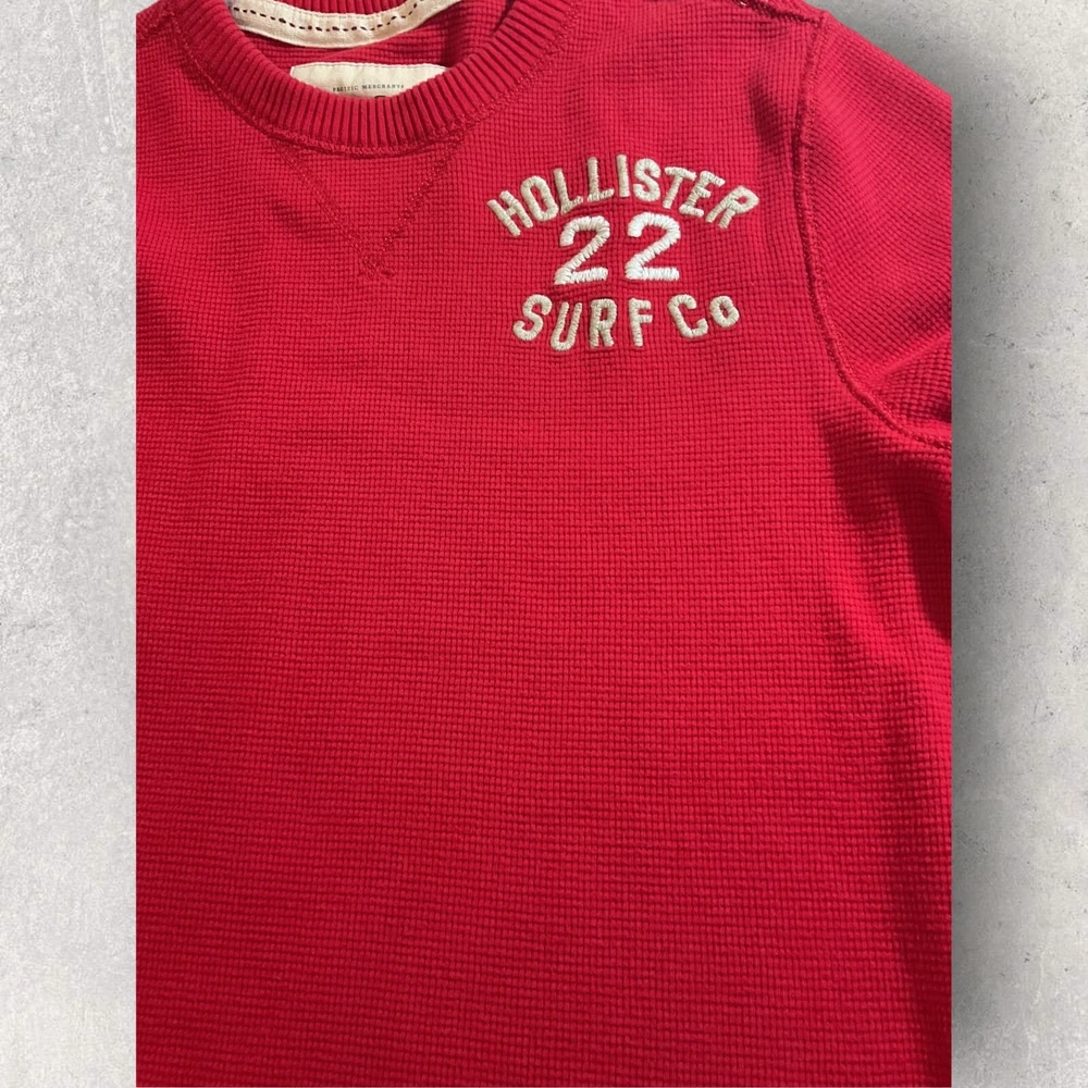 This Hollister sweater is perfect for a casual day out. Made of lightweight cotton material, it features a waffle-knit pattern with a solid design in a vibrant red color. The crew neckline and long sleeves make it suitable for both men and women, while the pullover style adds a touch of convenience. The sweater also includes a Hollister logo accent, adding a touch of branding to your outfit. No flaws. Fits small.