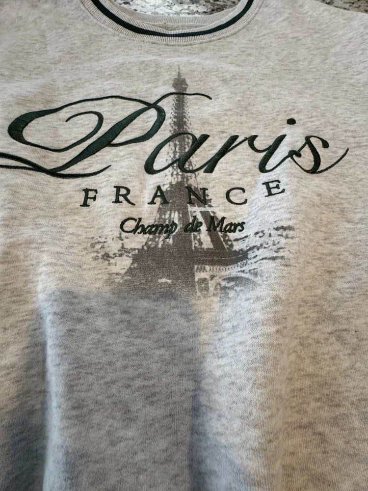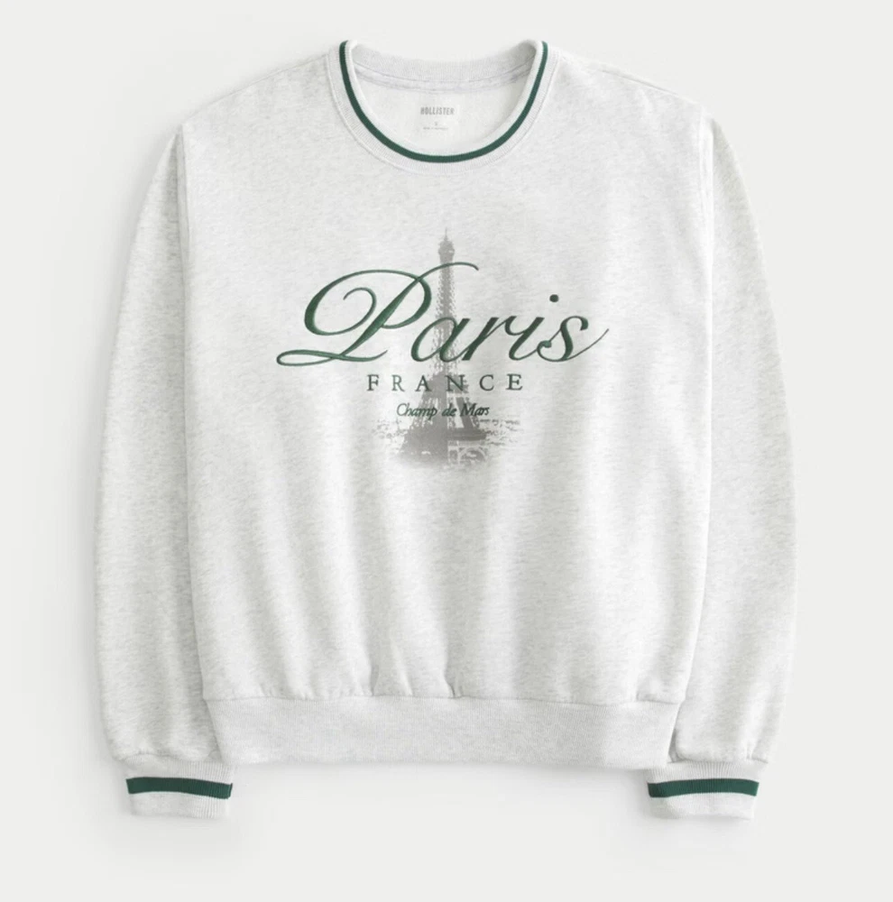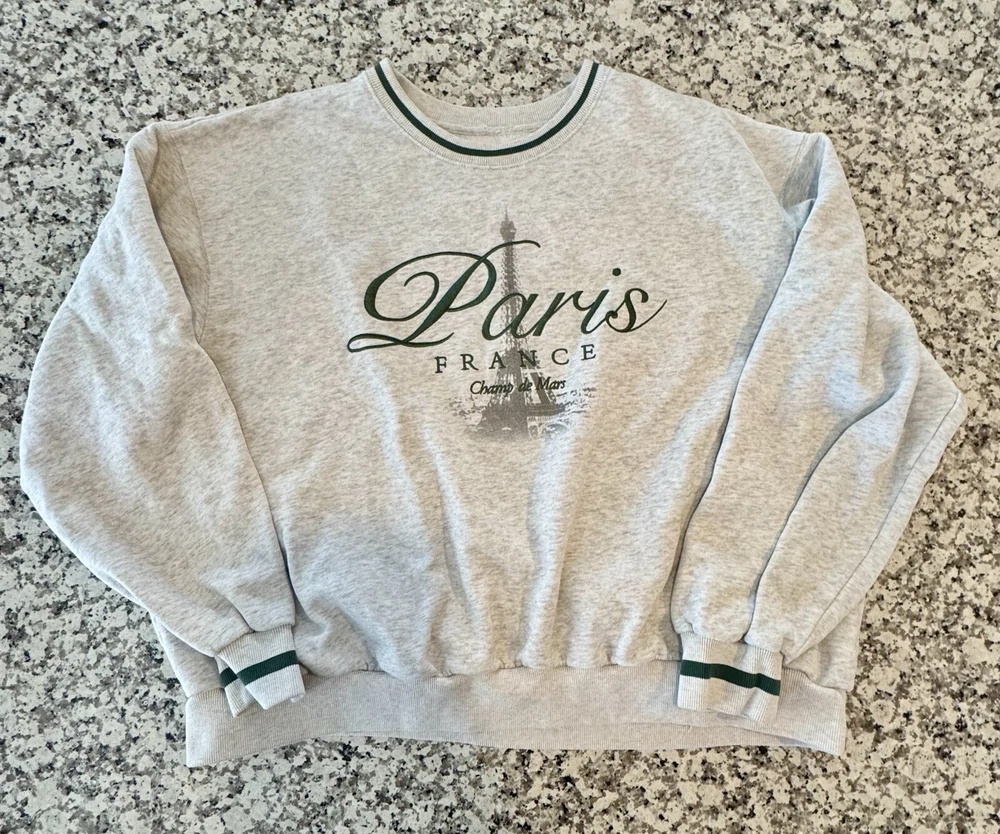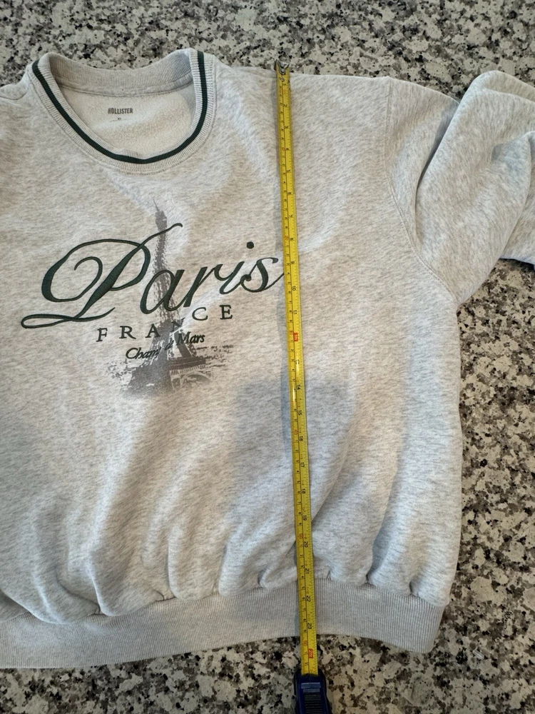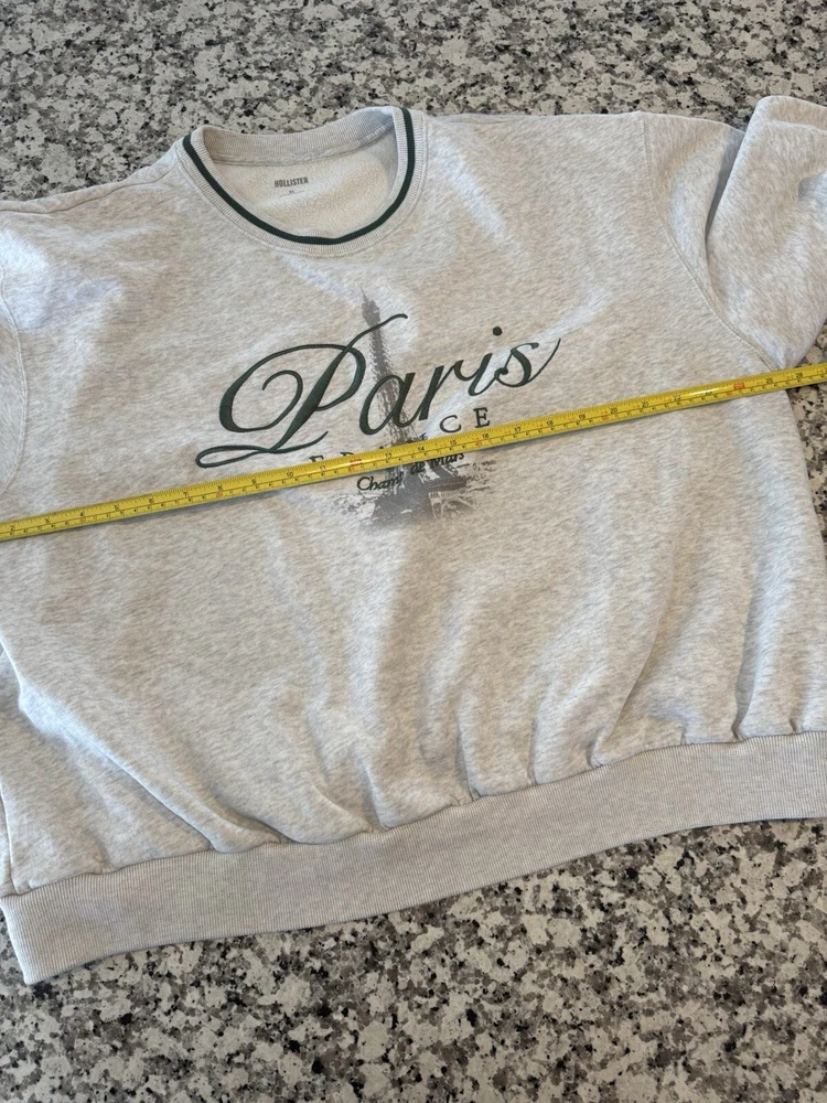 When tag was removed, tiny hole left on inner hem line of neck right above the size/brand print. So cute! Retro, vintage style. Jump right back into the stylish 90s. Very on trend right now! Measurements in photos are estimates only as garment laid flat. No Tears or rips. Be sure to check all photos. Buyer is responsible for reviewing all photos for condition. I do my absolute best to find any flaws prior to listing, and always disclose any that i do find. With that said, there may still be flaws present that were missed unintentionally by human error. All of my items are carefully inspected then stored safely after photos. This ensures you receive the item in the same condition it was photographed. This Hollister Women's Sweatshirt in size XL features an oversized pullover style with a crew neck and long sleeves, making it suitable for all seasons. The sweatshirt is made of a cozy fleece fabric with ribbed details on the neck, cuffs, and hem, and is adorned with an embroidered Eiffel Tower logo, adding a touch of Parisian charm. The color scheme of gray and white, along with the semi-crop design, gives it a stylish and versatile look for activewear or casual wear.