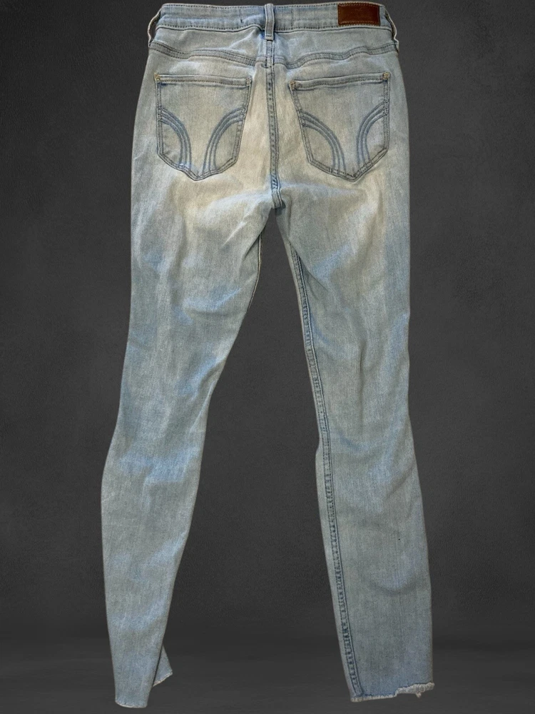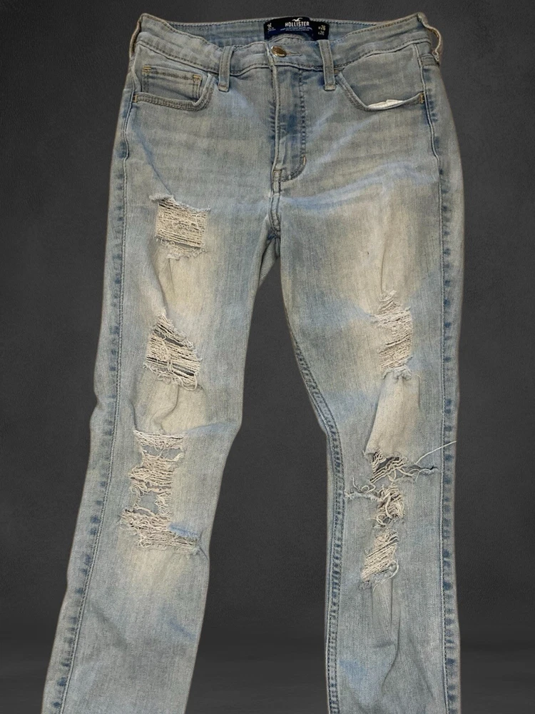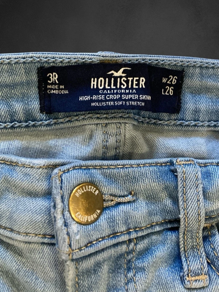 Hollister Women’s High-Rise Crop Super Skinny Jeans W26 L26 | Light Wash Distressed Item Details • Brand: Hollister California • Style: High-Rise Crop Super Skinny • Size: W26 L26 (3R) • Color: Light Blue Wash • Material: Hollister Soft Stretch Denim • Condition: Pre-owned with minor wear (small spot, see photos) • Made In: Cambodia Features • High-Rise Fit: Flattering waistline for a modern look. • Crop Length: Hits above the ankle for a stylish, trendy cut. • Distressed Details: Ripped knees and thigh details for an edgy, casual vibe. • Stretch Fabric: Hollister Soft Stretch ensures comfort and flexibility. • Light Wash: Perfect for summer and casual outfits. Measurements (Flat Lay) • Waist: 26 inches • Inseam: 26 inches • Rise: Approx. 10 inches (mid-rise) • Leg Opening: Super skinny fit These Hollister High-Rise Crop Super Skinny Jeans feature a trendy light wash with distressed detailing for an effortlessly cool look. Designed for comfort, they include Hollister’s Soft Stretch material, ensuring flexibility while maintaining their flattering super skinny fit. Perfect for pairing with sneakers, sandals, or boots, these jeans are versatile for any season! Condition • Gently pre-owned with one small mark on the thigh (see last photo). • Distressed rips are part of the original design. • Overall great condition.