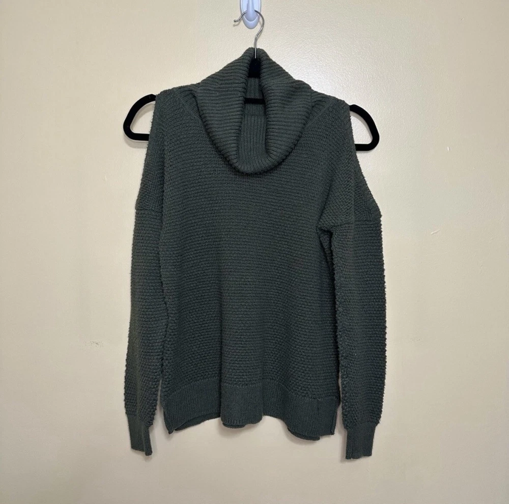 Hollister Womens Med Olive Green Long Sleeve Cold Shoulder Sweater Turtleneck Good pre-owned condition, missing material/care tag. Approximate flat lay measurements: Length-24” Bust-18” Sleeve-24” Elevate your wardrobe with this stylish Hollister sweater. The women's pullover features a solid med olive green color, long sleeves with cold shoulder sleeves, and a turtleneck neckline. The sweater is made from knit fabric that is both open and breathable, making it perfect for fall, winter, and spring seasons.