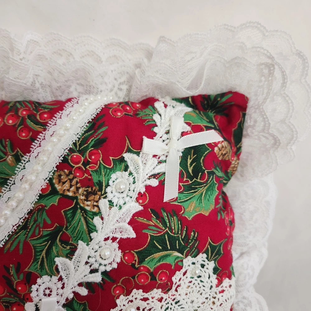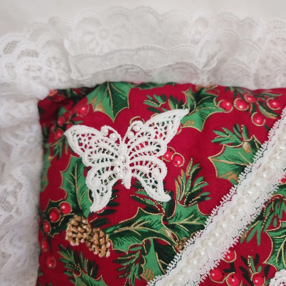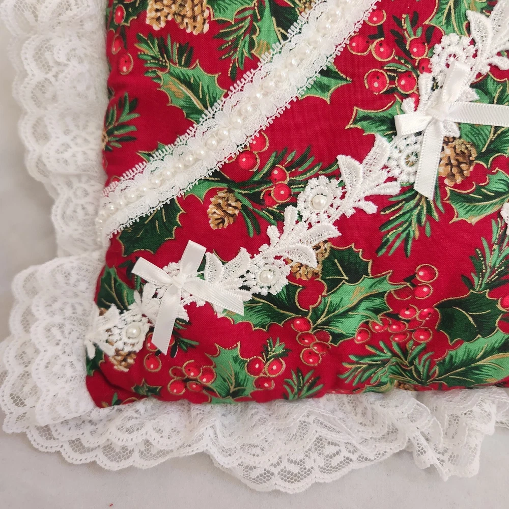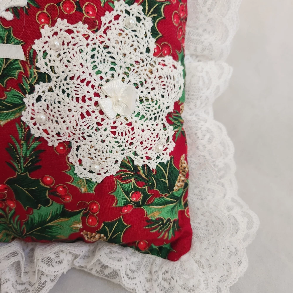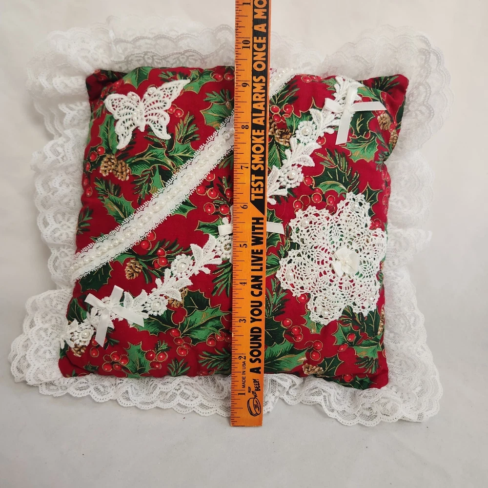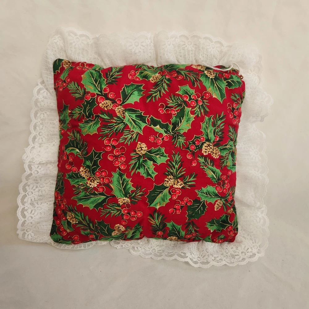 Holly Berry Pinecone Christmas Accent Pillow Holiday Butterfly Ruffle Lace Throw Pillow. Measures about 9.5 x 9.5" without the white lace ruffle around the edge. Hand made. Lightly used with no obvious stains, holes or rips, see pics.