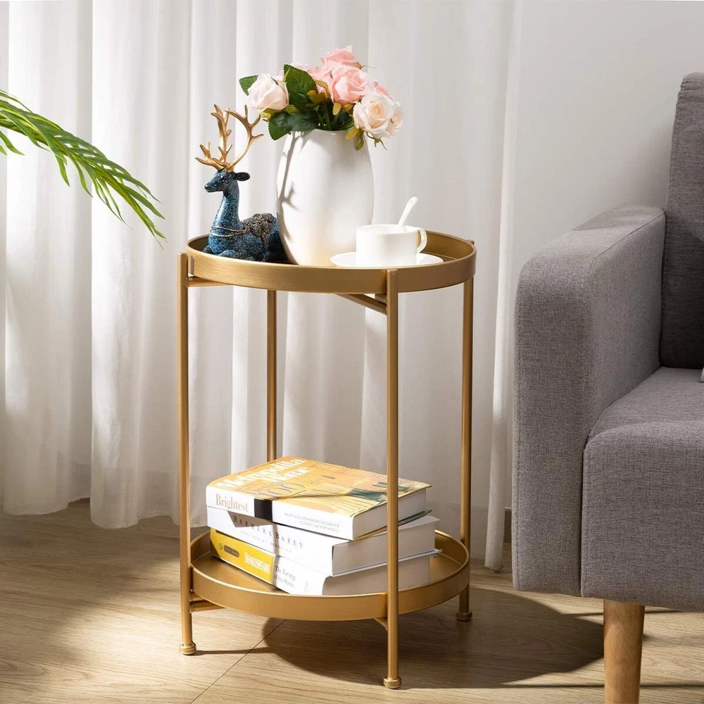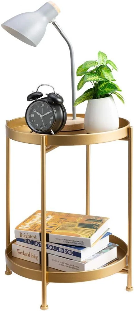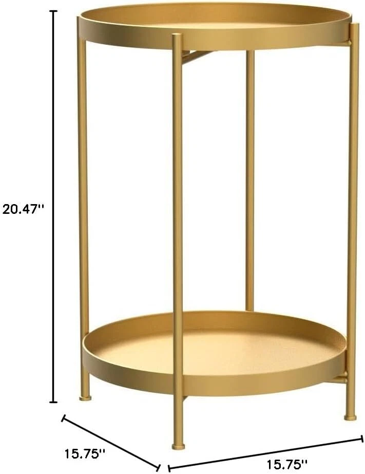 HollyHOME 2-Tier Round Metal End Side Table, Accent Anti-Rust Waterproof Brand HollyHOME Product Dimensions 15.75"D x 15.75"W x 20.47"H Color Gold Maximum Weight Recommendation 6.2 Pounds Product Care Instructions Wipe with Dry Cloth Features [๐๐ฎ๐ซ๐ฅ ๐๐๐ ๐ ๐๐๐ฌ๐ข๐ ๐ง] : Our round end table sports a curled edge design to avoid potential accidents when moving around. [๐๐ฎ๐ซ๐๐๐ฅ๐ ๐๐๐ญ๐๐ซ๐ข๐๐ฅ] : Our small side table is built with anti-rust, waterproof, sturdy metal and powder coating,so end table ensures a lasting durability and waterproof. [๐๐ข๐ ๐ก๐ฅ๐ฒ ๐๐๐ซ๐ฌ๐๐ญ๐ข๐ฅ๐] : Perfect in any room! can be used as a side tables bedroom, coffee table in the living room, nightstand in the bedroom, casual table in the garden or patio, even an outdoor table or plant stand. [๐ ๐๐ข๐๐ซ๐ฌ ๐๐๐ฆ๐จ๐ฏ๐๐๐ฅ๐ ๐๐ซ๐๐ฒ] : Our round accent table has removable tray,it can be used as serving tray around your home.So it is ideal for putting drinks,snacks,books,and other items. [๐๐ฉ๐๐๐ ๐๐๐ฏ๐ข๐ง๐ ] : With a delicate and small footprint, you can easily move our round end table to anywhere. [๐๐๐ฃ๐ฎ๐ฌ๐ญ๐๐๐ฅ๐ ๐๐ง๐ญ๐ข-๐ฌ๐ฅ๐ข๐ฉ] : The adjustable anti-slip mat on each leg can help adjust the height and will protect your floor from scratches. [๐๐ฎ๐ข๐๐ค ๐๐ฌ๐ฌ๐๐ฆ๐๐ฅ๐ฒ] : Thanks to the smart design and easy to follow instructions you can assemble and install our small table in minutes. Our Business 100% Customer Satisfaction We go above and beyond to ensure you receive the best level of service. Returns We want you to be happy with your purchase, however in the rare occasion that you are not, please let us know and we will contact you to arrange either a collection or a refund. Please CONTACT US before leaving any negative feedback and we will promptly sort out any issue with your order. 6199610