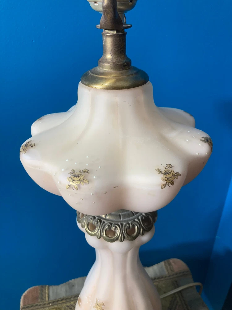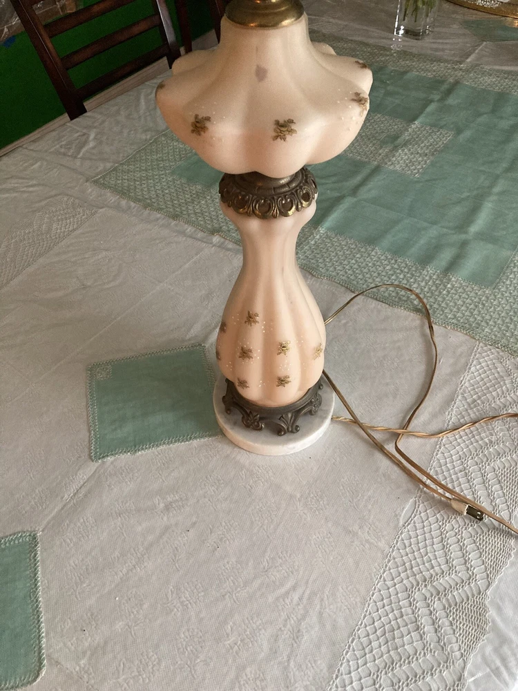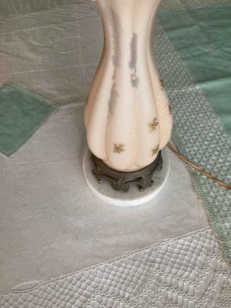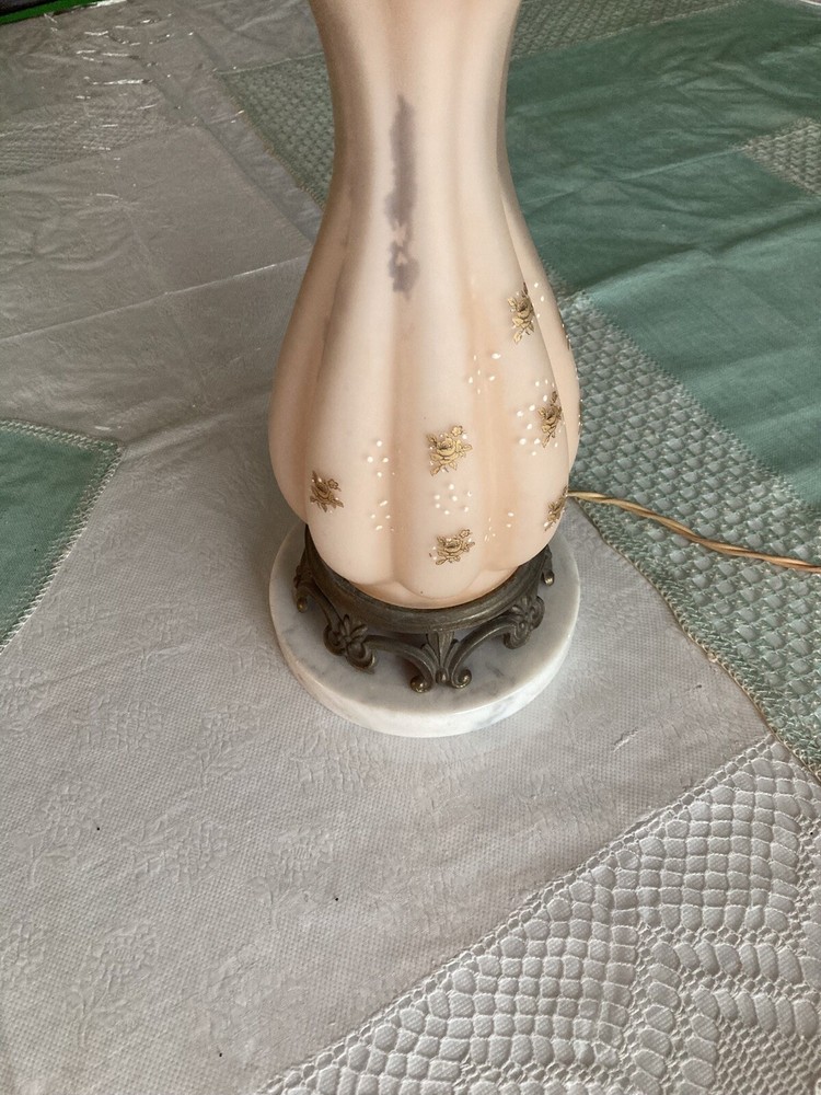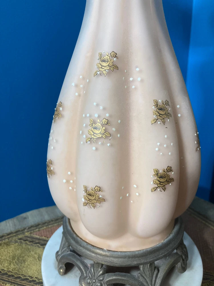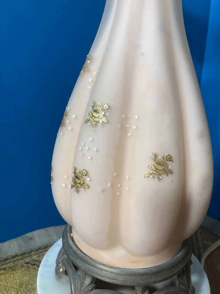 Beautiful Pink Etched Glass Table Lamp with Brass Scrollwork & Marble Base This exquisite table lamp features delicate pressed pink etched glass adorned with gold roses and white relief accents. The lamp is elegantly topped with brass scrollwork and rests on a genuine Carrara marble base. Standing at 23" tall (33" including the shade mount), this lamp’s timeless design and neutral colors make it an ideal addition to any room. **Key Features:** - **Height:** 23" (33" with shade mount) - **Base:** marble - **Design:** Pink etched glass with gold and white relief accents, brass scrollwork - **Condition:** Vintage, with some paint loss on the lamp’s body. The wiring appears to have been rewired in a Mid-Century style but should be checked and adapted to meet current safety codes. This lamp combines elegance with functionality and is perfect for adding a touch of sophistication to your home. **Shipping & Packaging:** The lamp will be carefully packaged and quickly shipped to ensure it arrives safely. Please take a close look at the pictures, and don’t hesitate to reach out if you have any questions .