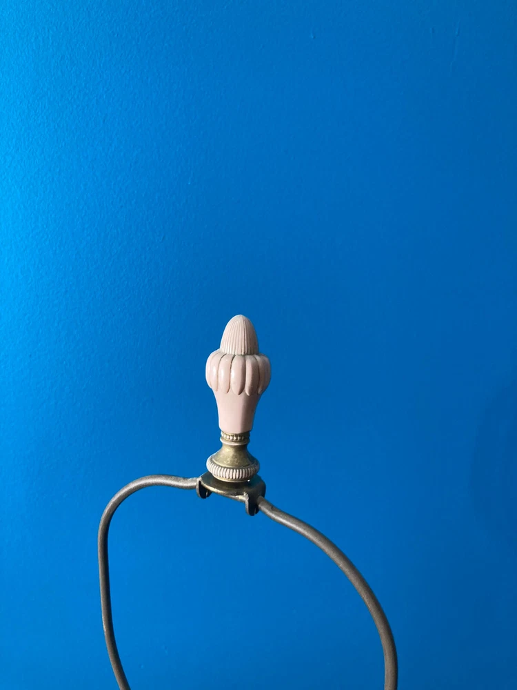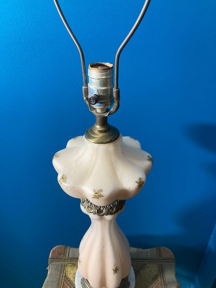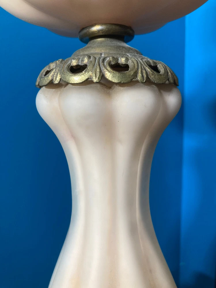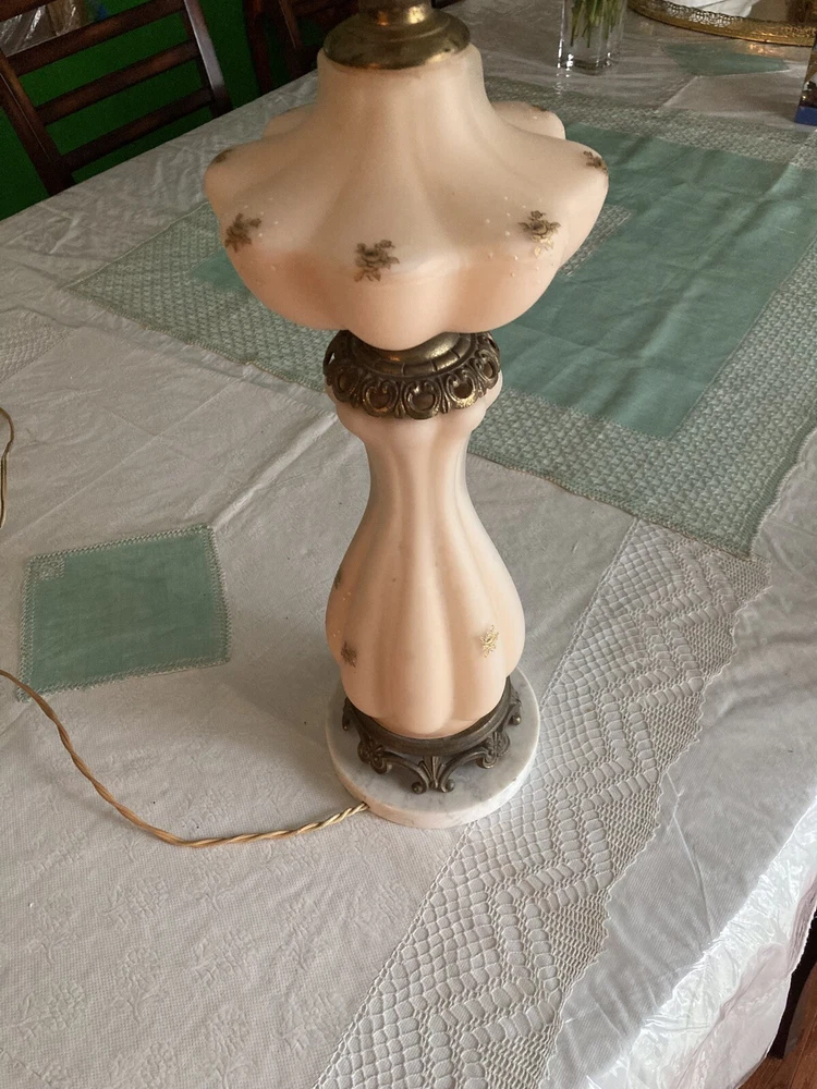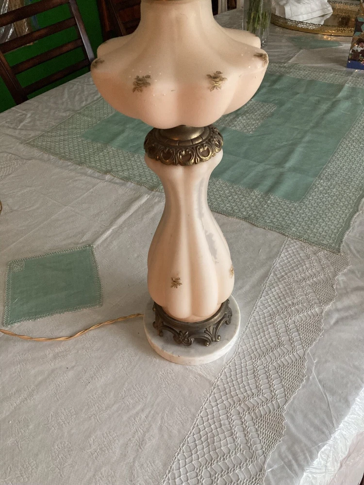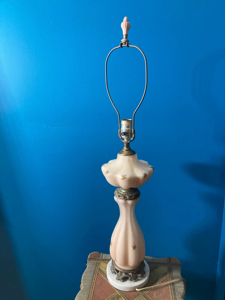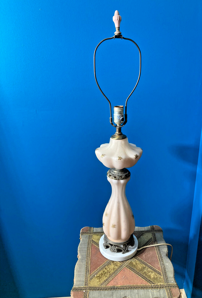 Beautiful Pink Etched Glass Table Lamp with Brass Scrollwork & Marble Base This exquisite table lamp features delicate pressed pink etched glass adorned with gold roses and white relief accents. The lamp is elegantly topped with brass scrollwork and rests on a genuine Carrara marble base. Standing at 23" tall (33" including the shade mount), this lamp’s timeless design and neutral colors make it an ideal addition to any room. **Key Features:** - **Height:** 23" (33" with shade mount) - **Base:** marble - **Design:** Pink etched glass with gold and white relief accents, brass scrollwork - **Condition:** Vintage, with some paint loss on the lamp’s body. The wiring appears to have been rewired in a Mid-Century style but should be checked and adapted to meet current safety codes. This lamp combines elegance with functionality and is perfect for adding a touch of sophistication to your home. **Shipping & Packaging:** The lamp will be carefully packaged and quickly shipped to ensure it arrives safely. Please take a close look at the pictures, and don’t hesitate to reach out if you have any questions .