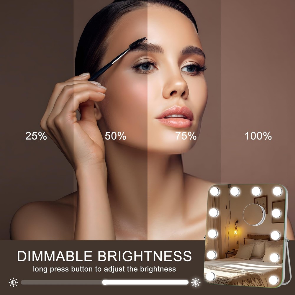 ๐๐ใ๐๐จ๐ฎ๐ง๐ ๐๐จ๐ซ๐ง๐๐ซ ๐๐๐๐ญ๐๐ง๐ ๐ฅ๐ ๐๐๐ฌ๐ข๐ ๐งใThe Hollywood Vanity Mirror with Lights is designed with round corner rectangle white frame, it provides a sophisticated look & the modern feeling. The soft edges add visual beauty and ensure safety. The matte metal frame enhances the mirror's sturdiness and longevity. Lighted make up mirror is a fantastic addition to our vanity. ๐กใ๐๐๐ฃ๐ฎ๐ฌ๐ญ๐๐๐ฅ๐ ๐๐ข๐ ๐ก๐ญ๐ข๐ง๐ ๐๐ง๐ ๐๐ญ๐๐ฉ๐ฅ๐๐ฌ๐ฌ ๐๐ข๐ฆ๐ฆ๐ข๐ง๐ ใ led mirror features 3 lighting modes: cold light, warm light, and natural light. Lighted makeup mirror with 50,000 hours life Max 6000 Lumens high brightness light bulbs, and the brightness can be adjusted 10%-100%. The dimmable brightness and the three lighting modes, which let you adjust the light to your needs. ๐บใ๐๐ฆ๐๐ซ๐ญ ๐๐จ๐ฎ๐๐ก ๐๐จ๐ง๐ญ๐ซ๐จ๐ฅใThis desk mirror with lights has a smart touch button, turn on/off the light by touching the sensor switch, Short press button to change the color modes, long press button to adjust the brightness. Comes with a detachable 3.15" round magnifying mirror, the magnification is great for detailed makeup. ๐ใ๐๐๐ยฐ๐๐จ๐ญ๐๐ญ๐ข๐จ๐งใThe mirror allows for 360-degree rotation, making it easy to swivel to any side and find the perfect angle or position for detailed makeup application. It stays fixed in any position, providing you with the perfect perspective. ๐ใ๐๐๐ซ๐๐๐๐ญ ๐๐ข๐๐ญ ใThis tabletop makeup mirror with lights is very suitable as a gift for girls who love beauty, perfect for birthdays, Valentine's Day, Mother's Day, Christmas, and more. We offer a 12-MONTH Exchange or 30-DAY Money Back Warranty Unconditionally. Please feel free to contact us via Amazon if you have any product problems:)