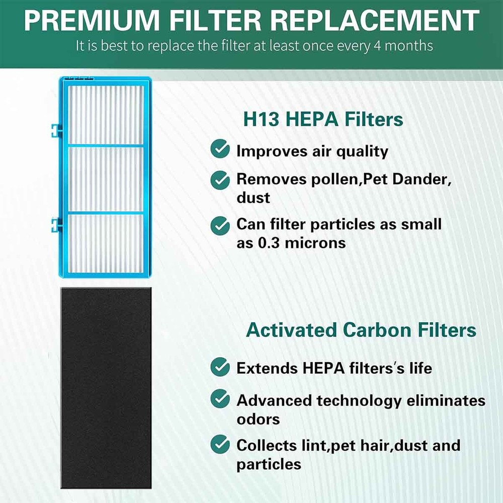 Product features: HEPA-Type filtration effectively removes up to 99% of smoke and pollutants from the airstream; Captures allergens and pollutants as small as 2 microns; Made of Cotton; Powerful carbon air filter replacement is enhanced with baking soda uses charcoal with oxygen to create tiny pores between the carbon atoms to trap odors and pollutants; Helps control odors from pets, bathrooms, garbage, nurseries, and kitchens; For best results change every 8-12 months. Package includes: replacement HEPA filters; replacement carbon booster sheets. Fits Holmes air purifiers models: HAP412, HAP422, HAP424, HAP702, HAP706, HAP716, HAP1702, HAP2400, HAP9240, HAP9241, HAP9242, HAP9243, HAP9412, HAP9413, HAP9414, HAP9415, HAP9422 HAP9423, HAP9424, HAP9425 Also fits Bionaire model air purifier: BAP260, BAP520, BAP815, BAP825, BAP9200, BAP9700. Disclaimer: Not an OEM product. This is not a Holmes original product. This is a generic replacement part compatible with Holmes. Any use of the Holmes brand name, model or part designation for this product is made solely for purposes of demonstrating compatibility. On Feb 13, 2025 at 03:45:19 PST, seller added the following information: