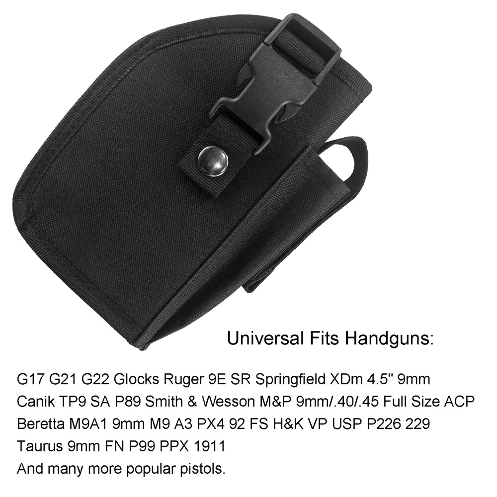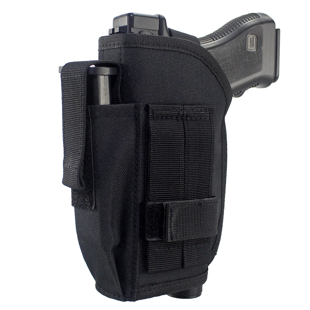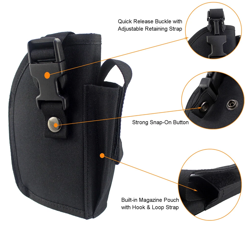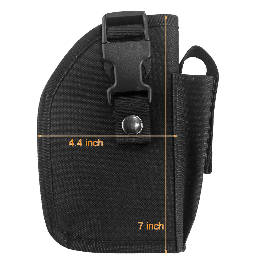 Store Categories Store Categories Bags and Pouch storage bag Tactical Bags Glasses Pouch Wallets Key Bag Molle Pouches Hats Hunting Outdoor Multi Tools Hunting Holster Hunting Pouches Laser and Riflescopes Scope Mounts Hunting Accessories Magazine Pouch Gun Slings & Belts Dog Supplies US STOCK Other Tactical OWB Holster for Gun with Laser or Light Attachment Handgun Belt Holster Product Description Fits handguns with under barrel laser or light attachment: Naturally fits handguns with laser or light NOT extend beyond the barrel, Cut the th re a d to fits laser or light extend beyond the barrel. Fits G17 G21 G22 R uger 9E SR Springfield XDm 4.5" 9mm Canik TP9 SA P89 Smith & Wesson M&P 9mm/.40/.45 Full Size ACP Beretta M9A1 9mm M9 A3 9mm PX4 92 FS H&K VP USP Taurus 9mm FN P99 PPX 1911 and many more pistols. High quality quick release buckle, Snap-On metal button and strong hook & loop straps. Fully adjustable and sturdy hook loop belt keeper for a secure fit to the belt, fit 2 inch heavy duty tactical belt. The extra pouch in the front is very useful for extra mag. Outside the waistband holster. For right hand use. Size: 7”*5.2”*2” (17.5cm*13cm*5cm) Weight: 4.06 oz (115g) Color: Black Package Content: 1 x Belt Holster Shipping Policy Returns Policy About US Shipping Policy Item will be shipped within 1 working days after received payment. USPS : USA 7-15 working days to arrive Air mail : 15-25 working days to arrive (other countries) Express Delivery: 7-10 working days to arrive NOTE: If you need your items urgently, we can ship it out by Express Shipping,but you need to charge extra fees. Returns Policy 1. We fully guarantee our items. All items are in brand new condition unless specified otherwise elsewhere in the description. 2. All returns - defective or otherwise - have to be preauthorized. Please contact us to get an authorization and returning address before sending the item back. All returned items must include original packaging and all accessories. 3. We will pay for the shipping cost of re-sending items to you, while buyers are responsible for the postal cost of returning the items. About US Our office hours are: 9:00 a.m. to 6:00 p.m. (GMT+8), Monday to Friday,And our office is closed on weekends and public holidays. Message replying will sometimes be delayed. If you have any question or needs, please let me know.We will reply to you within 24 hours.